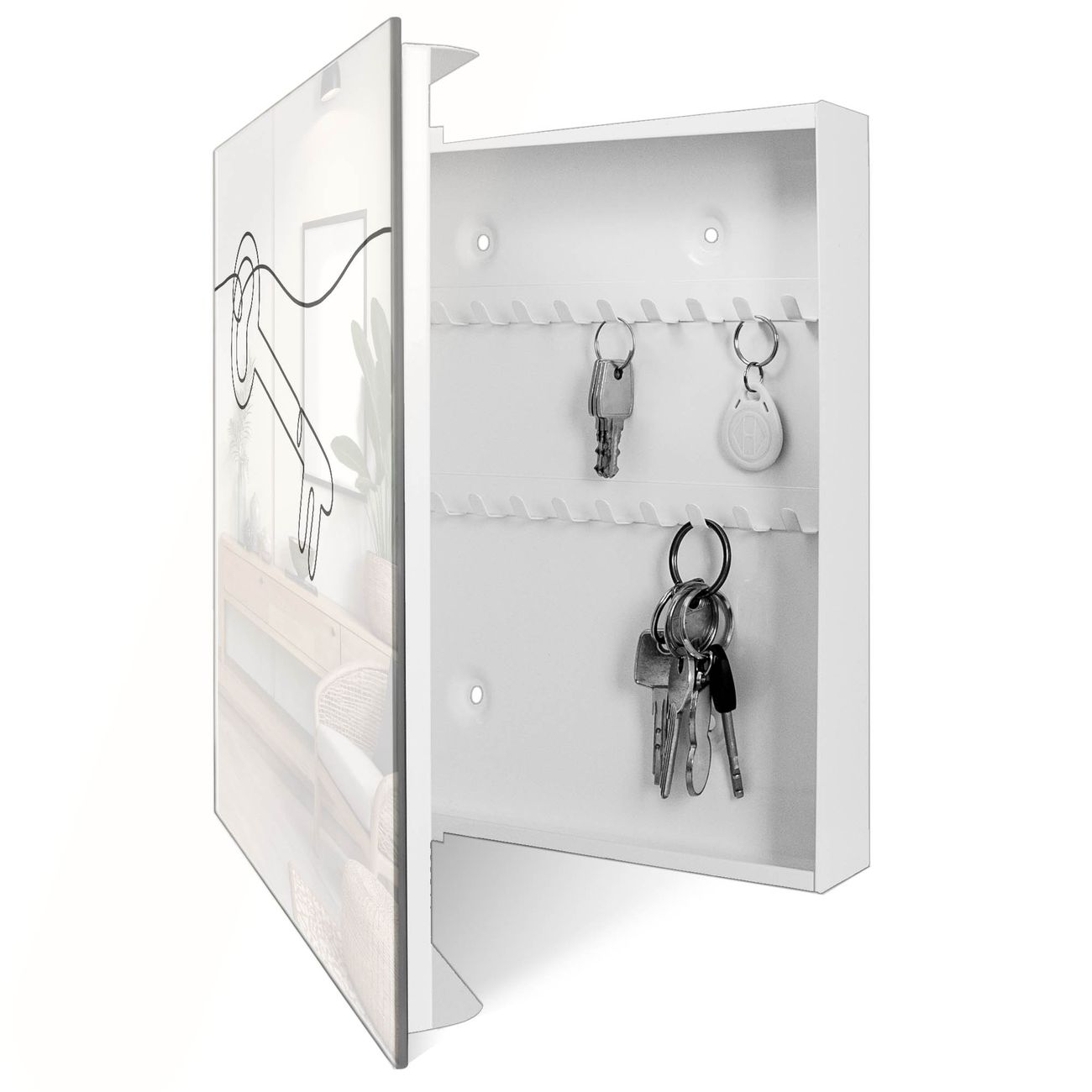 Bringe Ordnung und Eleganz in deinen Eingangsbereich mit dem banjado Schlüsselkasten Motiv Motiv Hausherr Schlüssel 2. Die moderne Schlüsselbox kombiniert funktionales Design mit hochwertiger Verarbeitung und wird so zu einem echten Hingucker in Flur, Büro oder Ferienwohnung. ✅ Stilvolle Schlüsselaufbewahrung mit Glasfront im Motiv Motiv Hausherr Schlüssel 2 Der Design-Schlüsselkasten Motiv Motiv Hausherr Schlüssel 2 bietet Platz für bis zu 50 Schlüssel, die auf 5 stabilen Reihen mit je 10 Haken übersichtlich verstaut werden. Mit seinen kompakten Maßen von 30 x 30 x 5 cm passt die Schlüsselbox perfekt auch in kleinere Räume. Der weiß lackierte Stahlkorpus mit rechts angeschlagenem Türscharnier harmoniert mit der Glasfront und fügt sich nahtlos in jedes Wohnambiente ein. Ob als Schlüsselorganizer für Zuhause oder als praktische Lösung für Büros, Praxen und Gewerbe, der banjado Schlüsselkasten sorgt für Ordnung und Übersicht. Dank der magnetischen, mit Kreidestiften beschreibbaren Glasfront kannst du Notizen anheften oder Termine direkt auf der Oberfläche festhalten. Die Schlüsselbox Motiv Motiv Hausherr Schlüssel 2 zur Wandmontage wird inklusive Befestigungsmaterial geliefert und ist schnell angebracht. So hast du deine Schlüssel jederzeit griffbereit und zugleich stilvoll verstaut. Mit diesem banjado Schlüsselkasten Motiv Motiv Hausherr Schlüssel 2 kombinierst du praktische Aufbewahrung mit stilvollem Wohndesign. Ob privat oder geschäftlich, die Schlüsselbox sorgt für mehr Ordnung, Übersicht und ein wohnliches Ambiente.Vorteile im Überblick