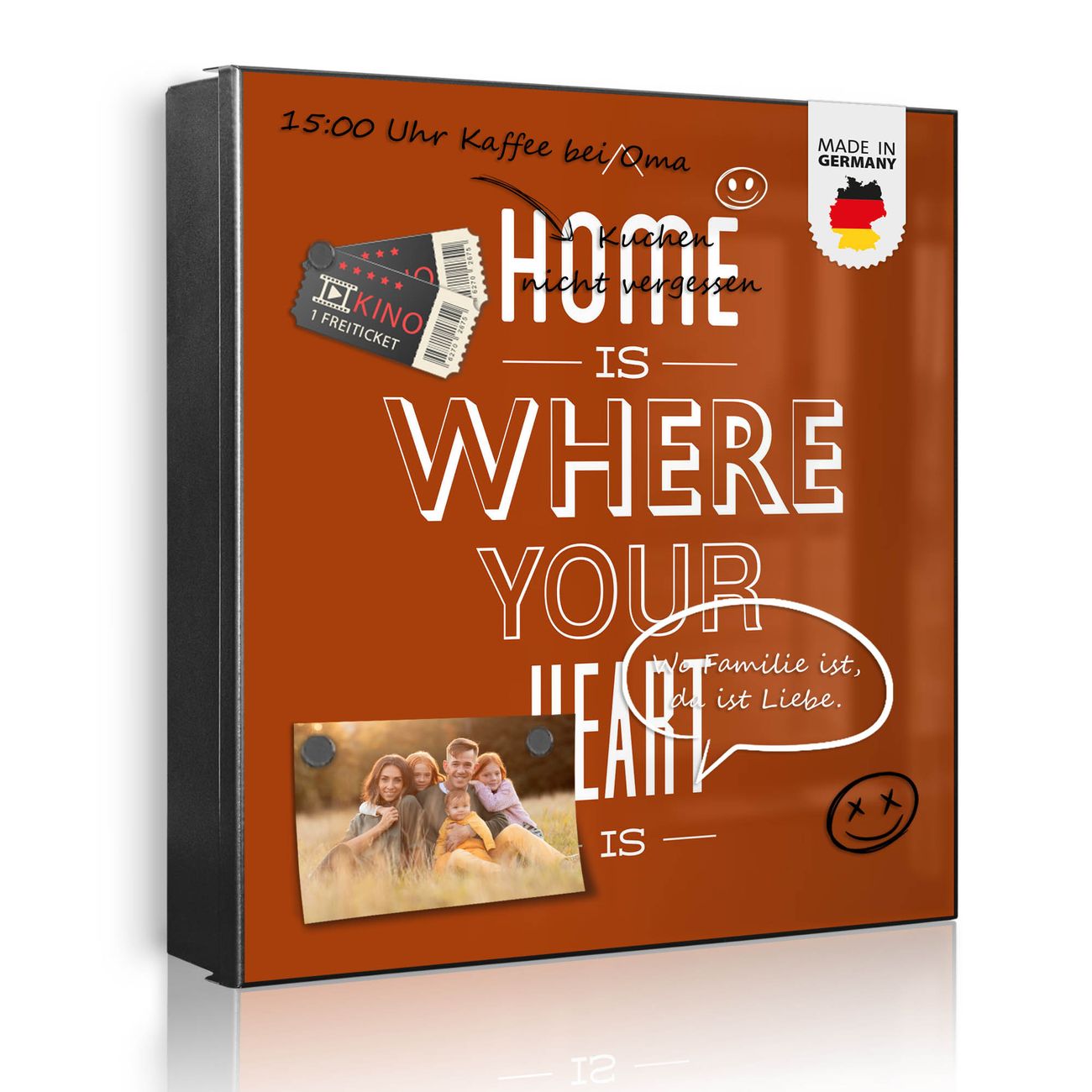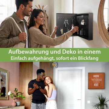 Bringe Ordnung und Eleganz in deinen Eingangsbereich mit dem banjado Schlüsselkasten Motiv Motiv Home is where your Heart is 2. Die moderne Schlüsselbox kombiniert funktionales Design mit hochwertiger Verarbeitung und wird so zu einem echten Hingucker in Flur, Büro oder Ferienwohnung. ✅ Stilvolle Schlüsselaufbewahrung mit Motiv Motiv Home is where your Heart is 2 Der Design-Schlüsselkasten Motiv Motiv Home is where your Heart is 2 bietet Platz für bis zu 32 Schlüssel, die auf 4 stabilen Reihen mit je 8 Haken übersichtlich verstaut werden. Mit seinen kompakten Maßen von 30 x 30 x 5 cm passt die Schlüsselbox perfekt auch in kleinere Räume. Der schwarz lackierte Stahlkorpus mit rechts angeschlagenem Türscharnier harmoniert mit gedruckten Folie auf der Front und fügt sich nahtlos in jedes Wohnambiente ein. Ob als Schlüsselorganizer für Zuhause oder als praktische Lösung für Büros, Praxen und Gewerbe, der banjado Schlüsselkasten sorgt für Ordnung und Übersicht. Dank der magnetischen, mit Kreidestiften beschreibbaren Folie auf der Front kannst du Notizen anheften oder Termine direkt auf der Oberfläche festhalten. Die Schlüsselbox Motiv Motiv Home is where your Heart is 2 zur Wandmontage wird inklusive Befestigungsmaterial geliefert und ist schnell angebracht. So hast du deine Schlüssel jederzeit griffbereit und zugleich stilvoll verstaut. Mit diesem banjado Schlüsselkasten Motiv Motiv Home is where your Heart is 2 kombinierst du praktische Aufbewahrung mit stilvollem Wohndesign. Ob privat oder geschäftlich, die Schlüsselbox sorgt für mehr Ordnung, Übersicht und ein wohnliches Ambiente.Vorteile im Überblick