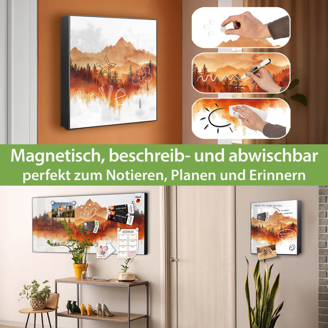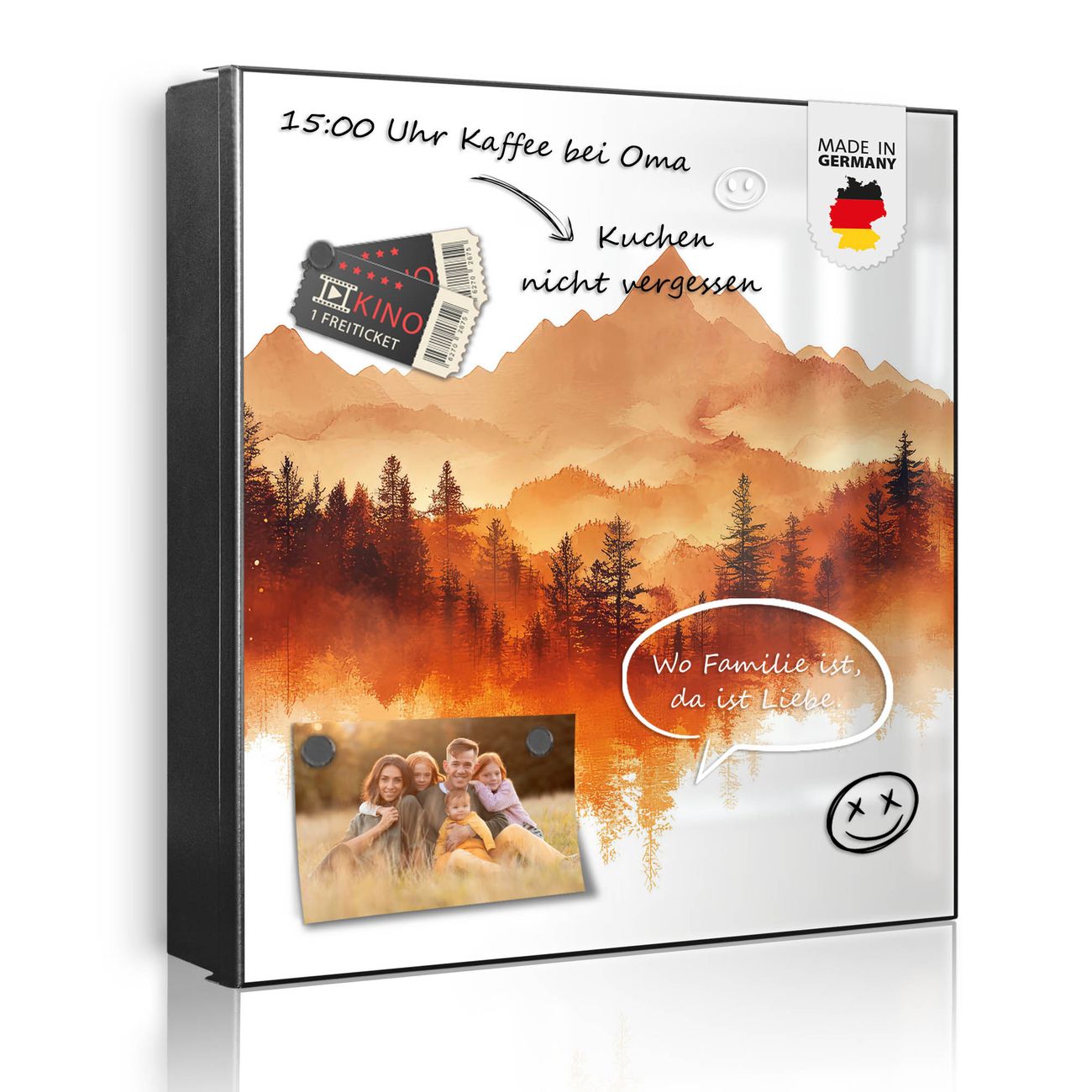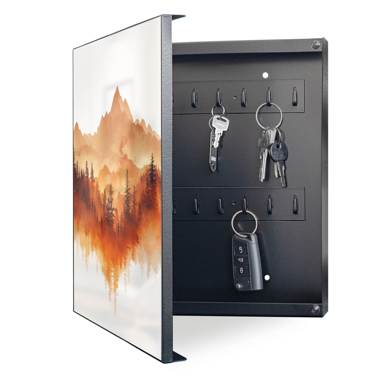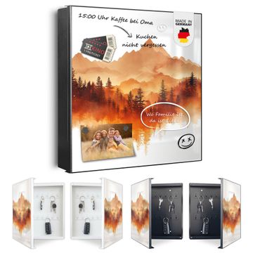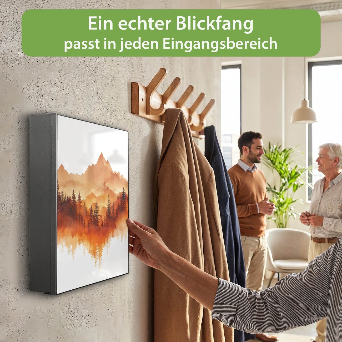 Bringe Ordnung und Eleganz in deinen Eingangsbereich mit dem banjado Schlüsselkasten Motiv Motiv Herbstliche Berglandschaft. Die moderne Schlüsselbox kombiniert funktionales Design mit hochwertiger Verarbeitung und wird so zu einem echten Hingucker in Flur, Büro oder Ferienwohnung. ✅ Stilvolle Schlüsselaufbewahrung mit Motiv Motiv Herbstliche Berglandschaft Der Design-Schlüsselkasten Motiv Motiv Herbstliche Berglandschaft bietet Platz für bis zu 32 Schlüssel, die auf 4 stabilen Reihen mit je 8 Haken übersichtlich verstaut werden. Mit seinen kompakten Maßen von 30 x 30 x 5 cm passt die Schlüsselbox perfekt auch in kleinere Räume. Der schwarz lackierte Stahlkorpus mit links angeschlagenem Türscharnier harmoniert mit gedruckten Folie auf der Front und fügt sich nahtlos in jedes Wohnambiente ein. Ob als Schlüsselorganizer für Zuhause oder als praktische Lösung für Büros, Praxen und Gewerbe, der banjado Schlüsselkasten sorgt für Ordnung und Übersicht. Dank der magnetischen, mit Kreidestiften beschreibbaren Folie auf der Front kannst du Notizen anheften oder Termine direkt auf der Oberfläche festhalten. Die Schlüsselbox Motiv Motiv Herbstliche Berglandschaft zur Wandmontage wird inklusive Befestigungsmaterial geliefert und ist schnell angebracht. So hast du deine Schlüssel jederzeit griffbereit und zugleich stilvoll verstaut. Mit diesem banjado Schlüsselkasten Motiv Motiv Herbstliche Berglandschaft kombinierst du praktische Aufbewahrung mit stilvollem Wohndesign. Ob privat oder geschäftlich, die Schlüsselbox sorgt für mehr Ordnung, Übersicht und ein wohnliches Ambiente.Vorteile im Überblick