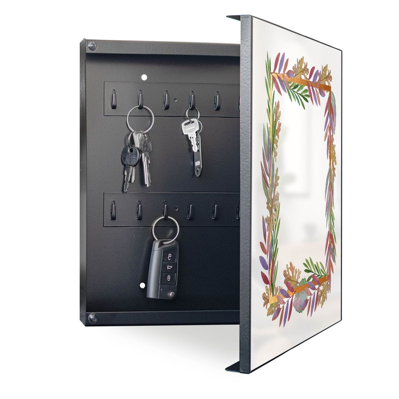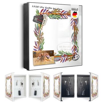 Bringe Ordnung und Eleganz in deinen Eingangsbereich mit dem banjado Schlüsselkasten Motiv Motiv Herbstliche Blattgirlande. Die moderne Schlüsselbox kombiniert funktionales Design mit hochwertiger Verarbeitung und wird so zu einem echten Hingucker in Flur, Büro oder Ferienwohnung. ✅ Stilvolle Schlüsselaufbewahrung mit Motiv Motiv Herbstliche Blattgirlande Der Design-Schlüsselkasten Motiv Motiv Herbstliche Blattgirlande bietet Platz für bis zu 32 Schlüssel, die auf 4 stabilen Reihen mit je 8 Haken übersichtlich verstaut werden. Mit seinen kompakten Maßen von 30 x 30 x 5 cm passt die Schlüsselbox perfekt auch in kleinere Räume. Der schwarz lackierte Stahlkorpus mit rechts angeschlagenem Türscharnier harmoniert mit gedruckten Folie auf der Front und fügt sich nahtlos in jedes Wohnambiente ein. Ob als Schlüsselorganizer für Zuhause oder als praktische Lösung für Büros, Praxen und Gewerbe, der banjado Schlüsselkasten sorgt für Ordnung und Übersicht. Dank der magnetischen, mit Kreidestiften beschreibbaren Folie auf der Front kannst du Notizen anheften oder Termine direkt auf der Oberfläche festhalten. Die Schlüsselbox Motiv Motiv Herbstliche Blattgirlande zur Wandmontage wird inklusive Befestigungsmaterial geliefert und ist schnell angebracht. So hast du deine Schlüssel jederzeit griffbereit und zugleich stilvoll verstaut. Mit diesem banjado Schlüsselkasten Motiv Motiv Herbstliche Blattgirlande kombinierst du praktische Aufbewahrung mit stilvollem Wohndesign. Ob privat oder geschäftlich, die Schlüsselbox sorgt für mehr Ordnung, Übersicht und ein wohnliches Ambiente.Vorteile im Überblick