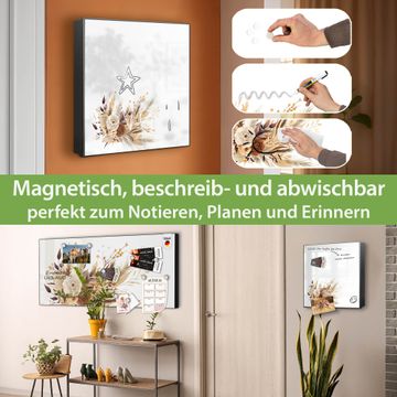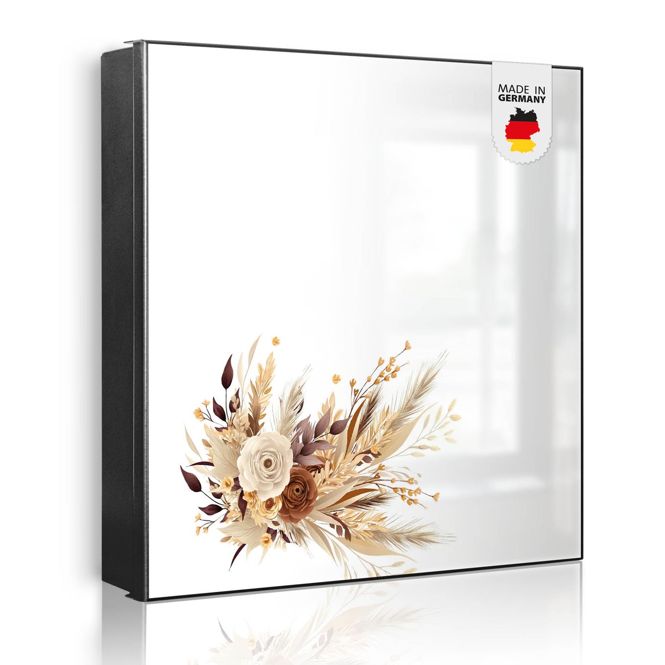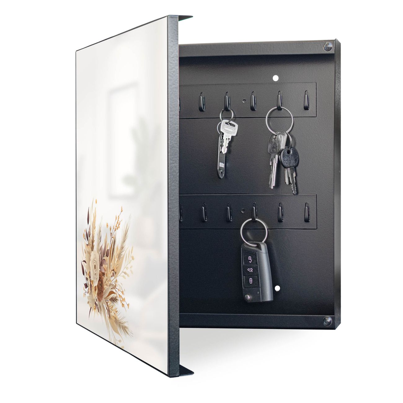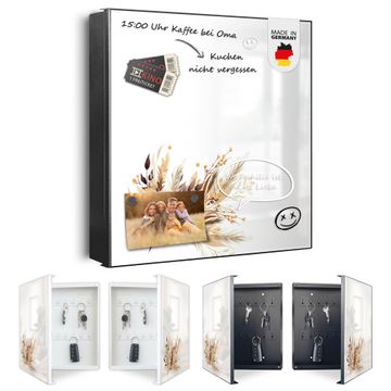 Bringe Ordnung und Eleganz in deinen Eingangsbereich mit dem banjado Schlüsselkasten Motiv Motiv Herbstlicher Blumenstrauß. Die moderne Schlüsselbox kombiniert funktionales Design mit hochwertiger Verarbeitung und wird so zu einem echten Hingucker in Flur, Büro oder Ferienwohnung. ✅ Stilvolle Schlüsselaufbewahrung mit Motiv Motiv Herbstlicher Blumenstrauß Der Design-Schlüsselkasten Motiv Motiv Herbstlicher Blumenstrauß bietet Platz für bis zu 32 Schlüssel, die auf 4 stabilen Reihen mit je 8 Haken übersichtlich verstaut werden. Mit seinen kompakten Maßen von 30 x 30 x 5 cm passt die Schlüsselbox perfekt auch in kleinere Räume. Der schwarz lackierte Stahlkorpus mit links angeschlagenem Türscharnier harmoniert mit gedruckten Folie auf der Front und fügt sich nahtlos in jedes Wohnambiente ein. Ob als Schlüsselorganizer für Zuhause oder als praktische Lösung für Büros, Praxen und Gewerbe, der banjado Schlüsselkasten sorgt für Ordnung und Übersicht. Dank der magnetischen, mit Kreidestiften beschreibbaren Folie auf der Front kannst du Notizen anheften oder Termine direkt auf der Oberfläche festhalten. Die Schlüsselbox Motiv Motiv Herbstlicher Blumenstrauß zur Wandmontage wird inklusive Befestigungsmaterial geliefert und ist schnell angebracht. So hast du deine Schlüssel jederzeit griffbereit und zugleich stilvoll verstaut. Mit diesem banjado Schlüsselkasten Motiv Motiv Herbstlicher Blumenstrauß kombinierst du praktische Aufbewahrung mit stilvollem Wohndesign. Ob privat oder geschäftlich, die Schlüsselbox sorgt für mehr Ordnung, Übersicht und ein wohnliches Ambiente.Vorteile im Überblick