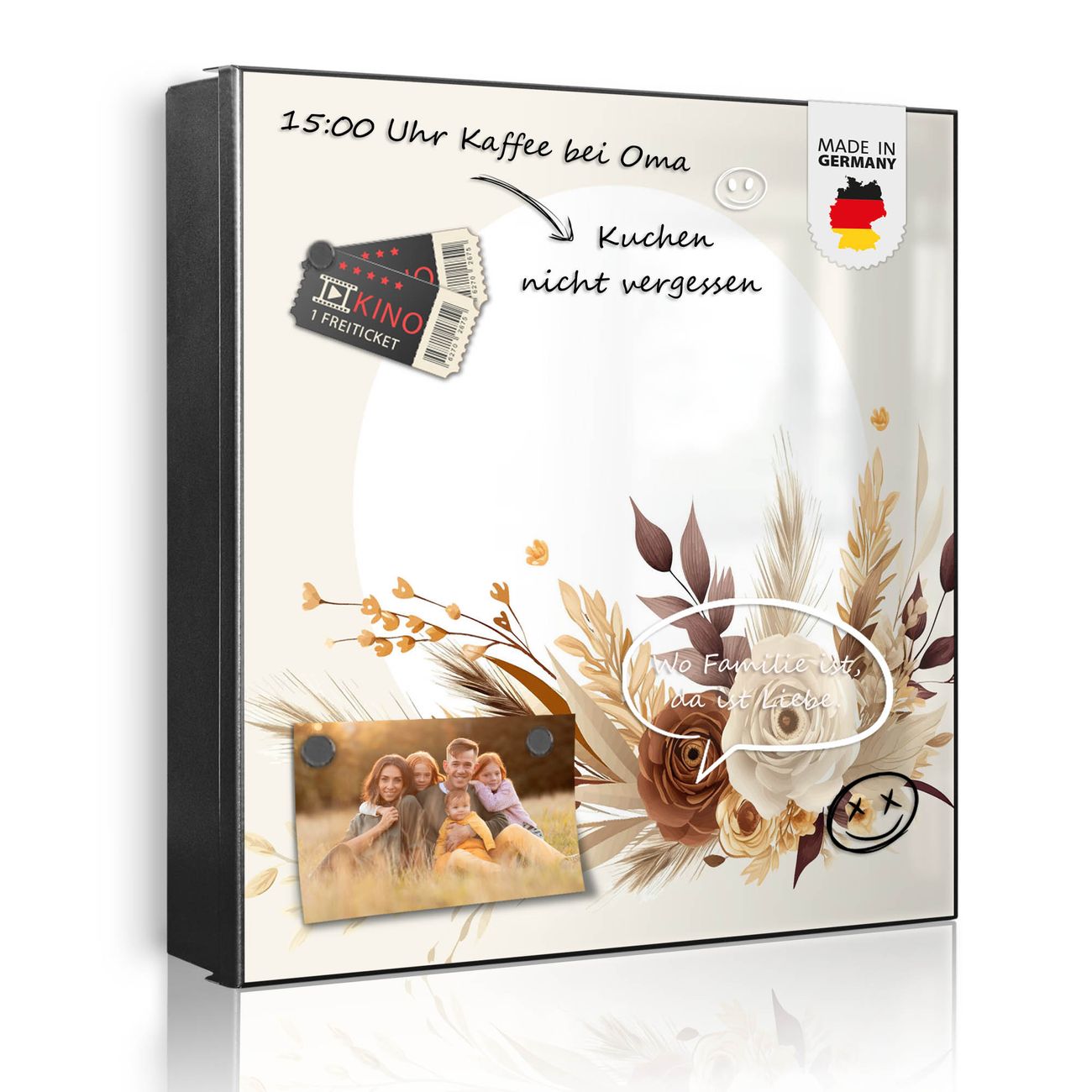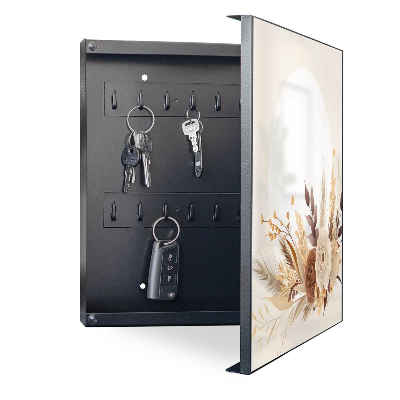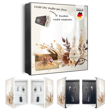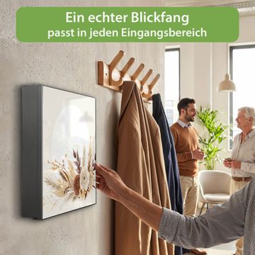 Bringe Ordnung und Eleganz in deinen Eingangsbereich mit dem banjado Schlüsselkasten Motiv Motiv Herbstliches Blumenarrangement. Die moderne Schlüsselbox kombiniert funktionales Design mit hochwertiger Verarbeitung und wird so zu einem echten Hingucker in Flur, Büro oder Ferienwohnung. ✅ Stilvolle Schlüsselaufbewahrung mit Motiv Motiv Herbstliches Blumenarrangement Der Design-Schlüsselkasten Motiv Motiv Herbstliches Blumenarrangement bietet Platz für bis zu 32 Schlüssel, die auf 4 stabilen Reihen mit je 8 Haken übersichtlich verstaut werden. Mit seinen kompakten Maßen von 30 x 30 x 5 cm passt die Schlüsselbox perfekt auch in kleinere Räume. Der schwarz lackierte Stahlkorpus mit rechts angeschlagenem Türscharnier harmoniert mit gedruckten Folie auf der Front und fügt sich nahtlos in jedes Wohnambiente ein. Ob als Schlüsselorganizer für Zuhause oder als praktische Lösung für Büros, Praxen und Gewerbe, der banjado Schlüsselkasten sorgt für Ordnung und Übersicht. Dank der magnetischen, mit Kreidestiften beschreibbaren Folie auf der Front kannst du Notizen anheften oder Termine direkt auf der Oberfläche festhalten. Die Schlüsselbox Motiv Motiv Herbstliches Blumenarrangement zur Wandmontage wird inklusive Befestigungsmaterial geliefert und ist schnell angebracht. So hast du deine Schlüssel jederzeit griffbereit und zugleich stilvoll verstaut. Mit diesem banjado Schlüsselkasten Motiv Motiv Herbstliches Blumenarrangement kombinierst du praktische Aufbewahrung mit stilvollem Wohndesign. Ob privat oder geschäftlich, die Schlüsselbox sorgt für mehr Ordnung, Übersicht und ein wohnliches Ambiente.Vorteile im Überblick