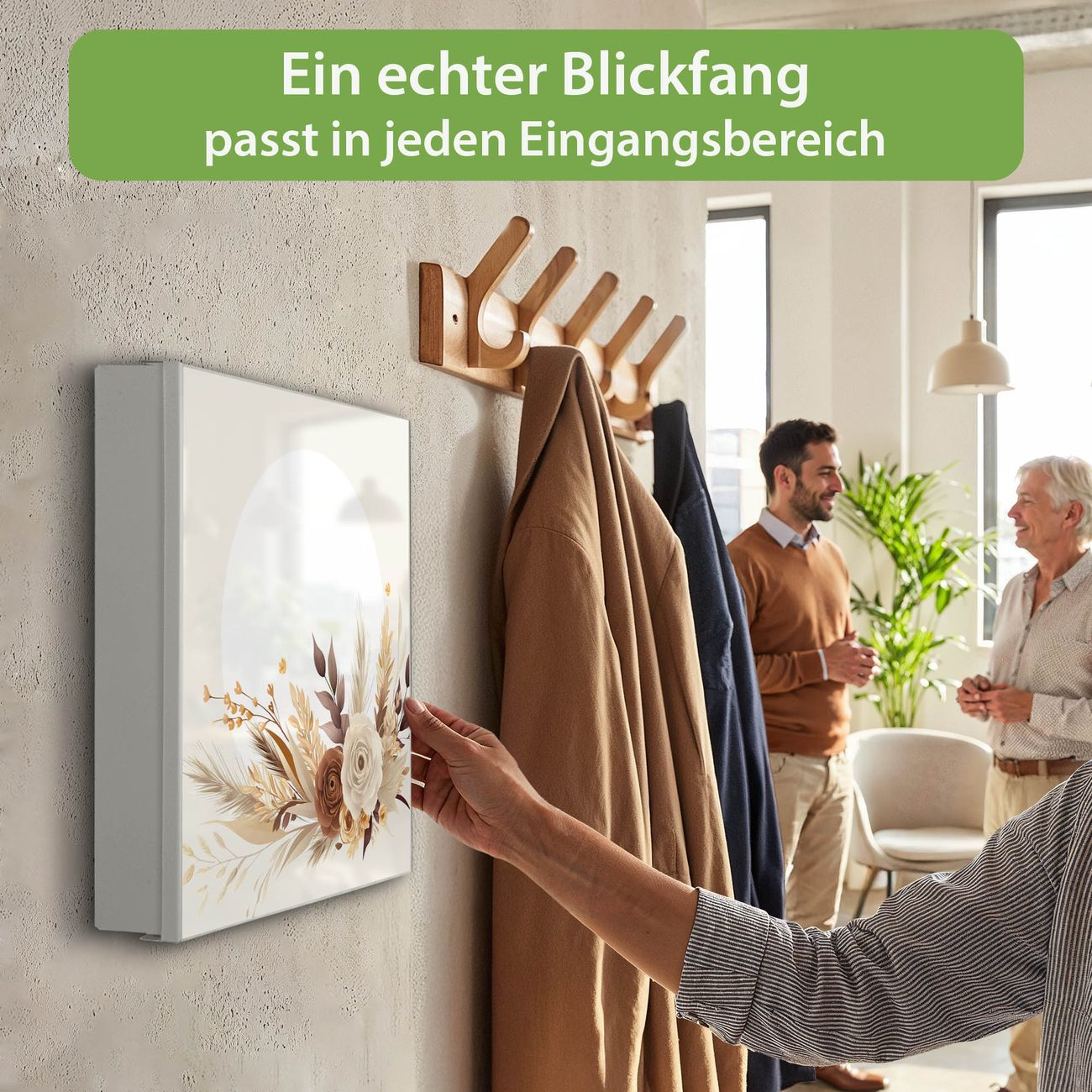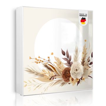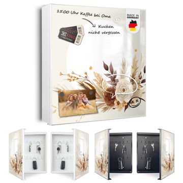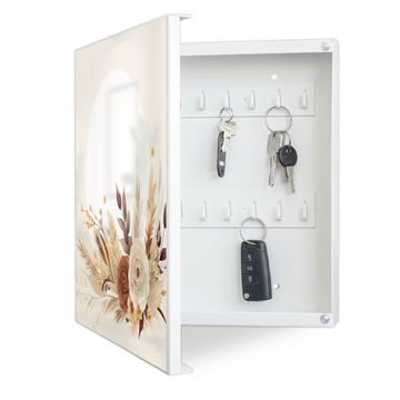 Bringe Ordnung und Eleganz in deinen Eingangsbereich mit dem banjado Schlüsselkasten Motiv Motiv Herbstliches Blumenarrangement. Die moderne Schlüsselbox kombiniert funktionales Design mit hochwertiger Verarbeitung und wird so zu einem echten Hingucker in Flur, Büro oder Ferienwohnung. ✅ Stilvolle Schlüsselaufbewahrung mit Motiv Motiv Herbstliches Blumenarrangement Der Design-Schlüsselkasten Motiv Motiv Herbstliches Blumenarrangement bietet Platz für bis zu 32 Schlüssel, die auf 4 stabilen Reihen mit je 8 Haken übersichtlich verstaut werden. Mit seinen kompakten Maßen von 30 x 30 x 5 cm passt die Schlüsselbox perfekt auch in kleinere Räume. Der weiß lackierte Stahlkorpus mit links angeschlagenem Türscharnier harmoniert mit gedruckten Folie auf der Front und fügt sich nahtlos in jedes Wohnambiente ein. Ob als Schlüsselorganizer für Zuhause oder als praktische Lösung für Büros, Praxen und Gewerbe, der banjado Schlüsselkasten sorgt für Ordnung und Übersicht. Dank der magnetischen, mit Kreidestiften beschreibbaren Folie auf der Front kannst du Notizen anheften oder Termine direkt auf der Oberfläche festhalten. Die Schlüsselbox Motiv Motiv Herbstliches Blumenarrangement zur Wandmontage wird inklusive Befestigungsmaterial geliefert und ist schnell angebracht. So hast du deine Schlüssel jederzeit griffbereit und zugleich stilvoll verstaut. Mit diesem banjado Schlüsselkasten Motiv Motiv Herbstliches Blumenarrangement kombinierst du praktische Aufbewahrung mit stilvollem Wohndesign. Ob privat oder geschäftlich, die Schlüsselbox sorgt für mehr Ordnung, Übersicht und ein wohnliches Ambiente.Vorteile im Überblick