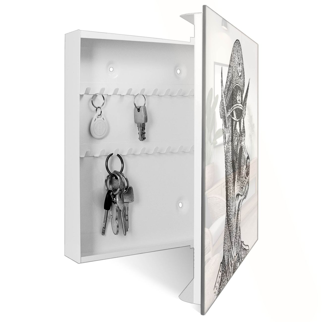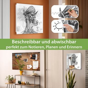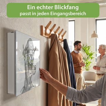 Bringe Ordnung und Eleganz in deinen Eingangsbereich mit dem banjado Schlüsselkasten Motiv Motiv Herr Hund 2. Die moderne Schlüsselbox kombiniert funktionales Design mit hochwertiger Verarbeitung und wird so zu einem echten Hingucker in Flur, Büro oder Ferienwohnung. ✅ Stilvolle Schlüsselaufbewahrung mit Glasfront im Motiv Motiv Herr Hund 2 Der Design-Schlüsselkasten Motiv Motiv Herr Hund 2 bietet Platz für bis zu 50 Schlüssel, die auf 5 stabilen Reihen mit je 10 Haken übersichtlich verstaut werden. Mit seinen kompakten Maßen von 30 x 30 x 5 cm passt die Schlüsselbox perfekt auch in kleinere Räume. Der weiß lackierte Stahlkorpus mit rechts angeschlagenem Türscharnier harmoniert mit der Glasfront und fügt sich nahtlos in jedes Wohnambiente ein. Ob als Schlüsselorganizer für Zuhause oder als praktische Lösung für Büros, Praxen und Gewerbe, der banjado Schlüsselkasten sorgt für Ordnung und Übersicht. Dank der magnetischen, mit Kreidestiften beschreibbaren Glasfront kannst du Notizen anheften oder Termine direkt auf der Oberfläche festhalten. Die Schlüsselbox Motiv Motiv Herr Hund 2 zur Wandmontage wird inklusive Befestigungsmaterial geliefert und ist schnell angebracht. So hast du deine Schlüssel jederzeit griffbereit und zugleich stilvoll verstaut. Mit diesem banjado Schlüsselkasten Motiv Motiv Herr Hund 2 kombinierst du praktische Aufbewahrung mit stilvollem Wohndesign. Ob privat oder geschäftlich, die Schlüsselbox sorgt für mehr Ordnung, Übersicht und ein wohnliches Ambiente.Vorteile im Überblick