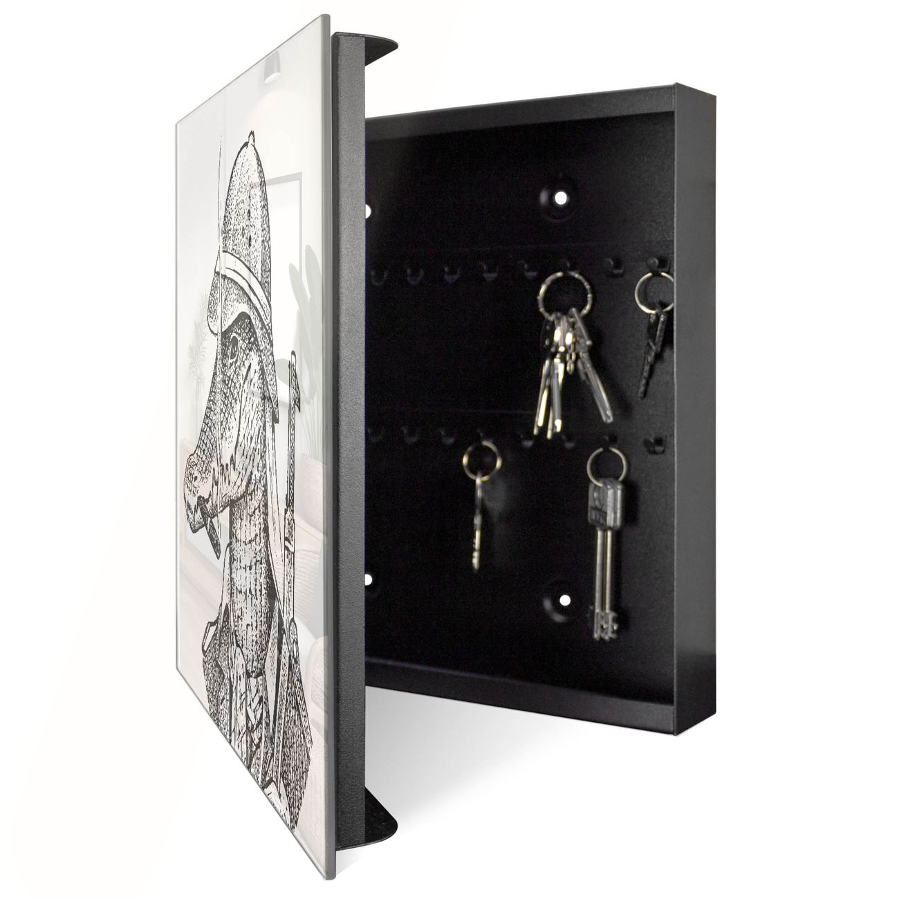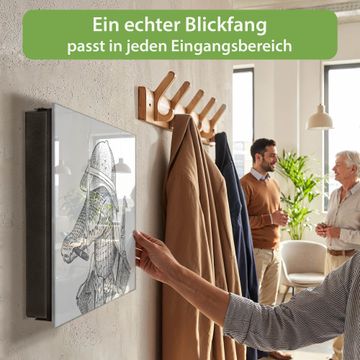 Bringe Ordnung und Eleganz in deinen Eingangsbereich mit dem banjado Schlüsselkasten Motiv Motiv Herr Krokodil 2. Die moderne Schlüsselbox kombiniert funktionales Design mit hochwertiger Verarbeitung und wird so zu einem echten Hingucker in Flur, Büro oder Ferienwohnung. ✅ Stilvolle Schlüsselaufbewahrung mit Glasfront im Motiv Motiv Herr Krokodil 2 Der Design-Schlüsselkasten Motiv Motiv Herr Krokodil 2 bietet Platz für bis zu 50 Schlüssel, die auf 5 stabilen Reihen mit je 10 Haken übersichtlich verstaut werden. Mit seinen kompakten Maßen von 30 x 30 x 5 cm passt die Schlüsselbox perfekt auch in kleinere Räume. Der schwarz lackierte Stahlkorpus mit rechts angeschlagenem Türscharnier harmoniert mit der Glasfront und fügt sich nahtlos in jedes Wohnambiente ein. Ob als Schlüsselorganizer für Zuhause oder als praktische Lösung für Büros, Praxen und Gewerbe, der banjado Schlüsselkasten sorgt für Ordnung und Übersicht. Dank der magnetischen, mit Kreidestiften beschreibbaren Glasfront kannst du Notizen anheften oder Termine direkt auf der Oberfläche festhalten. Die Schlüsselbox Motiv Motiv Herr Krokodil 2 zur Wandmontage wird inklusive Befestigungsmaterial geliefert und ist schnell angebracht. So hast du deine Schlüssel jederzeit griffbereit und zugleich stilvoll verstaut. Mit diesem banjado Schlüsselkasten Motiv Motiv Herr Krokodil 2 kombinierst du praktische Aufbewahrung mit stilvollem Wohndesign. Ob privat oder geschäftlich, die Schlüsselbox sorgt für mehr Ordnung, Übersicht und ein wohnliches Ambiente.Vorteile im Überblick