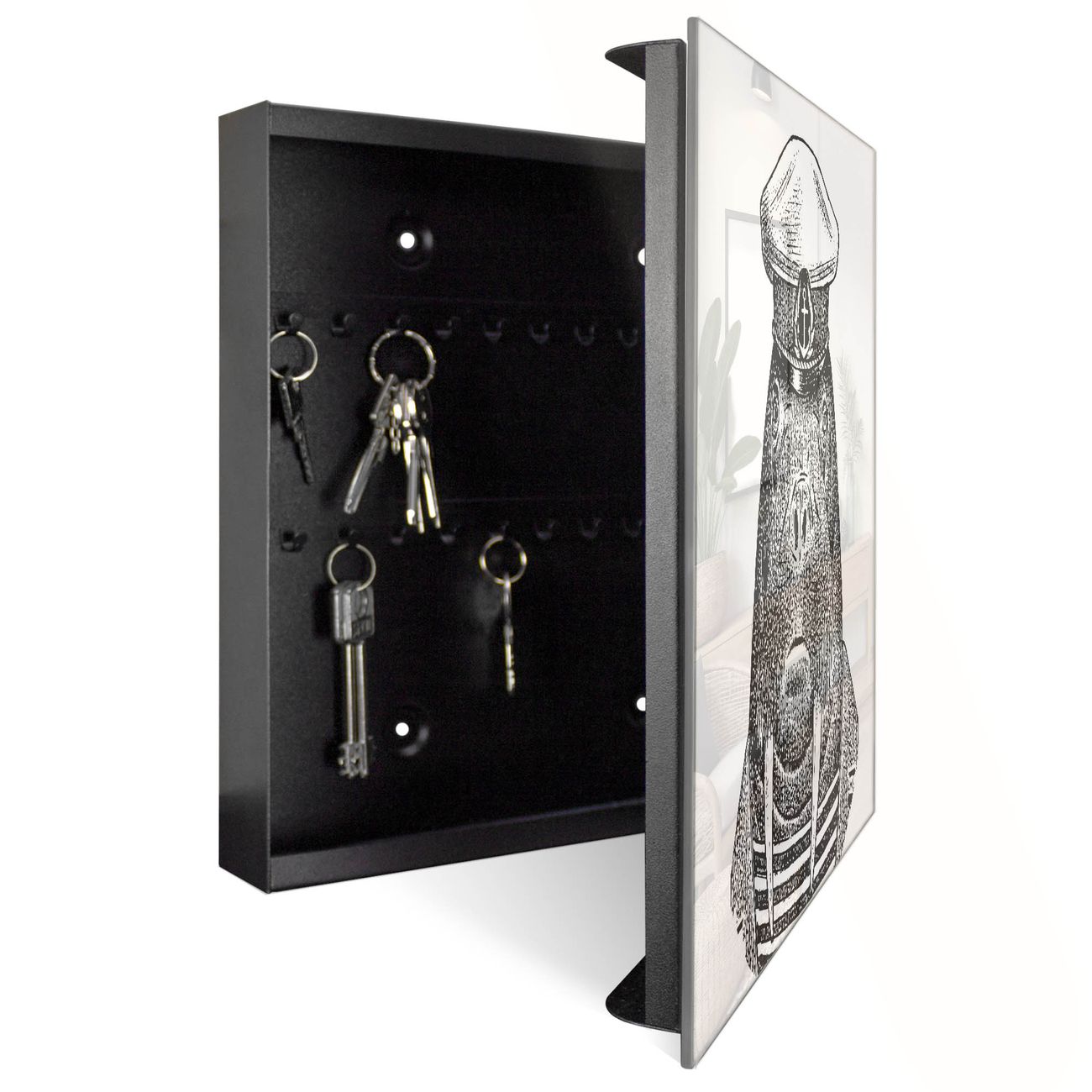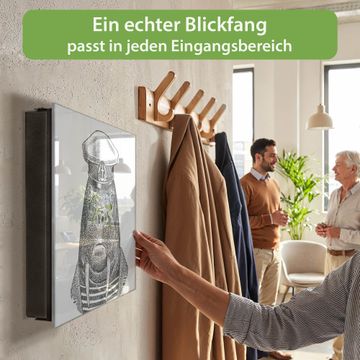 Bringe Ordnung und Eleganz in deinen Eingangsbereich mit dem banjado Schlüsselkasten Motiv Motiv Herr Walross 2. Die moderne Schlüsselbox kombiniert funktionales Design mit hochwertiger Verarbeitung und wird so zu einem echten Hingucker in Flur, Büro oder Ferienwohnung. ✅ Stilvolle Schlüsselaufbewahrung mit Glasfront im Motiv Motiv Herr Walross 2 Der Design-Schlüsselkasten Motiv Motiv Herr Walross 2 bietet Platz für bis zu 50 Schlüssel, die auf 5 stabilen Reihen mit je 10 Haken übersichtlich verstaut werden. Mit seinen kompakten Maßen von 30 x 30 x 5 cm passt die Schlüsselbox perfekt auch in kleinere Räume. Der schwarz lackierte Stahlkorpus mit rechts angeschlagenem Türscharnier harmoniert mit der Glasfront und fügt sich nahtlos in jedes Wohnambiente ein. Ob als Schlüsselorganizer für Zuhause oder als praktische Lösung für Büros, Praxen und Gewerbe, der banjado Schlüsselkasten sorgt für Ordnung und Übersicht. Dank der magnetischen, mit Kreidestiften beschreibbaren Glasfront kannst du Notizen anheften oder Termine direkt auf der Oberfläche festhalten. Die Schlüsselbox Motiv Motiv Herr Walross 2 zur Wandmontage wird inklusive Befestigungsmaterial geliefert und ist schnell angebracht. So hast du deine Schlüssel jederzeit griffbereit und zugleich stilvoll verstaut. Mit diesem banjado Schlüsselkasten Motiv Motiv Herr Walross 2 kombinierst du praktische Aufbewahrung mit stilvollem Wohndesign. Ob privat oder geschäftlich, die Schlüsselbox sorgt für mehr Ordnung, Übersicht und ein wohnliches Ambiente.Vorteile im Überblick