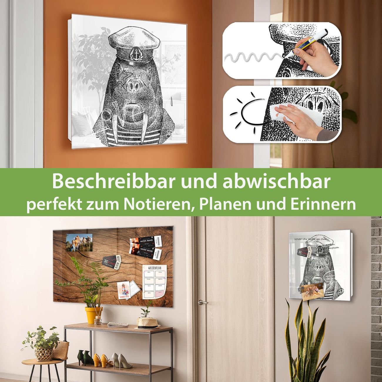Bringe Ordnung und Eleganz in deinen Eingangsbereich mit dem banjado Schlüsselkasten Motiv Motiv Herr Walross 2. Die moderne Schlüsselbox kombiniert funktionales Design mit hochwertiger Verarbeitung und wird so zu einem echten Hingucker in Flur, Büro oder Ferienwohnung. ✅ Stilvolle Schlüsselaufbewahrung mit Glasfront im Motiv Motiv Herr Walross 2 Der Design-Schlüsselkasten Motiv Motiv Herr Walross 2 bietet Platz für bis zu 50 Schlüssel, die auf 5 stabilen Reihen mit je 10 Haken übersichtlich verstaut werden. Mit seinen kompakten Maßen von 30 x 30 x 5 cm passt die Schlüsselbox perfekt auch in kleinere Räume. Der weiß lackierte Stahlkorpus mit rechts angeschlagenem Türscharnier harmoniert mit der Glasfront und fügt sich nahtlos in jedes Wohnambiente ein. Ob als Schlüsselorganizer für Zuhause oder als praktische Lösung für Büros, Praxen und Gewerbe, der banjado Schlüsselkasten sorgt für Ordnung und Übersicht. Dank der magnetischen, mit Kreidestiften beschreibbaren Glasfront kannst du Notizen anheften oder Termine direkt auf der Oberfläche festhalten. Die Schlüsselbox Motiv Motiv Herr Walross 2 zur Wandmontage wird inklusive Befestigungsmaterial geliefert und ist schnell angebracht. So hast du deine Schlüssel jederzeit griffbereit und zugleich stilvoll verstaut. Mit diesem banjado Schlüsselkasten Motiv Motiv Herr Walross 2 kombinierst du praktische Aufbewahrung mit stilvollem Wohndesign. Ob privat oder geschäftlich, die Schlüsselbox sorgt für mehr Ordnung, Übersicht und ein wohnliches Ambiente.Vorteile im Überblick