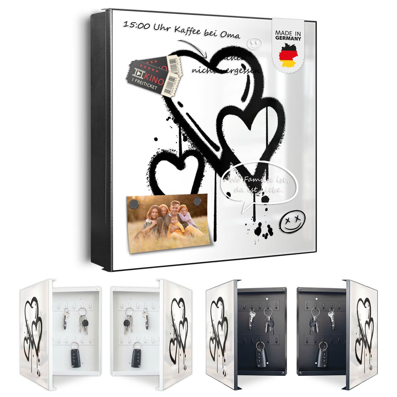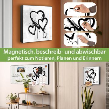 Bringe Ordnung und Eleganz in deinen Eingangsbereich mit dem banjado Schlüsselkasten Motiv Motiv Herzen Graffiti. Die moderne Schlüsselbox kombiniert funktionales Design mit hochwertiger Verarbeitung und wird so zu einem echten Hingucker in Flur, Büro oder Ferienwohnung. ✅ Stilvolle Schlüsselaufbewahrung mit Motiv Motiv Herzen Graffiti Der Design-Schlüsselkasten Motiv Motiv Herzen Graffiti bietet Platz für bis zu 32 Schlüssel, die auf 4 stabilen Reihen mit je 8 Haken übersichtlich verstaut werden. Mit seinen kompakten Maßen von 30 x 30 x 5 cm passt die Schlüsselbox perfekt auch in kleinere Räume. Der schwarz lackierte Stahlkorpus mit links angeschlagenem Türscharnier harmoniert mit gedruckten Folie auf der Front und fügt sich nahtlos in jedes Wohnambiente ein. Ob als Schlüsselorganizer für Zuhause oder als praktische Lösung für Büros, Praxen und Gewerbe, der banjado Schlüsselkasten sorgt für Ordnung und Übersicht. Dank der magnetischen, mit Kreidestiften beschreibbaren Folie auf der Front kannst du Notizen anheften oder Termine direkt auf der Oberfläche festhalten. Die Schlüsselbox Motiv Motiv Herzen Graffiti zur Wandmontage wird inklusive Befestigungsmaterial geliefert und ist schnell angebracht. So hast du deine Schlüssel jederzeit griffbereit und zugleich stilvoll verstaut. Mit diesem banjado Schlüsselkasten Motiv Motiv Herzen Graffiti kombinierst du praktische Aufbewahrung mit stilvollem Wohndesign. Ob privat oder geschäftlich, die Schlüsselbox sorgt für mehr Ordnung, Übersicht und ein wohnliches Ambiente.Vorteile im Überblick