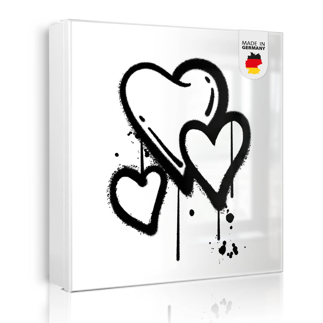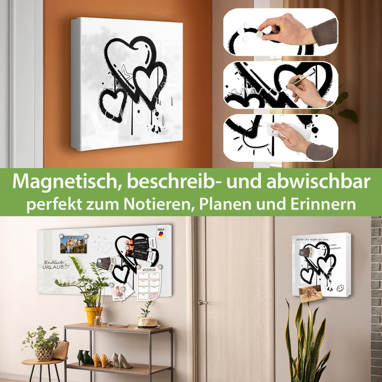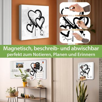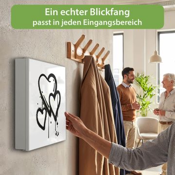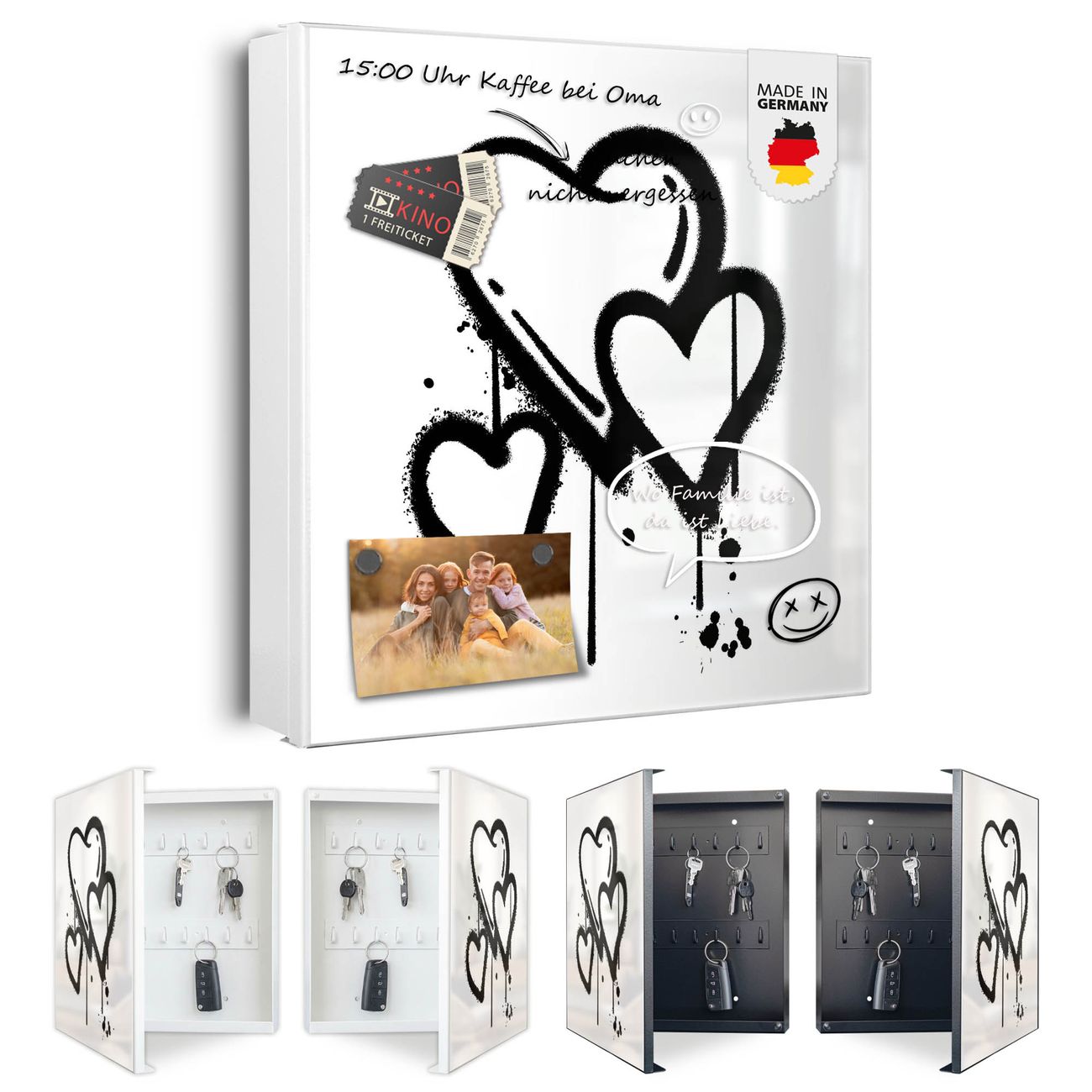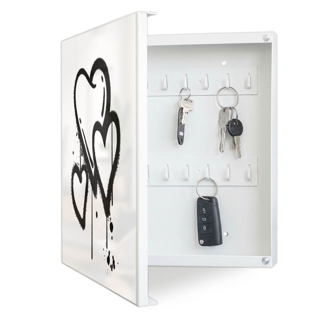 Bringe Ordnung und Eleganz in deinen Eingangsbereich mit dem banjado Schlüsselkasten Motiv Motiv Herzen Graffiti. Die moderne Schlüsselbox kombiniert funktionales Design mit hochwertiger Verarbeitung und wird so zu einem echten Hingucker in Flur, Büro oder Ferienwohnung. ✅ Stilvolle Schlüsselaufbewahrung mit Motiv Motiv Herzen Graffiti Der Design-Schlüsselkasten Motiv Motiv Herzen Graffiti bietet Platz für bis zu 32 Schlüssel, die auf 4 stabilen Reihen mit je 8 Haken übersichtlich verstaut werden. Mit seinen kompakten Maßen von 30 x 30 x 5 cm passt die Schlüsselbox perfekt auch in kleinere Räume. Der weiß lackierte Stahlkorpus mit links angeschlagenem Türscharnier harmoniert mit gedruckten Folie auf der Front und fügt sich nahtlos in jedes Wohnambiente ein. Ob als Schlüsselorganizer für Zuhause oder als praktische Lösung für Büros, Praxen und Gewerbe, der banjado Schlüsselkasten sorgt für Ordnung und Übersicht. Dank der magnetischen, mit Kreidestiften beschreibbaren Folie auf der Front kannst du Notizen anheften oder Termine direkt auf der Oberfläche festhalten. Die Schlüsselbox Motiv Motiv Herzen Graffiti zur Wandmontage wird inklusive Befestigungsmaterial geliefert und ist schnell angebracht. So hast du deine Schlüssel jederzeit griffbereit und zugleich stilvoll verstaut. Mit diesem banjado Schlüsselkasten Motiv Motiv Herzen Graffiti kombinierst du praktische Aufbewahrung mit stilvollem Wohndesign. Ob privat oder geschäftlich, die Schlüsselbox sorgt für mehr Ordnung, Übersicht und ein wohnliches Ambiente.Vorteile im Überblick