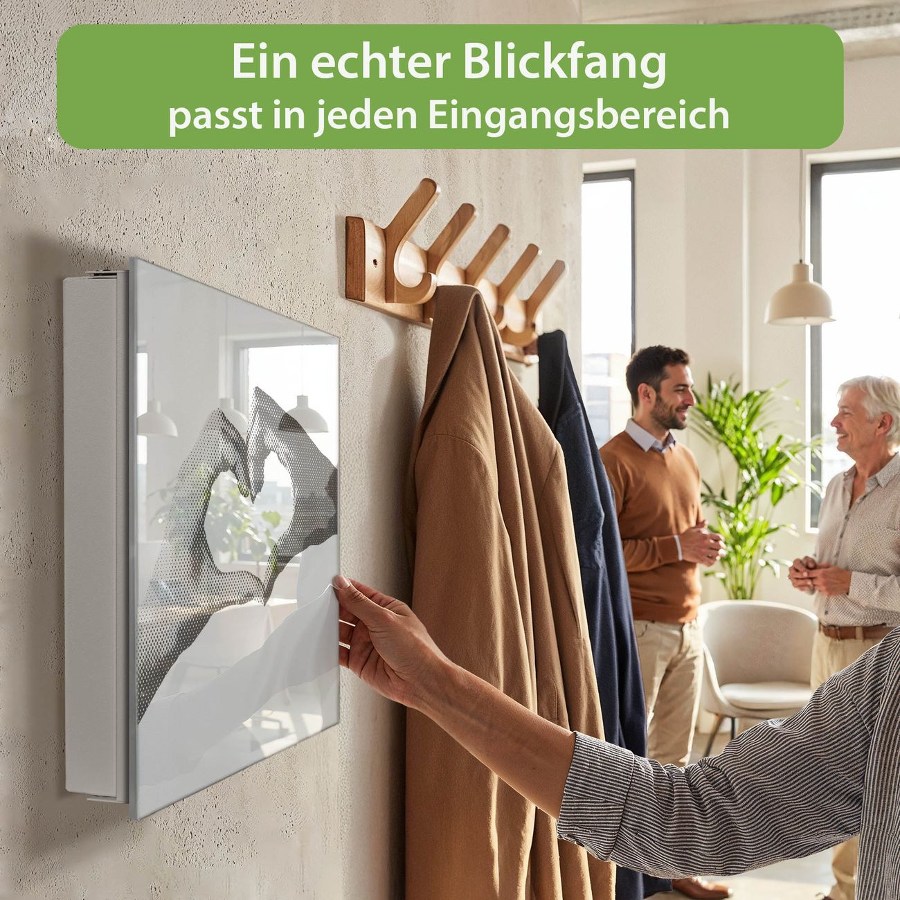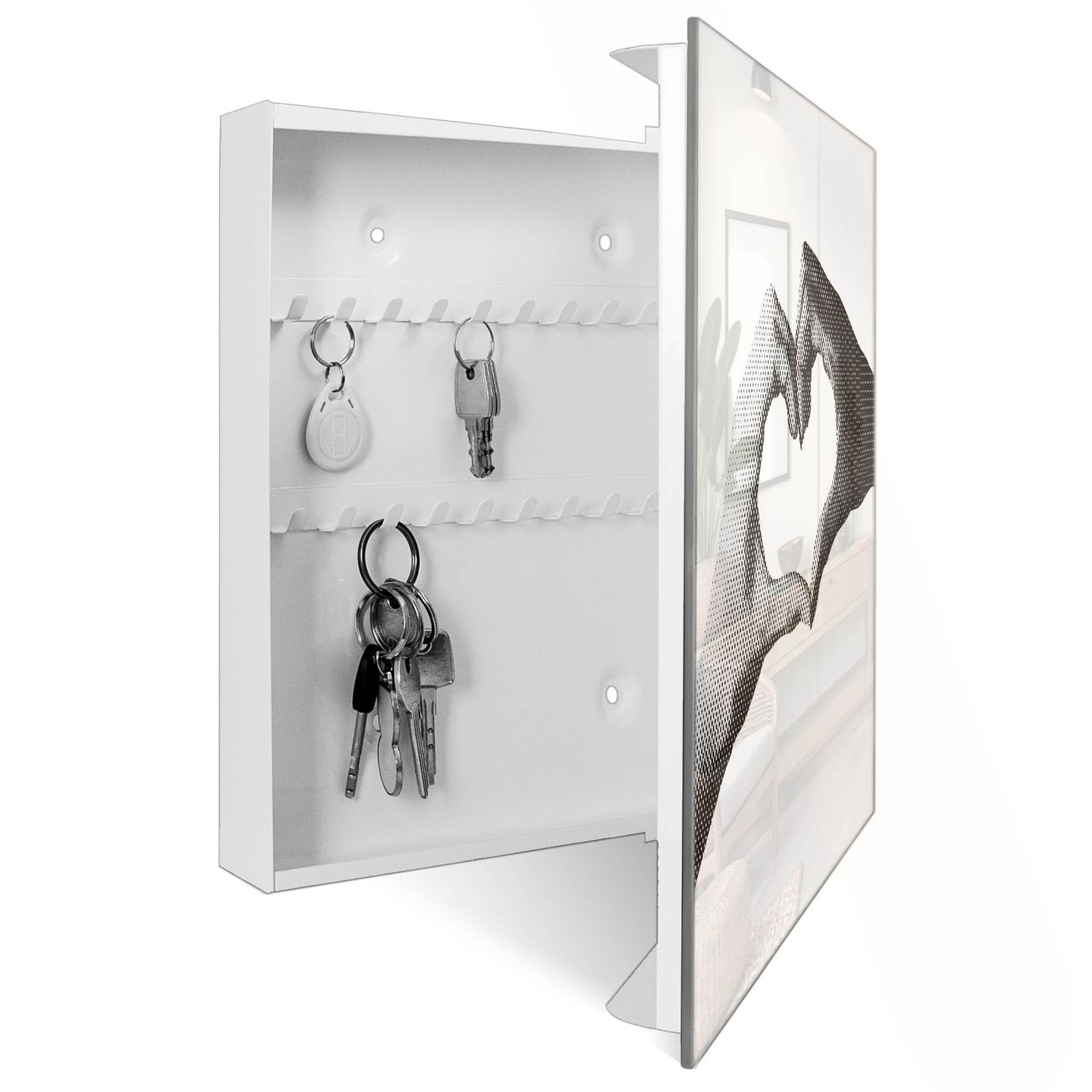 Bringe Ordnung und Eleganz in deinen Eingangsbereich mit dem banjado Schlüsselkasten Motiv Motiv Herzhände. Die moderne Schlüsselbox kombiniert funktionales Design mit hochwertiger Verarbeitung und wird so zu einem echten Hingucker in Flur, Büro oder Ferienwohnung. ✅ Stilvolle Schlüsselaufbewahrung mit Glasfront im Motiv Motiv Herzhände Der Design-Schlüsselkasten Motiv Motiv Herzhände bietet Platz für bis zu 50 Schlüssel, die auf 5 stabilen Reihen mit je 10 Haken übersichtlich verstaut werden. Mit seinen kompakten Maßen von 30 x 30 x 5 cm passt die Schlüsselbox perfekt auch in kleinere Räume. Der weiß lackierte Stahlkorpus mit rechts angeschlagenem Türscharnier harmoniert mit der Glasfront und fügt sich nahtlos in jedes Wohnambiente ein. Ob als Schlüsselorganizer für Zuhause oder als praktische Lösung für Büros, Praxen und Gewerbe, der banjado Schlüsselkasten sorgt für Ordnung und Übersicht. Dank der magnetischen, mit Kreidestiften beschreibbaren Glasfront kannst du Notizen anheften oder Termine direkt auf der Oberfläche festhalten. Die Schlüsselbox Motiv Motiv Herzhände zur Wandmontage wird inklusive Befestigungsmaterial geliefert und ist schnell angebracht. So hast du deine Schlüssel jederzeit griffbereit und zugleich stilvoll verstaut. Mit diesem banjado Schlüsselkasten Motiv Motiv Herzhände kombinierst du praktische Aufbewahrung mit stilvollem Wohndesign. Ob privat oder geschäftlich, die Schlüsselbox sorgt für mehr Ordnung, Übersicht und ein wohnliches Ambiente.Vorteile im Überblick