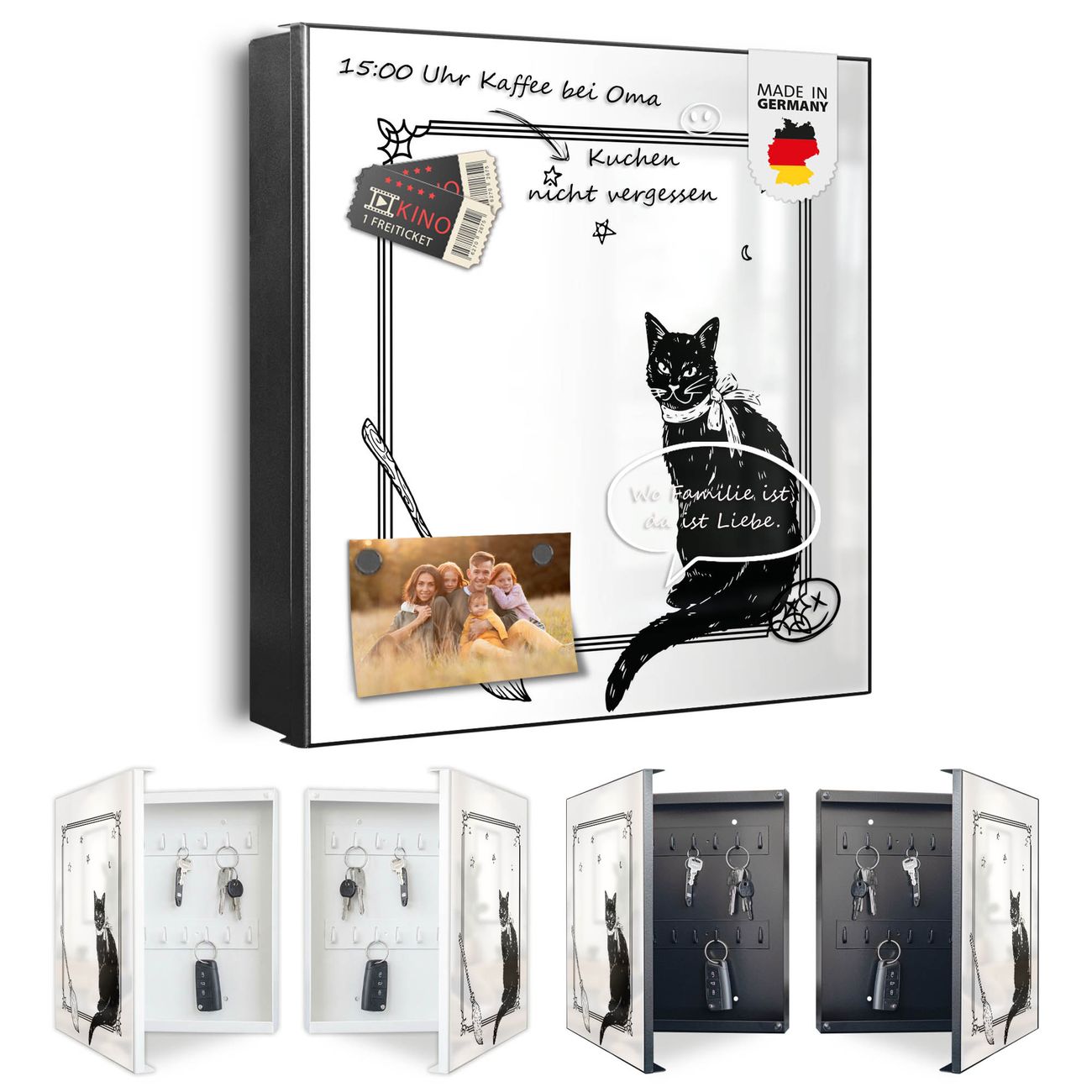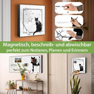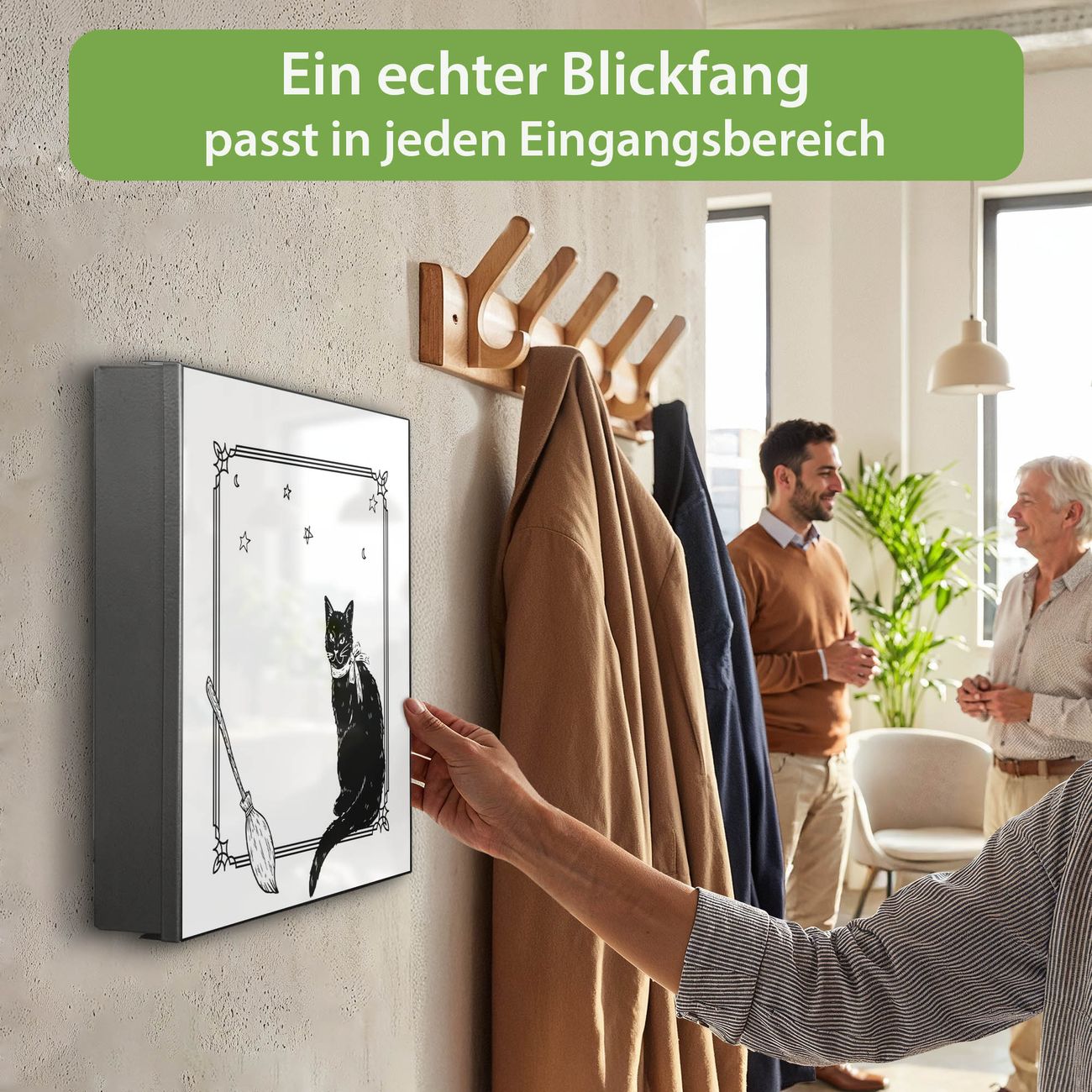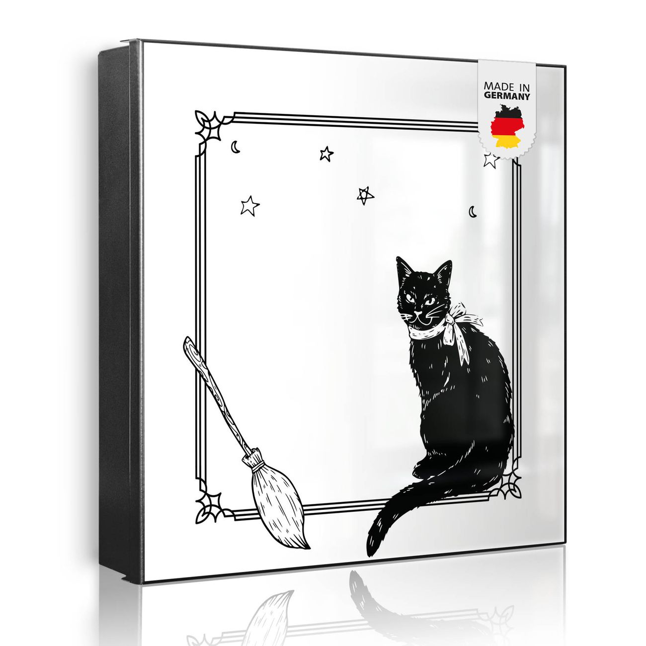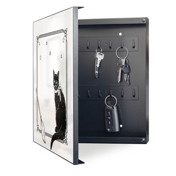 Bringe Ordnung und Eleganz in deinen Eingangsbereich mit dem banjado Schlüsselkasten Motiv Motiv Hexen und Kater. Die moderne Schlüsselbox kombiniert funktionales Design mit hochwertiger Verarbeitung und wird so zu einem echten Hingucker in Flur, Büro oder Ferienwohnung. ✅ Stilvolle Schlüsselaufbewahrung mit Motiv Motiv Hexen und Kater Der Design-Schlüsselkasten Motiv Motiv Hexen und Kater bietet Platz für bis zu 32 Schlüssel, die auf 4 stabilen Reihen mit je 8 Haken übersichtlich verstaut werden. Mit seinen kompakten Maßen von 30 x 30 x 5 cm passt die Schlüsselbox perfekt auch in kleinere Räume. Der schwarz lackierte Stahlkorpus mit links angeschlagenem Türscharnier harmoniert mit gedruckten Folie auf der Front und fügt sich nahtlos in jedes Wohnambiente ein. Ob als Schlüsselorganizer für Zuhause oder als praktische Lösung für Büros, Praxen und Gewerbe, der banjado Schlüsselkasten sorgt für Ordnung und Übersicht. Dank der magnetischen, mit Kreidestiften beschreibbaren Folie auf der Front kannst du Notizen anheften oder Termine direkt auf der Oberfläche festhalten. Die Schlüsselbox Motiv Motiv Hexen und Kater zur Wandmontage wird inklusive Befestigungsmaterial geliefert und ist schnell angebracht. So hast du deine Schlüssel jederzeit griffbereit und zugleich stilvoll verstaut. Mit diesem banjado Schlüsselkasten Motiv Motiv Hexen und Kater kombinierst du praktische Aufbewahrung mit stilvollem Wohndesign. Ob privat oder geschäftlich, die Schlüsselbox sorgt für mehr Ordnung, Übersicht und ein wohnliches Ambiente.Vorteile im Überblick