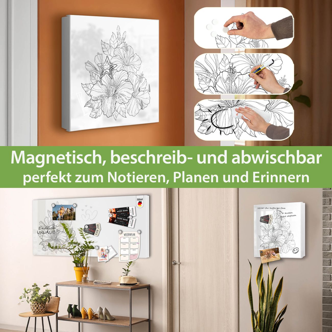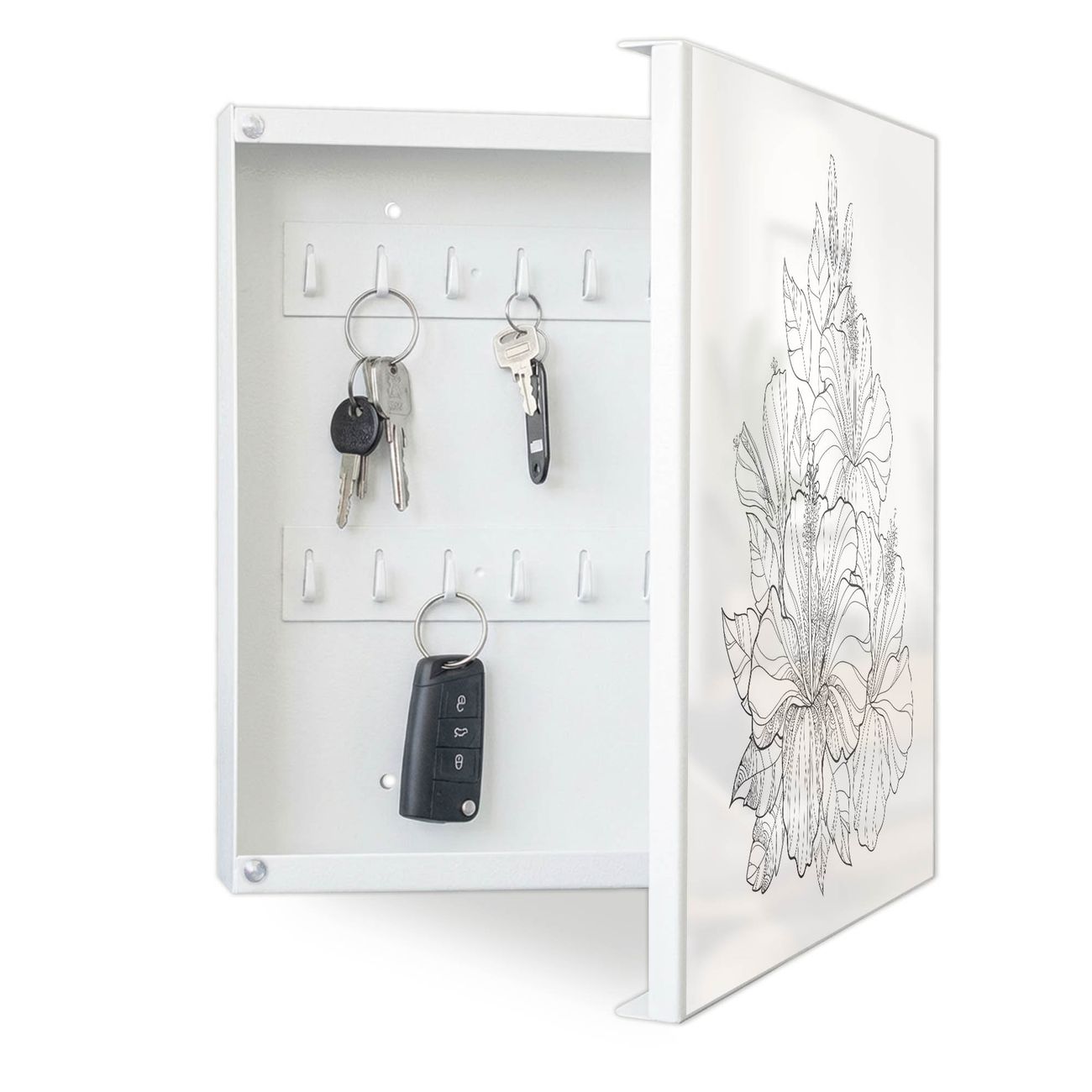 Bringe Ordnung und Eleganz in deinen Eingangsbereich mit dem banjado Schlüsselkasten Motiv Motiv Hibiskus 2. Die moderne Schlüsselbox kombiniert funktionales Design mit hochwertiger Verarbeitung und wird so zu einem echten Hingucker in Flur, Büro oder Ferienwohnung. ✅ Stilvolle Schlüsselaufbewahrung mit Motiv Motiv Hibiskus 2 Der Design-Schlüsselkasten Motiv Motiv Hibiskus 2 bietet Platz für bis zu 32 Schlüssel, die auf 4 stabilen Reihen mit je 8 Haken übersichtlich verstaut werden. Mit seinen kompakten Maßen von 30 x 30 x 5 cm passt die Schlüsselbox perfekt auch in kleinere Räume. Der weiß lackierte Stahlkorpus mit rechts angeschlagenem Türscharnier harmoniert mit gedruckten Folie auf der Front und fügt sich nahtlos in jedes Wohnambiente ein. Ob als Schlüsselorganizer für Zuhause oder als praktische Lösung für Büros, Praxen und Gewerbe, der banjado Schlüsselkasten sorgt für Ordnung und Übersicht. Dank der magnetischen, mit Kreidestiften beschreibbaren Folie auf der Front kannst du Notizen anheften oder Termine direkt auf der Oberfläche festhalten. Die Schlüsselbox Motiv Motiv Hibiskus 2 zur Wandmontage wird inklusive Befestigungsmaterial geliefert und ist schnell angebracht. So hast du deine Schlüssel jederzeit griffbereit und zugleich stilvoll verstaut. Mit diesem banjado Schlüsselkasten Motiv Motiv Hibiskus 2 kombinierst du praktische Aufbewahrung mit stilvollem Wohndesign. Ob privat oder geschäftlich, die Schlüsselbox sorgt für mehr Ordnung, Übersicht und ein wohnliches Ambiente.Vorteile im Überblick