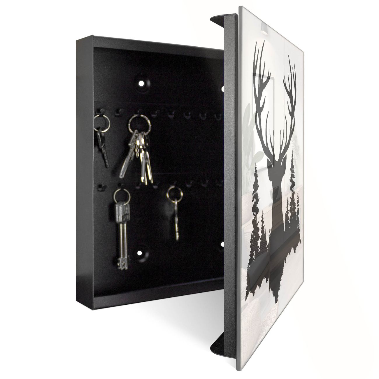 Bringe Ordnung und Eleganz in deinen Eingangsbereich mit dem banjado Schlüsselkasten Motiv Motiv Hirsch im Wald. Die moderne Schlüsselbox kombiniert funktionales Design mit hochwertiger Verarbeitung und wird so zu einem echten Hingucker in Flur, Büro oder Ferienwohnung. ✅ Stilvolle Schlüsselaufbewahrung mit Glasfront im Motiv Motiv Hirsch im Wald Der Design-Schlüsselkasten Motiv Motiv Hirsch im Wald bietet Platz für bis zu 50 Schlüssel, die auf 5 stabilen Reihen mit je 10 Haken übersichtlich verstaut werden. Mit seinen kompakten Maßen von 30 x 30 x 5 cm passt die Schlüsselbox perfekt auch in kleinere Räume. Der schwarz lackierte Stahlkorpus mit rechts angeschlagenem Türscharnier harmoniert mit der Glasfront und fügt sich nahtlos in jedes Wohnambiente ein. Ob als Schlüsselorganizer für Zuhause oder als praktische Lösung für Büros, Praxen und Gewerbe, der banjado Schlüsselkasten sorgt für Ordnung und Übersicht. Dank der magnetischen, mit Kreidestiften beschreibbaren Glasfront kannst du Notizen anheften oder Termine direkt auf der Oberfläche festhalten. Die Schlüsselbox Motiv Motiv Hirsch im Wald zur Wandmontage wird inklusive Befestigungsmaterial geliefert und ist schnell angebracht. So hast du deine Schlüssel jederzeit griffbereit und zugleich stilvoll verstaut. Mit diesem banjado Schlüsselkasten Motiv Motiv Hirsch im Wald kombinierst du praktische Aufbewahrung mit stilvollem Wohndesign. Ob privat oder geschäftlich, die Schlüsselbox sorgt für mehr Ordnung, Übersicht und ein wohnliches Ambiente.Vorteile im Überblick