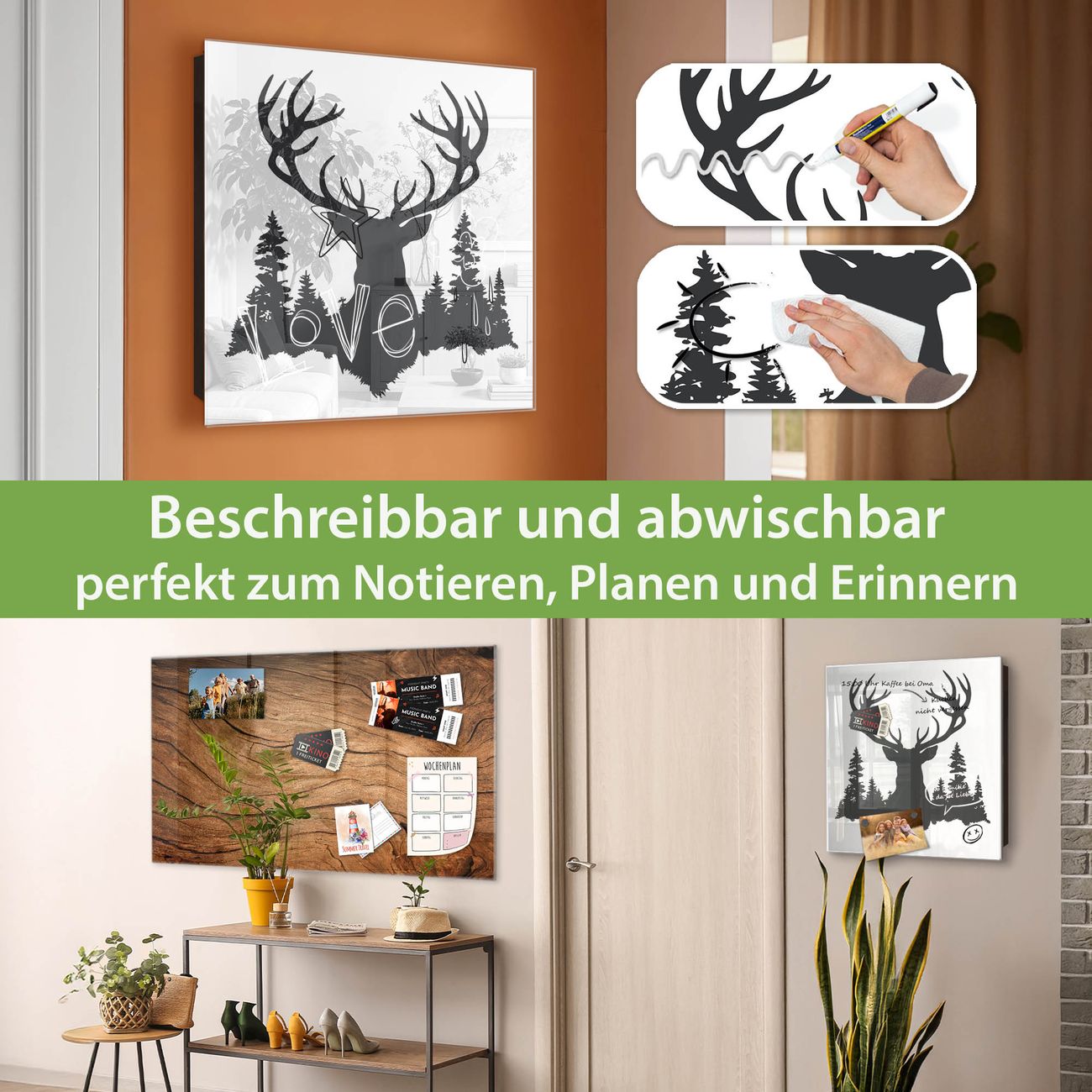Bringe Ordnung und Eleganz in deinen Eingangsbereich mit dem banjado Schlüsselkasten Motiv Motiv Hirsch im Wald. Die moderne Schlüsselbox kombiniert funktionales Design mit hochwertiger Verarbeitung und wird so zu einem echten Hingucker in Flur, Büro oder Ferienwohnung. ✅ Stilvolle Schlüsselaufbewahrung mit Glasfront im Motiv Motiv Hirsch im Wald Der Design-Schlüsselkasten Motiv Motiv Hirsch im Wald bietet Platz für bis zu 50 Schlüssel, die auf 5 stabilen Reihen mit je 10 Haken übersichtlich verstaut werden. Mit seinen kompakten Maßen von 30 x 30 x 5 cm passt die Schlüsselbox perfekt auch in kleinere Räume. Der schwarz lackierte Stahlkorpus mit rechts angeschlagenem Türscharnier harmoniert mit der Glasfront und fügt sich nahtlos in jedes Wohnambiente ein. Ob als Schlüsselorganizer für Zuhause oder als praktische Lösung für Büros, Praxen und Gewerbe, der banjado Schlüsselkasten sorgt für Ordnung und Übersicht. Dank der magnetischen, mit Kreidestiften beschreibbaren Glasfront kannst du Notizen anheften oder Termine direkt auf der Oberfläche festhalten. Die Schlüsselbox Motiv Motiv Hirsch im Wald zur Wandmontage wird inklusive Befestigungsmaterial geliefert und ist schnell angebracht. So hast du deine Schlüssel jederzeit griffbereit und zugleich stilvoll verstaut. Mit diesem banjado Schlüsselkasten Motiv Motiv Hirsch im Wald kombinierst du praktische Aufbewahrung mit stilvollem Wohndesign. Ob privat oder geschäftlich, die Schlüsselbox sorgt für mehr Ordnung, Übersicht und ein wohnliches Ambiente.Vorteile im Überblick