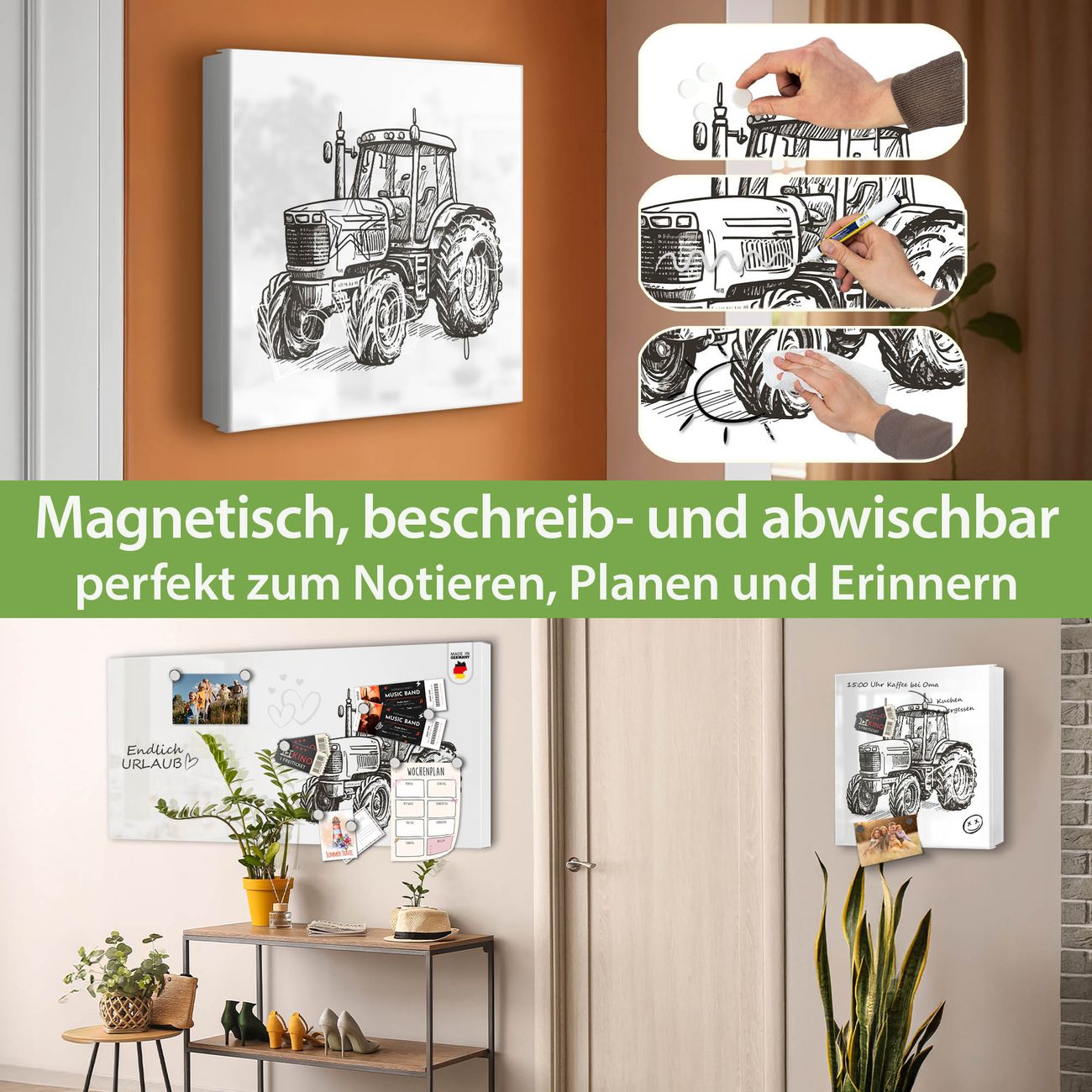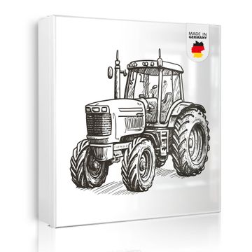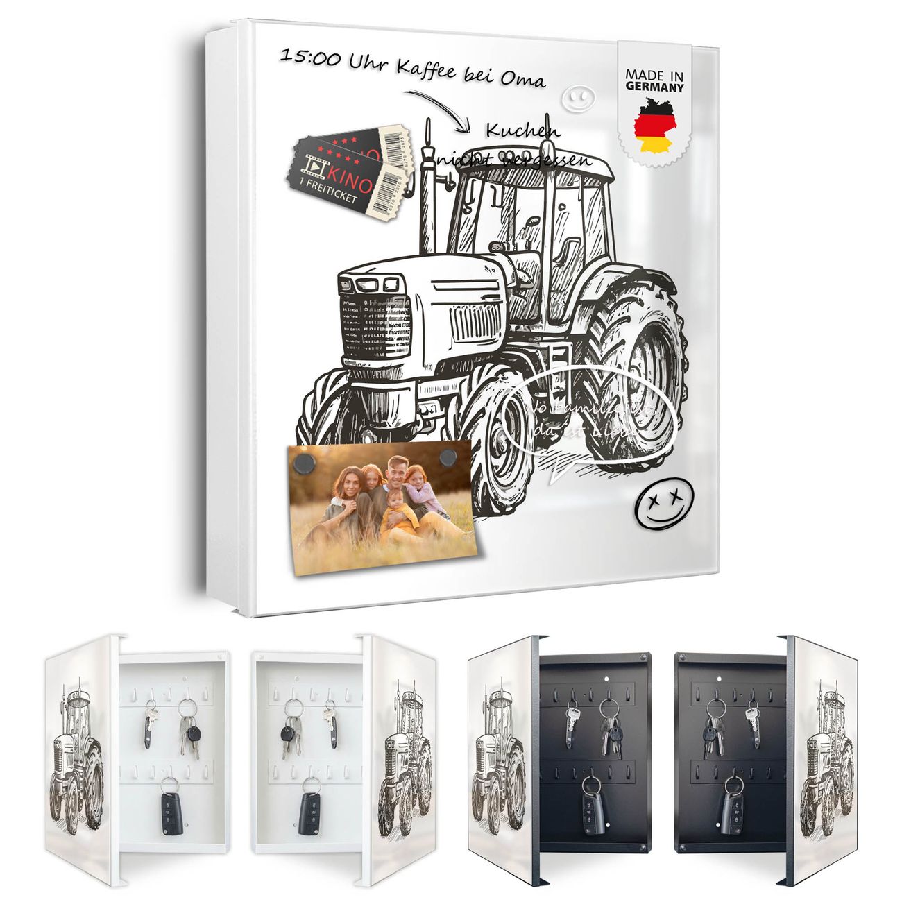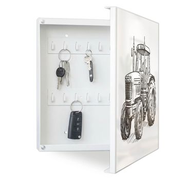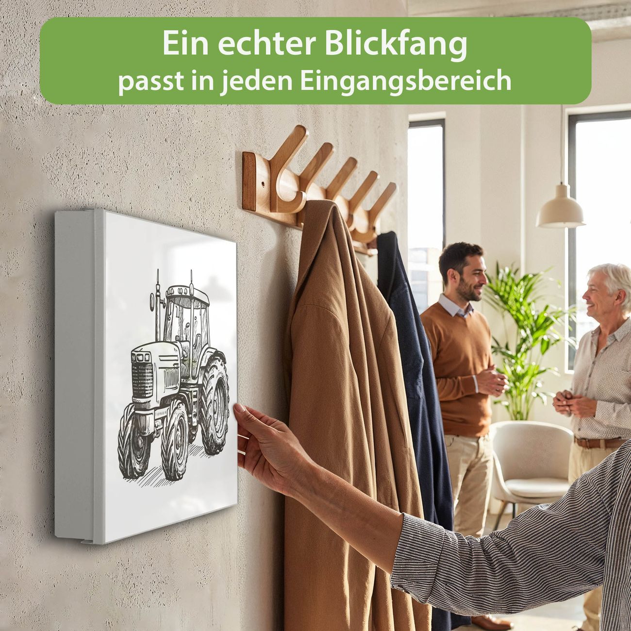 Bringe Ordnung und Eleganz in deinen Eingangsbereich mit dem banjado Schlüsselkasten Motiv Motiv Historischer Traktor. Die moderne Schlüsselbox kombiniert funktionales Design mit hochwertiger Verarbeitung und wird so zu einem echten Hingucker in Flur, Büro oder Ferienwohnung. ✅ Stilvolle Schlüsselaufbewahrung mit Motiv Motiv Historischer Traktor Der Design-Schlüsselkasten Motiv Motiv Historischer Traktor bietet Platz für bis zu 32 Schlüssel, die auf 4 stabilen Reihen mit je 8 Haken übersichtlich verstaut werden. Mit seinen kompakten Maßen von 30 x 30 x 5 cm passt die Schlüsselbox perfekt auch in kleinere Räume. Der weiß lackierte Stahlkorpus mit rechts angeschlagenem Türscharnier harmoniert mit gedruckten Folie auf der Front und fügt sich nahtlos in jedes Wohnambiente ein. Ob als Schlüsselorganizer für Zuhause oder als praktische Lösung für Büros, Praxen und Gewerbe, der banjado Schlüsselkasten sorgt für Ordnung und Übersicht. Dank der magnetischen, mit Kreidestiften beschreibbaren Folie auf der Front kannst du Notizen anheften oder Termine direkt auf der Oberfläche festhalten. Die Schlüsselbox Motiv Motiv Historischer Traktor zur Wandmontage wird inklusive Befestigungsmaterial geliefert und ist schnell angebracht. So hast du deine Schlüssel jederzeit griffbereit und zugleich stilvoll verstaut. Mit diesem banjado Schlüsselkasten Motiv Motiv Historischer Traktor kombinierst du praktische Aufbewahrung mit stilvollem Wohndesign. Ob privat oder geschäftlich, die Schlüsselbox sorgt für mehr Ordnung, Übersicht und ein wohnliches Ambiente.Vorteile im Überblick