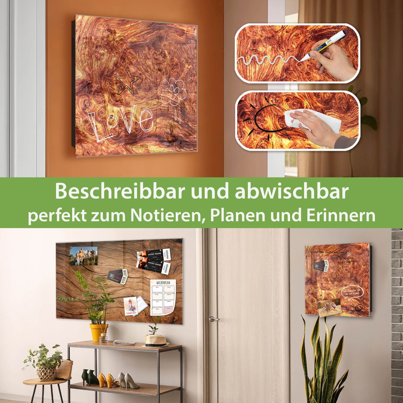 Bringe Ordnung und Eleganz in deinen Eingangsbereich mit dem banjado Schlüsselkasten Motiv Holz Gemasert Afzelia. Die moderne Schlüsselbox kombiniert funktionales Design mit hochwertiger Verarbeitung und wird so zu einem echten Hingucker in Flur, Büro oder Ferienwohnung. ✅ Stilvolle Schlüsselaufbewahrung mit Glasfront im Motiv Motiv Holz Gemasert Afzelia Der Design-Schlüsselkasten Motiv Holz Gemasert Afzelia bietet Platz für bis zu 50 Schlüssel, die auf 5 stabilen Reihen mit je 10 Haken übersichtlich verstaut werden. Mit seinen kompakten Maßen von 30 x 30 x 5 cm passt die Schlüsselbox perfekt auch in kleinere Räume. Der schwarz lackierte Stahlkorpus mit rechts angeschlagenem Türscharnier harmoniert mit der Glasfront und fügt sich nahtlos in jedes Wohnambiente ein. Ob als Schlüsselorganizer für Zuhause oder als praktische Lösung für Büros, Praxen und Gewerbe, der banjado Schlüsselkasten sorgt für Ordnung und Übersicht. Dank der magnetischen, mit Kreidestiften beschreibbaren Glasfront kannst du Notizen anheften oder Termine direkt auf der Oberfläche festhalten. Die Schlüsselbox Motiv Holz Gemasert Afzelia zur Wandmontage wird inklusive Befestigungsmaterial geliefert und ist schnell angebracht. So hast du deine Schlüssel jederzeit griffbereit und zugleich stilvoll verstaut. Mit diesem banjado Schlüsselkasten Motiv Holz Gemasert Afzelia kombinierst du praktische Aufbewahrung mit stilvollem Wohndesign. Ob privat oder geschäftlich, die Schlüsselbox sorgt für mehr Ordnung, Übersicht und ein wohnliches Ambiente.Vorteile im Überblick