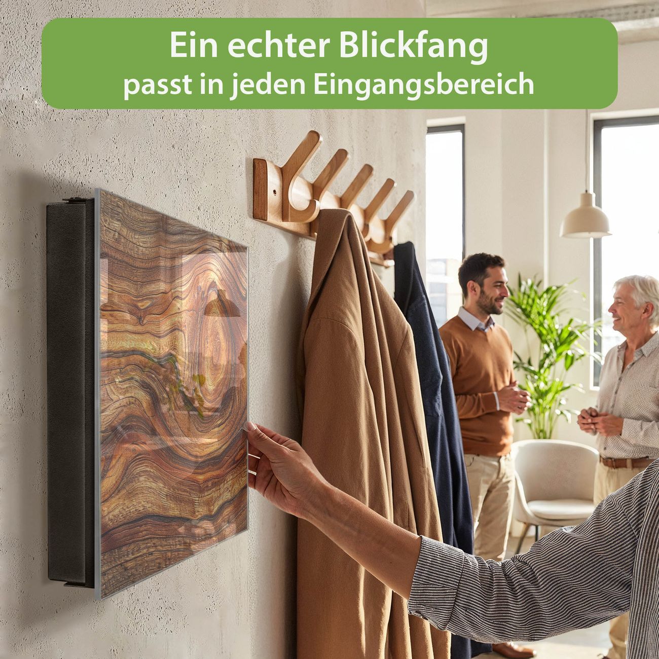 Bringe Ordnung und Eleganz in deinen Eingangsbereich mit dem banjado Schlüsselkasten Motiv Holz Gemasert Astloch. Die moderne Schlüsselbox kombiniert funktionales Design mit hochwertiger Verarbeitung und wird so zu einem echten Hingucker in Flur, Büro oder Ferienwohnung. ✅ Stilvolle Schlüsselaufbewahrung mit Glasfront im Motiv Motiv Holz Gemasert Astloch Der Design-Schlüsselkasten Motiv Holz Gemasert Astloch bietet Platz für bis zu 50 Schlüssel, die auf 5 stabilen Reihen mit je 10 Haken übersichtlich verstaut werden. Mit seinen kompakten Maßen von 30 x 30 x 5 cm passt die Schlüsselbox perfekt auch in kleinere Räume. Der schwarz lackierte Stahlkorpus mit rechts angeschlagenem Türscharnier harmoniert mit der Glasfront und fügt sich nahtlos in jedes Wohnambiente ein. Ob als Schlüsselorganizer für Zuhause oder als praktische Lösung für Büros, Praxen und Gewerbe, der banjado Schlüsselkasten sorgt für Ordnung und Übersicht. Dank der magnetischen, mit Kreidestiften beschreibbaren Glasfront kannst du Notizen anheften oder Termine direkt auf der Oberfläche festhalten. Die Schlüsselbox Motiv Holz Gemasert Astloch zur Wandmontage wird inklusive Befestigungsmaterial geliefert und ist schnell angebracht. So hast du deine Schlüssel jederzeit griffbereit und zugleich stilvoll verstaut. Mit diesem banjado Schlüsselkasten Motiv Holz Gemasert Astloch kombinierst du praktische Aufbewahrung mit stilvollem Wohndesign. Ob privat oder geschäftlich, die Schlüsselbox sorgt für mehr Ordnung, Übersicht und ein wohnliches Ambiente.Vorteile im Überblick