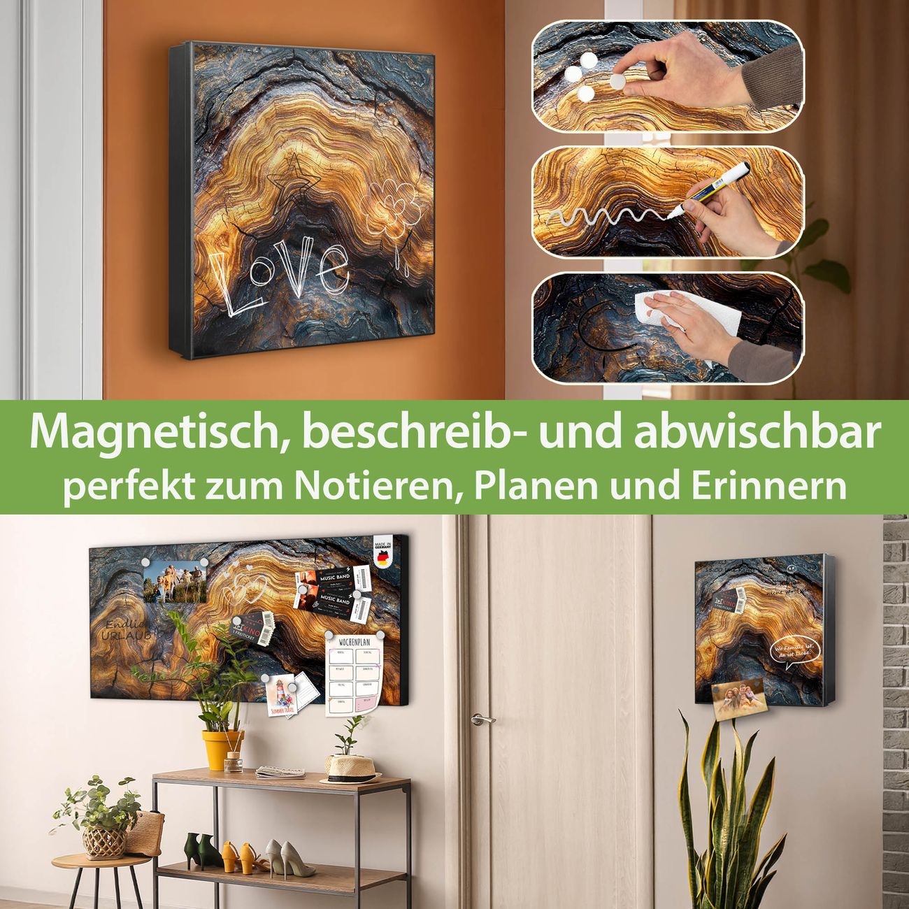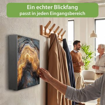 Bringe Ordnung und Eleganz in deinen Eingangsbereich mit dem banjado Schlüsselkasten Motiv Motiv Holz Gemasert Fluss Gold. Die moderne Schlüsselbox kombiniert funktionales Design mit hochwertiger Verarbeitung und wird so zu einem echten Hingucker in Flur, Büro oder Ferienwohnung. ✅ Stilvolle Schlüsselaufbewahrung mit Motiv Motiv Holz Gemasert Fluss Gold Der Design-Schlüsselkasten Motiv Motiv Holz Gemasert Fluss Gold bietet Platz für bis zu 32 Schlüssel, die auf 4 stabilen Reihen mit je 8 Haken übersichtlich verstaut werden. Mit seinen kompakten Maßen von 30 x 30 x 5 cm passt die Schlüsselbox perfekt auch in kleinere Räume. Der schwarz lackierte Stahlkorpus mit rechts angeschlagenem Türscharnier harmoniert mit gedruckten Folie auf der Front und fügt sich nahtlos in jedes Wohnambiente ein. Ob als Schlüsselorganizer für Zuhause oder als praktische Lösung für Büros, Praxen und Gewerbe, der banjado Schlüsselkasten sorgt für Ordnung und Übersicht. Dank der magnetischen, mit Kreidestiften beschreibbaren Folie auf der Front kannst du Notizen anheften oder Termine direkt auf der Oberfläche festhalten. Die Schlüsselbox Motiv Motiv Holz Gemasert Fluss Gold zur Wandmontage wird inklusive Befestigungsmaterial geliefert und ist schnell angebracht. So hast du deine Schlüssel jederzeit griffbereit und zugleich stilvoll verstaut. Mit diesem banjado Schlüsselkasten Motiv Motiv Holz Gemasert Fluss Gold kombinierst du praktische Aufbewahrung mit stilvollem Wohndesign. Ob privat oder geschäftlich, die Schlüsselbox sorgt für mehr Ordnung, Übersicht und ein wohnliches Ambiente.Vorteile im Überblick