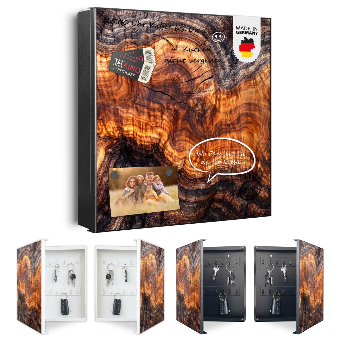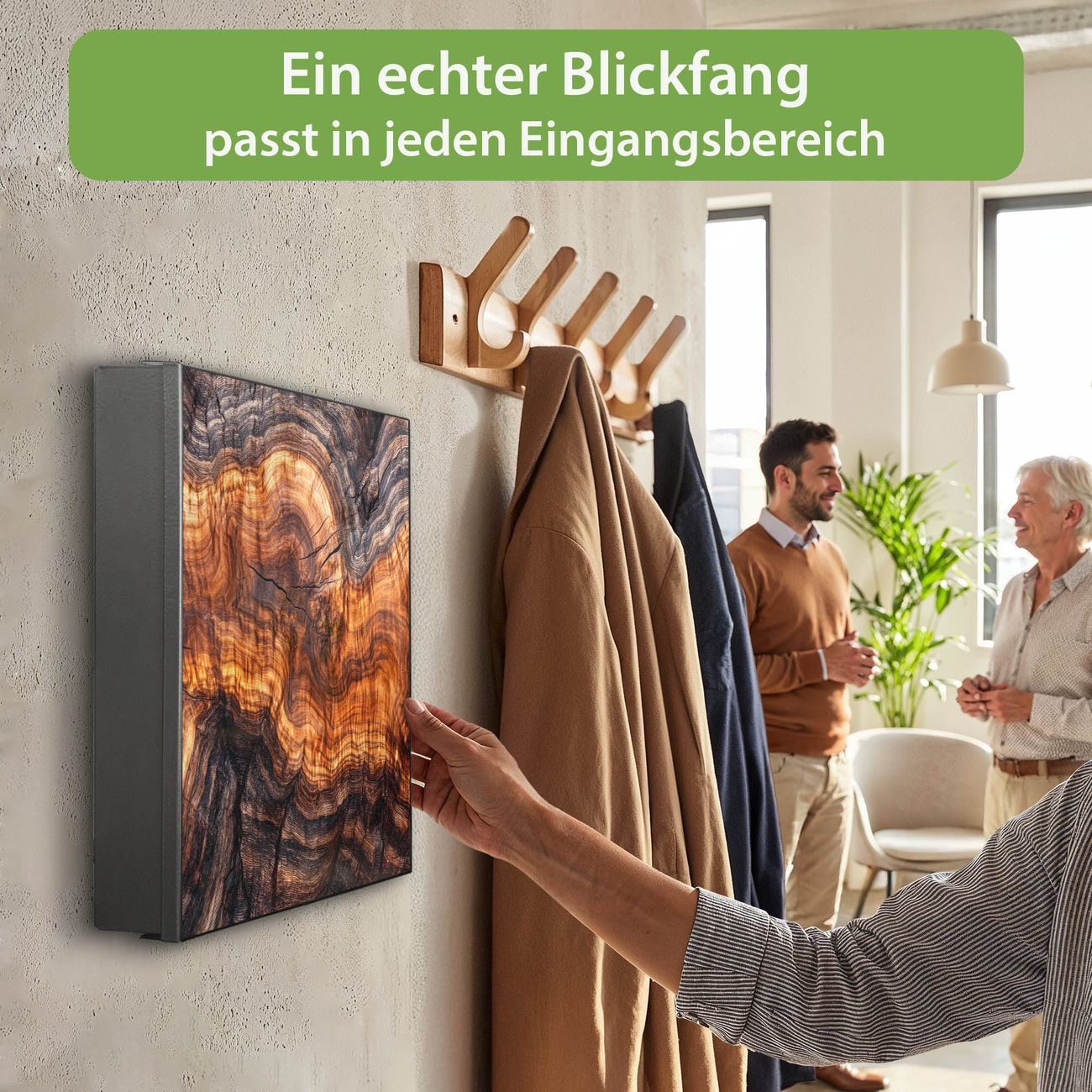 Bringe Ordnung und Eleganz in deinen Eingangsbereich mit dem banjado Schlüsselkasten Motiv Motiv Holz Gemasert Fluss Warm. Die moderne Schlüsselbox kombiniert funktionales Design mit hochwertiger Verarbeitung und wird so zu einem echten Hingucker in Flur, Büro oder Ferienwohnung. ✅ Stilvolle Schlüsselaufbewahrung mit Motiv Motiv Holz Gemasert Fluss Warm Der Design-Schlüsselkasten Motiv Motiv Holz Gemasert Fluss Warm bietet Platz für bis zu 32 Schlüssel, die auf 4 stabilen Reihen mit je 8 Haken übersichtlich verstaut werden. Mit seinen kompakten Maßen von 30 x 30 x 5 cm passt die Schlüsselbox perfekt auch in kleinere Räume. Der schwarz lackierte Stahlkorpus mit links angeschlagenem Türscharnier harmoniert mit gedruckten Folie auf der Front und fügt sich nahtlos in jedes Wohnambiente ein. Ob als Schlüsselorganizer für Zuhause oder als praktische Lösung für Büros, Praxen und Gewerbe, der banjado Schlüsselkasten sorgt für Ordnung und Übersicht. Dank der magnetischen, mit Kreidestiften beschreibbaren Folie auf der Front kannst du Notizen anheften oder Termine direkt auf der Oberfläche festhalten. Die Schlüsselbox Motiv Motiv Holz Gemasert Fluss Warm zur Wandmontage wird inklusive Befestigungsmaterial geliefert und ist schnell angebracht. So hast du deine Schlüssel jederzeit griffbereit und zugleich stilvoll verstaut. Mit diesem banjado Schlüsselkasten Motiv Motiv Holz Gemasert Fluss Warm kombinierst du praktische Aufbewahrung mit stilvollem Wohndesign. Ob privat oder geschäftlich, die Schlüsselbox sorgt für mehr Ordnung, Übersicht und ein wohnliches Ambiente.Vorteile im Überblick