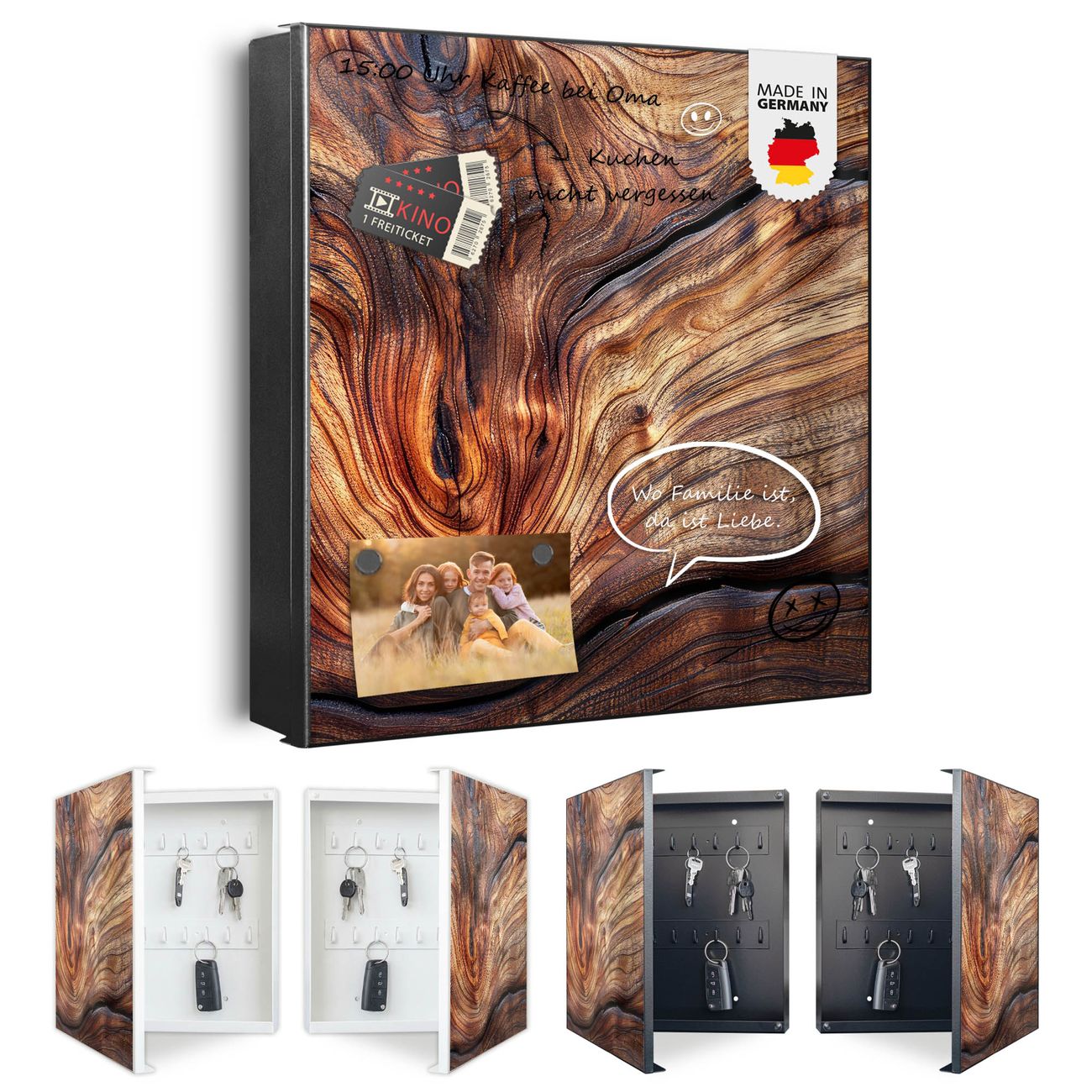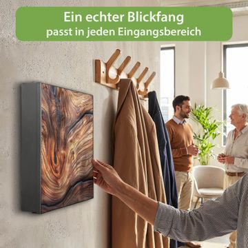 Bringe Ordnung und Eleganz in deinen Eingangsbereich mit dem banjado Schlüsselkasten Motiv Motiv Holz Gemasert Kurve. Die moderne Schlüsselbox kombiniert funktionales Design mit hochwertiger Verarbeitung und wird so zu einem echten Hingucker in Flur, Büro oder Ferienwohnung. ✅ Stilvolle Schlüsselaufbewahrung mit Motiv Motiv Holz Gemasert Kurve Der Design-Schlüsselkasten Motiv Motiv Holz Gemasert Kurve bietet Platz für bis zu 32 Schlüssel, die auf 4 stabilen Reihen mit je 8 Haken übersichtlich verstaut werden. Mit seinen kompakten Maßen von 30 x 30 x 5 cm passt die Schlüsselbox perfekt auch in kleinere Räume. Der schwarz lackierte Stahlkorpus mit rechts angeschlagenem Türscharnier harmoniert mit gedruckten Folie auf der Front und fügt sich nahtlos in jedes Wohnambiente ein. Ob als Schlüsselorganizer für Zuhause oder als praktische Lösung für Büros, Praxen und Gewerbe, der banjado Schlüsselkasten sorgt für Ordnung und Übersicht. Dank der magnetischen, mit Kreidestiften beschreibbaren Folie auf der Front kannst du Notizen anheften oder Termine direkt auf der Oberfläche festhalten. Die Schlüsselbox Motiv Motiv Holz Gemasert Kurve zur Wandmontage wird inklusive Befestigungsmaterial geliefert und ist schnell angebracht. So hast du deine Schlüssel jederzeit griffbereit und zugleich stilvoll verstaut. Mit diesem banjado Schlüsselkasten Motiv Motiv Holz Gemasert Kurve kombinierst du praktische Aufbewahrung mit stilvollem Wohndesign. Ob privat oder geschäftlich, die Schlüsselbox sorgt für mehr Ordnung, Übersicht und ein wohnliches Ambiente.Vorteile im Überblick
