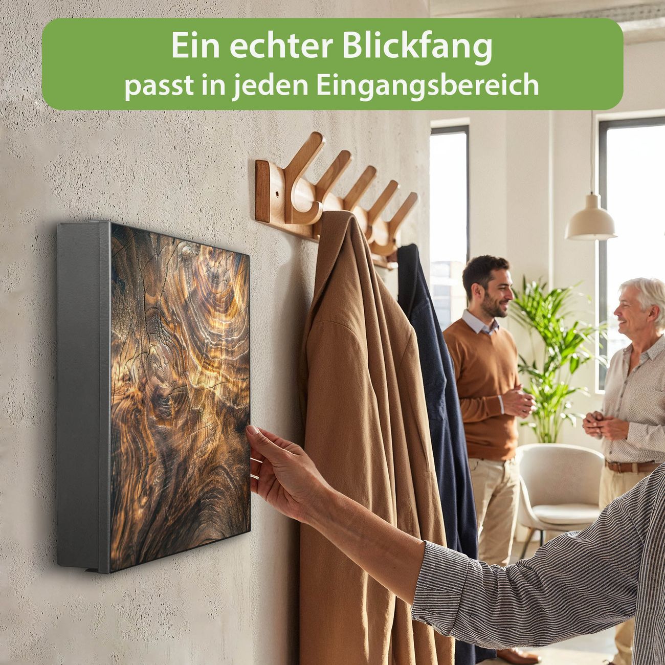 Bringe Ordnung und Eleganz in deinen Eingangsbereich mit dem banjado Schlüsselkasten Motiv Motiv Holz Gemasert Lichtspiel. Die moderne Schlüsselbox kombiniert funktionales Design mit hochwertiger Verarbeitung und wird so zu einem echten Hingucker in Flur, Büro oder Ferienwohnung. ✅ Stilvolle Schlüsselaufbewahrung mit Motiv Motiv Holz Gemasert Lichtspiel Der Design-Schlüsselkasten Motiv Motiv Holz Gemasert Lichtspiel bietet Platz für bis zu 32 Schlüssel, die auf 4 stabilen Reihen mit je 8 Haken übersichtlich verstaut werden. Mit seinen kompakten Maßen von 30 x 30 x 5 cm passt die Schlüsselbox perfekt auch in kleinere Räume. Der schwarz lackierte Stahlkorpus mit links angeschlagenem Türscharnier harmoniert mit gedruckten Folie auf der Front und fügt sich nahtlos in jedes Wohnambiente ein. Ob als Schlüsselorganizer für Zuhause oder als praktische Lösung für Büros, Praxen und Gewerbe, der banjado Schlüsselkasten sorgt für Ordnung und Übersicht. Dank der magnetischen, mit Kreidestiften beschreibbaren Folie auf der Front kannst du Notizen anheften oder Termine direkt auf der Oberfläche festhalten. Die Schlüsselbox Motiv Motiv Holz Gemasert Lichtspiel zur Wandmontage wird inklusive Befestigungsmaterial geliefert und ist schnell angebracht. So hast du deine Schlüssel jederzeit griffbereit und zugleich stilvoll verstaut. Mit diesem banjado Schlüsselkasten Motiv Motiv Holz Gemasert Lichtspiel kombinierst du praktische Aufbewahrung mit stilvollem Wohndesign. Ob privat oder geschäftlich, die Schlüsselbox sorgt für mehr Ordnung, Übersicht und ein wohnliches Ambiente.Vorteile im Überblick