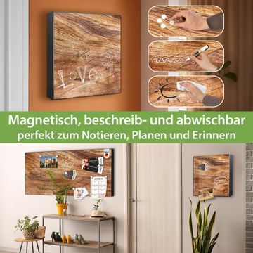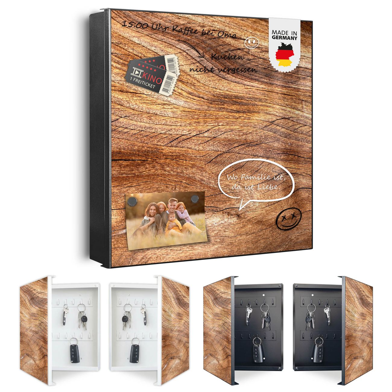 Bringe Ordnung und Eleganz in deinen Eingangsbereich mit dem banjado Schlüsselkasten Motiv Motiv Holz Struktur Fließend. Die moderne Schlüsselbox kombiniert funktionales Design mit hochwertiger Verarbeitung und wird so zu einem echten Hingucker in Flur, Büro oder Ferienwohnung. ✅ Stilvolle Schlüsselaufbewahrung mit Motiv Motiv Holz Struktur Fließend Der Design-Schlüsselkasten Motiv Motiv Holz Struktur Fließend bietet Platz für bis zu 32 Schlüssel, die auf 4 stabilen Reihen mit je 8 Haken übersichtlich verstaut werden. Mit seinen kompakten Maßen von 30 x 30 x 5 cm passt die Schlüsselbox perfekt auch in kleinere Räume. Der schwarz lackierte Stahlkorpus mit rechts angeschlagenem Türscharnier harmoniert mit gedruckten Folie auf der Front und fügt sich nahtlos in jedes Wohnambiente ein. Ob als Schlüsselorganizer für Zuhause oder als praktische Lösung für Büros, Praxen und Gewerbe, der banjado Schlüsselkasten sorgt für Ordnung und Übersicht. Dank der magnetischen, mit Kreidestiften beschreibbaren Folie auf der Front kannst du Notizen anheften oder Termine direkt auf der Oberfläche festhalten. Die Schlüsselbox Motiv Motiv Holz Struktur Fließend zur Wandmontage wird inklusive Befestigungsmaterial geliefert und ist schnell angebracht. So hast du deine Schlüssel jederzeit griffbereit und zugleich stilvoll verstaut. Mit diesem banjado Schlüsselkasten Motiv Motiv Holz Struktur Fließend kombinierst du praktische Aufbewahrung mit stilvollem Wohndesign. Ob privat oder geschäftlich, die Schlüsselbox sorgt für mehr Ordnung, Übersicht und ein wohnliches Ambiente.Vorteile im Überblick