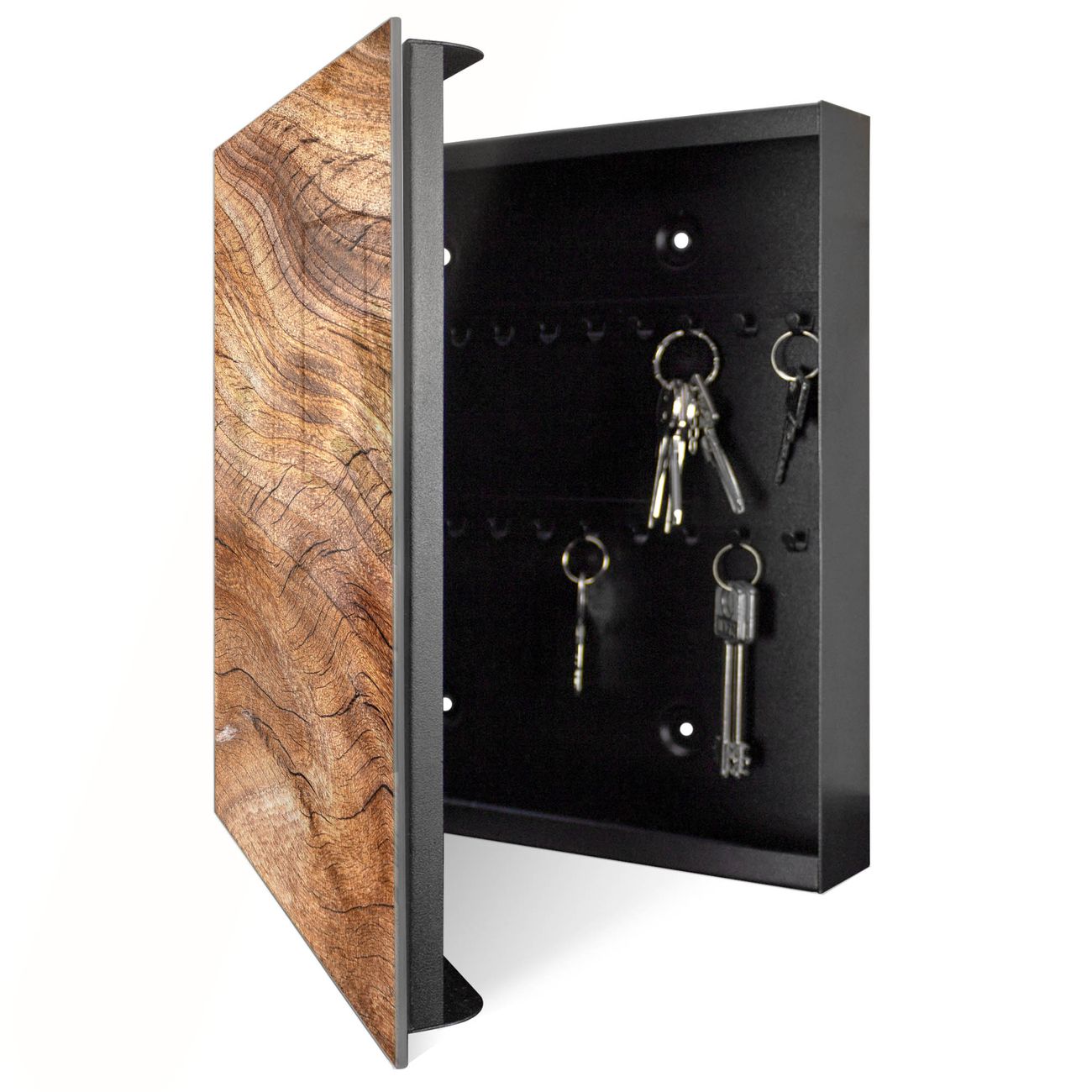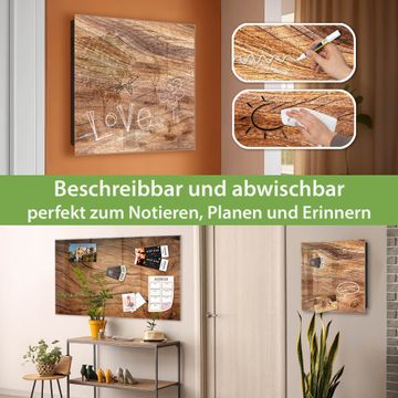 Bringe Ordnung und Eleganz in deinen Eingangsbereich mit dem banjado Schlüsselkasten Motiv Holz Struktur Fließend. Die moderne Schlüsselbox kombiniert funktionales Design mit hochwertiger Verarbeitung und wird so zu einem echten Hingucker in Flur, Büro oder Ferienwohnung. ✅ Stilvolle Schlüsselaufbewahrung mit Glasfront im Motiv Motiv Holz Struktur Fließend Der Design-Schlüsselkasten Motiv Holz Struktur Fließend bietet Platz für bis zu 50 Schlüssel, die auf 5 stabilen Reihen mit je 10 Haken übersichtlich verstaut werden. Mit seinen kompakten Maßen von 30 x 30 x 5 cm passt die Schlüsselbox perfekt auch in kleinere Räume. Der schwarz lackierte Stahlkorpus mit rechts angeschlagenem Türscharnier harmoniert mit der Glasfront und fügt sich nahtlos in jedes Wohnambiente ein. Ob als Schlüsselorganizer für Zuhause oder als praktische Lösung für Büros, Praxen und Gewerbe, der banjado Schlüsselkasten sorgt für Ordnung und Übersicht. Dank der magnetischen, mit Kreidestiften beschreibbaren Glasfront kannst du Notizen anheften oder Termine direkt auf der Oberfläche festhalten. Die Schlüsselbox Motiv Holz Struktur Fließend zur Wandmontage wird inklusive Befestigungsmaterial geliefert und ist schnell angebracht. So hast du deine Schlüssel jederzeit griffbereit und zugleich stilvoll verstaut. Mit diesem banjado Schlüsselkasten Motiv Holz Struktur Fließend kombinierst du praktische Aufbewahrung mit stilvollem Wohndesign. Ob privat oder geschäftlich, die Schlüsselbox sorgt für mehr Ordnung, Übersicht und ein wohnliches Ambiente.Vorteile im Überblick