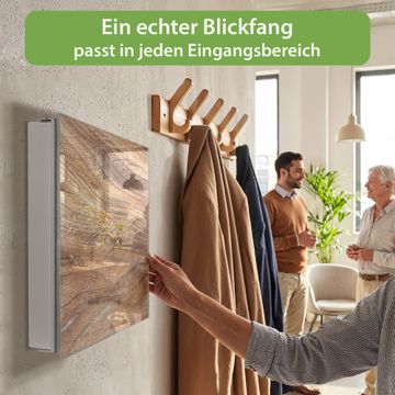 Bringe Ordnung und Eleganz in deinen Eingangsbereich mit dem banjado Schlüsselkasten Motiv Holz Struktur Fließend. Die moderne Schlüsselbox kombiniert funktionales Design mit hochwertiger Verarbeitung und wird so zu einem echten Hingucker in Flur, Büro oder Ferienwohnung. ✅ Stilvolle Schlüsselaufbewahrung mit Glasfront im Motiv Motiv Holz Struktur Fließend Der Design-Schlüsselkasten Motiv Holz Struktur Fließend bietet Platz für bis zu 50 Schlüssel, die auf 5 stabilen Reihen mit je 10 Haken übersichtlich verstaut werden. Mit seinen kompakten Maßen von 30 x 30 x 5 cm passt die Schlüsselbox perfekt auch in kleinere Räume. Der weiß lackierte Stahlkorpus mit rechts angeschlagenem Türscharnier harmoniert mit der Glasfront und fügt sich nahtlos in jedes Wohnambiente ein. Ob als Schlüsselorganizer für Zuhause oder als praktische Lösung für Büros, Praxen und Gewerbe, der banjado Schlüsselkasten sorgt für Ordnung und Übersicht. Dank der magnetischen, mit Kreidestiften beschreibbaren Glasfront kannst du Notizen anheften oder Termine direkt auf der Oberfläche festhalten. Die Schlüsselbox Motiv Holz Struktur Fließend zur Wandmontage wird inklusive Befestigungsmaterial geliefert und ist schnell angebracht. So hast du deine Schlüssel jederzeit griffbereit und zugleich stilvoll verstaut. Mit diesem banjado Schlüsselkasten Motiv Holz Struktur Fließend kombinierst du praktische Aufbewahrung mit stilvollem Wohndesign. Ob privat oder geschäftlich, die Schlüsselbox sorgt für mehr Ordnung, Übersicht und ein wohnliches Ambiente.Vorteile im Überblick