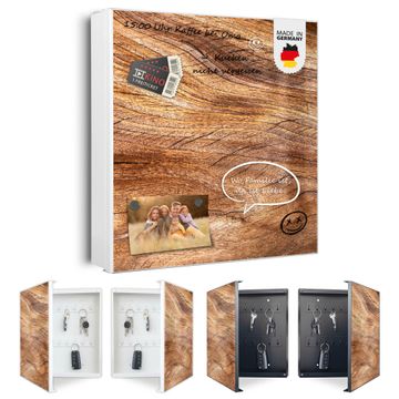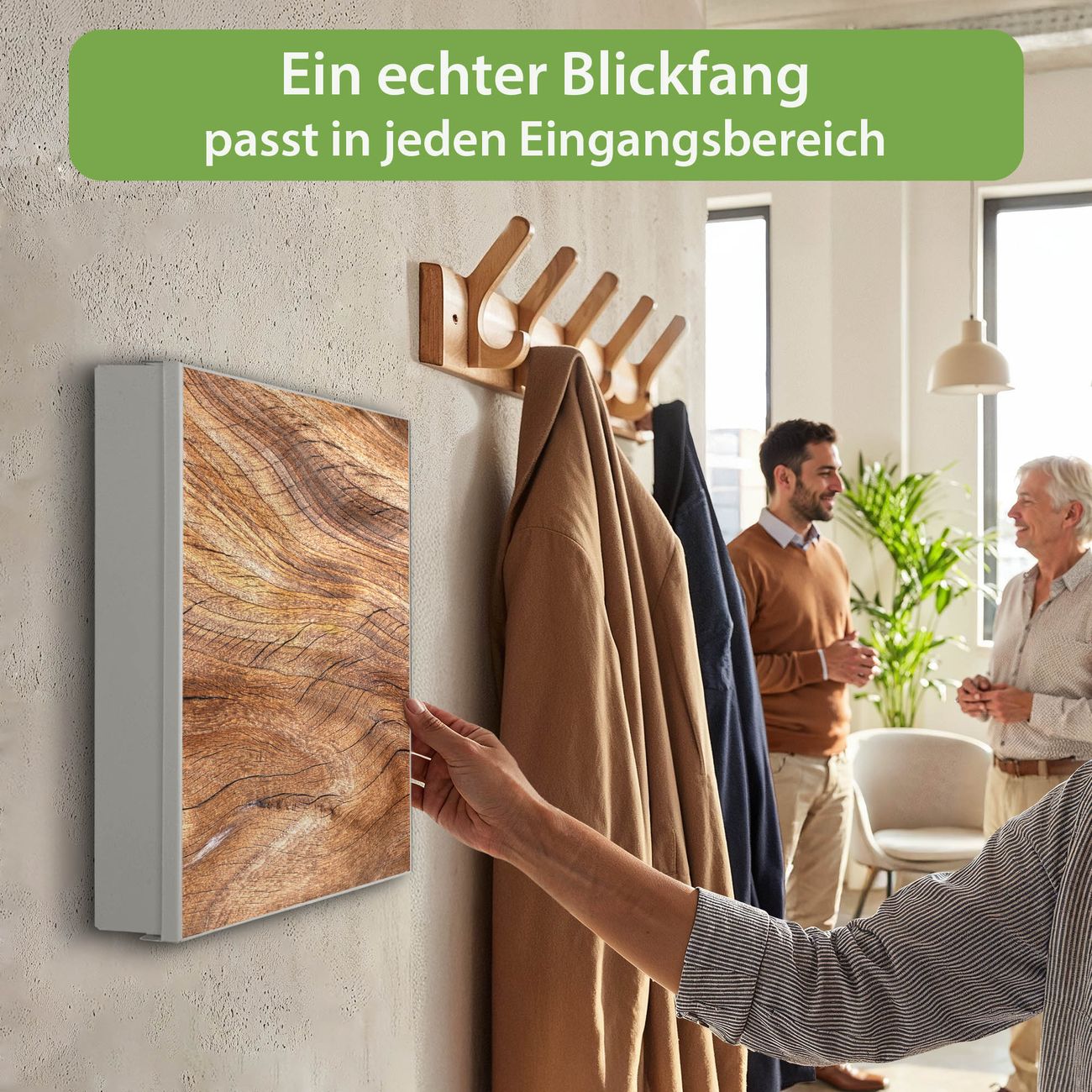 Bringe Ordnung und Eleganz in deinen Eingangsbereich mit dem banjado Schlüsselkasten Motiv Motiv Holz Struktur Fließend. Die moderne Schlüsselbox kombiniert funktionales Design mit hochwertiger Verarbeitung und wird so zu einem echten Hingucker in Flur, Büro oder Ferienwohnung. ✅ Stilvolle Schlüsselaufbewahrung mit Motiv Motiv Holz Struktur Fließend Der Design-Schlüsselkasten Motiv Motiv Holz Struktur Fließend bietet Platz für bis zu 32 Schlüssel, die auf 4 stabilen Reihen mit je 8 Haken übersichtlich verstaut werden. Mit seinen kompakten Maßen von 30 x 30 x 5 cm passt die Schlüsselbox perfekt auch in kleinere Räume. Der weiß lackierte Stahlkorpus mit links angeschlagenem Türscharnier harmoniert mit gedruckten Folie auf der Front und fügt sich nahtlos in jedes Wohnambiente ein. Ob als Schlüsselorganizer für Zuhause oder als praktische Lösung für Büros, Praxen und Gewerbe, der banjado Schlüsselkasten sorgt für Ordnung und Übersicht. Dank der magnetischen, mit Kreidestiften beschreibbaren Folie auf der Front kannst du Notizen anheften oder Termine direkt auf der Oberfläche festhalten. Die Schlüsselbox Motiv Motiv Holz Struktur Fließend zur Wandmontage wird inklusive Befestigungsmaterial geliefert und ist schnell angebracht. So hast du deine Schlüssel jederzeit griffbereit und zugleich stilvoll verstaut. Mit diesem banjado Schlüsselkasten Motiv Motiv Holz Struktur Fließend kombinierst du praktische Aufbewahrung mit stilvollem Wohndesign. Ob privat oder geschäftlich, die Schlüsselbox sorgt für mehr Ordnung, Übersicht und ein wohnliches Ambiente.Vorteile im Überblick