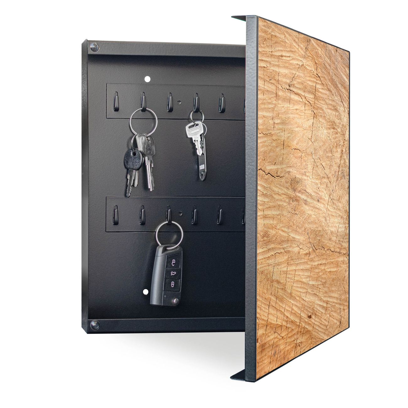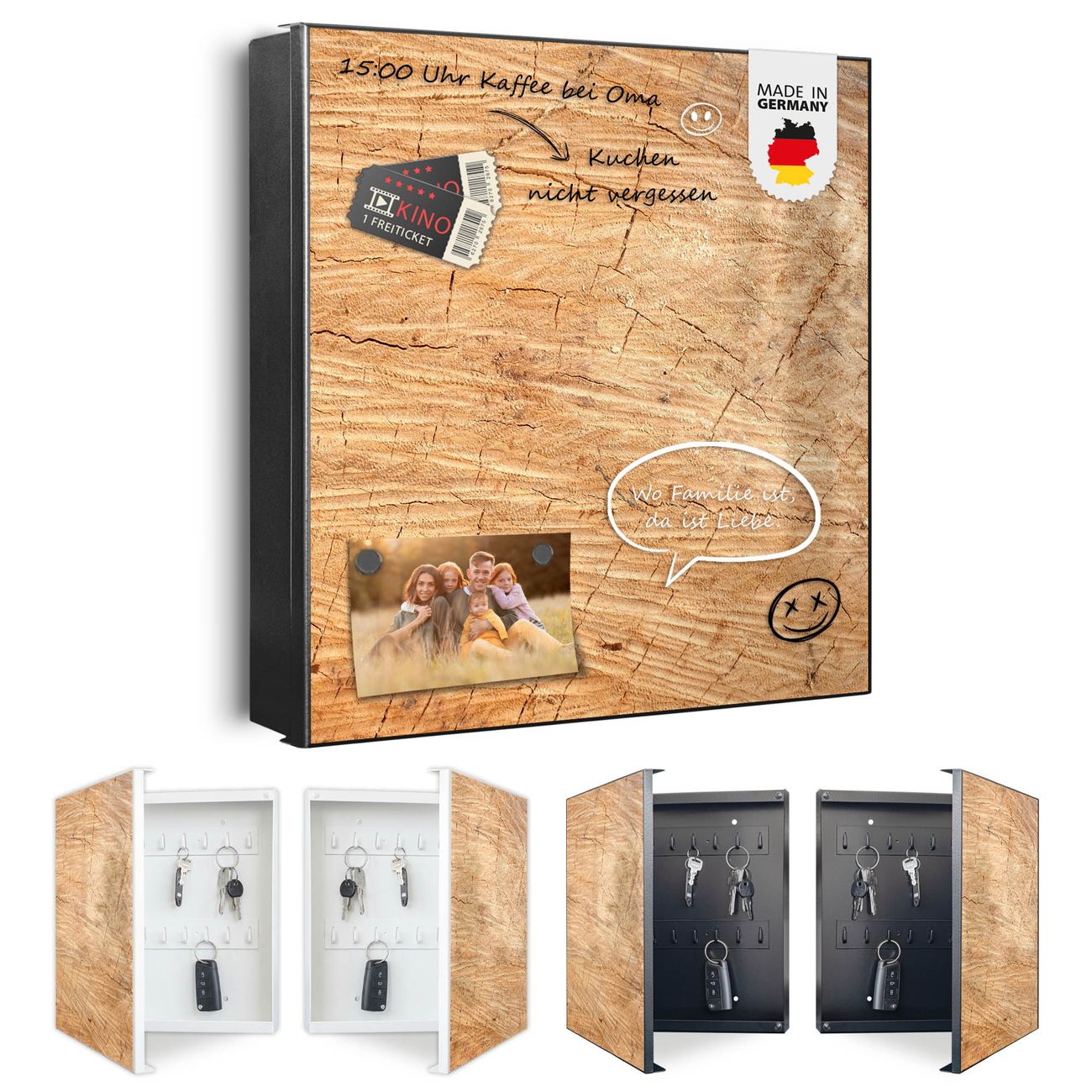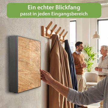 Bringe Ordnung und Eleganz in deinen Eingangsbereich mit dem banjado Schlüsselkasten Motiv Motiv Holz Struktur Honig. Die moderne Schlüsselbox kombiniert funktionales Design mit hochwertiger Verarbeitung und wird so zu einem echten Hingucker in Flur, Büro oder Ferienwohnung. ✅ Stilvolle Schlüsselaufbewahrung mit Motiv Motiv Holz Struktur Honig Der Design-Schlüsselkasten Motiv Motiv Holz Struktur Honig bietet Platz für bis zu 32 Schlüssel, die auf 4 stabilen Reihen mit je 8 Haken übersichtlich verstaut werden. Mit seinen kompakten Maßen von 30 x 30 x 5 cm passt die Schlüsselbox perfekt auch in kleinere Räume. Der schwarz lackierte Stahlkorpus mit rechts angeschlagenem Türscharnier harmoniert mit gedruckten Folie auf der Front und fügt sich nahtlos in jedes Wohnambiente ein. Ob als Schlüsselorganizer für Zuhause oder als praktische Lösung für Büros, Praxen und Gewerbe, der banjado Schlüsselkasten sorgt für Ordnung und Übersicht. Dank der magnetischen, mit Kreidestiften beschreibbaren Folie auf der Front kannst du Notizen anheften oder Termine direkt auf der Oberfläche festhalten. Die Schlüsselbox Motiv Motiv Holz Struktur Honig zur Wandmontage wird inklusive Befestigungsmaterial geliefert und ist schnell angebracht. So hast du deine Schlüssel jederzeit griffbereit und zugleich stilvoll verstaut. Mit diesem banjado Schlüsselkasten Motiv Motiv Holz Struktur Honig kombinierst du praktische Aufbewahrung mit stilvollem Wohndesign. Ob privat oder geschäftlich, die Schlüsselbox sorgt für mehr Ordnung, Übersicht und ein wohnliches Ambiente.Vorteile im Überblick