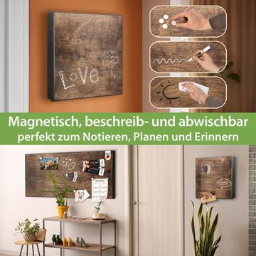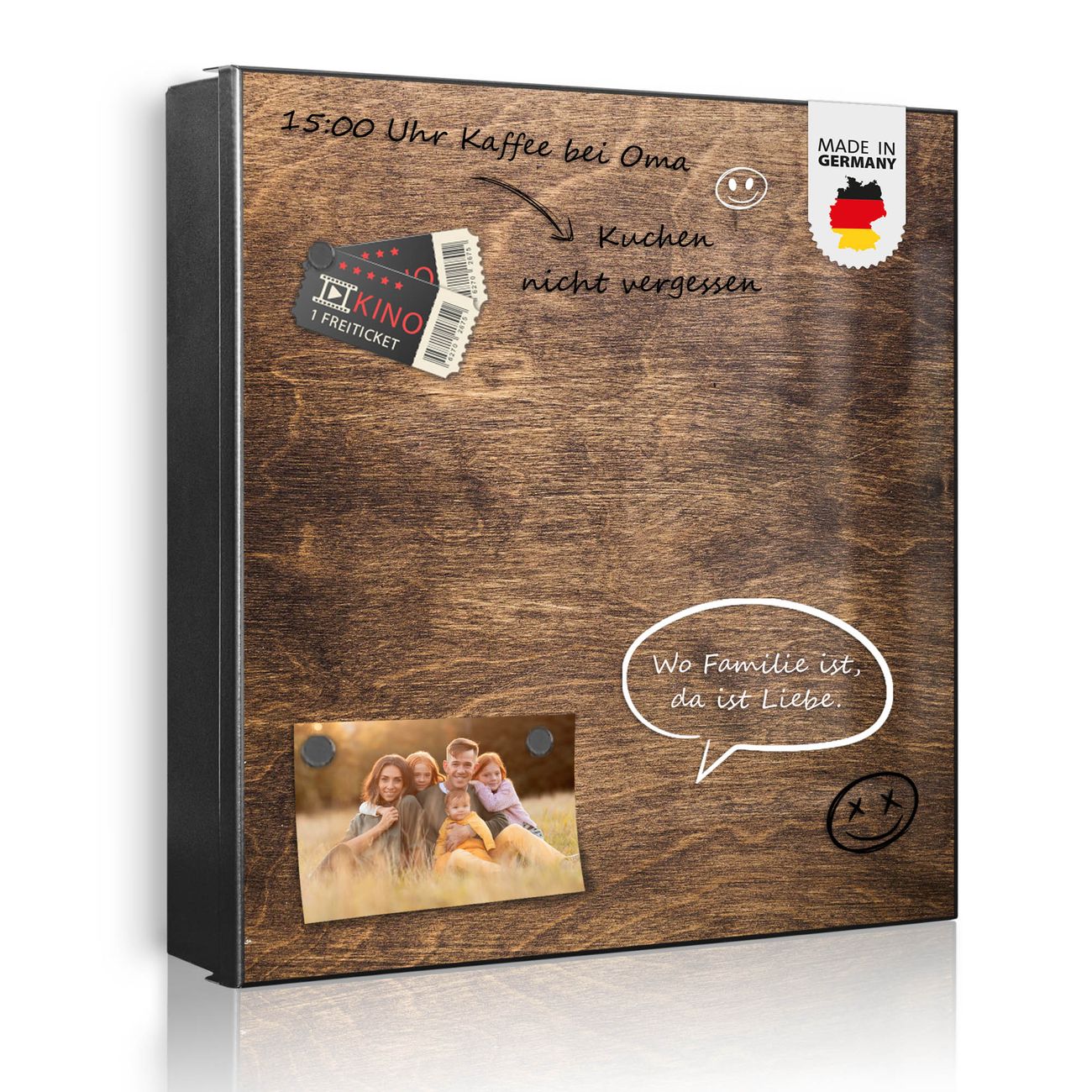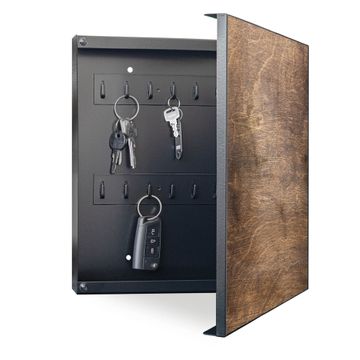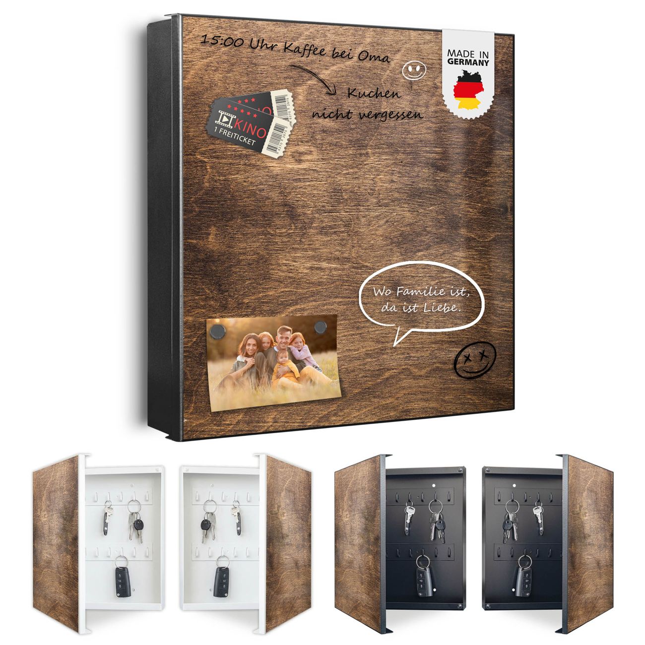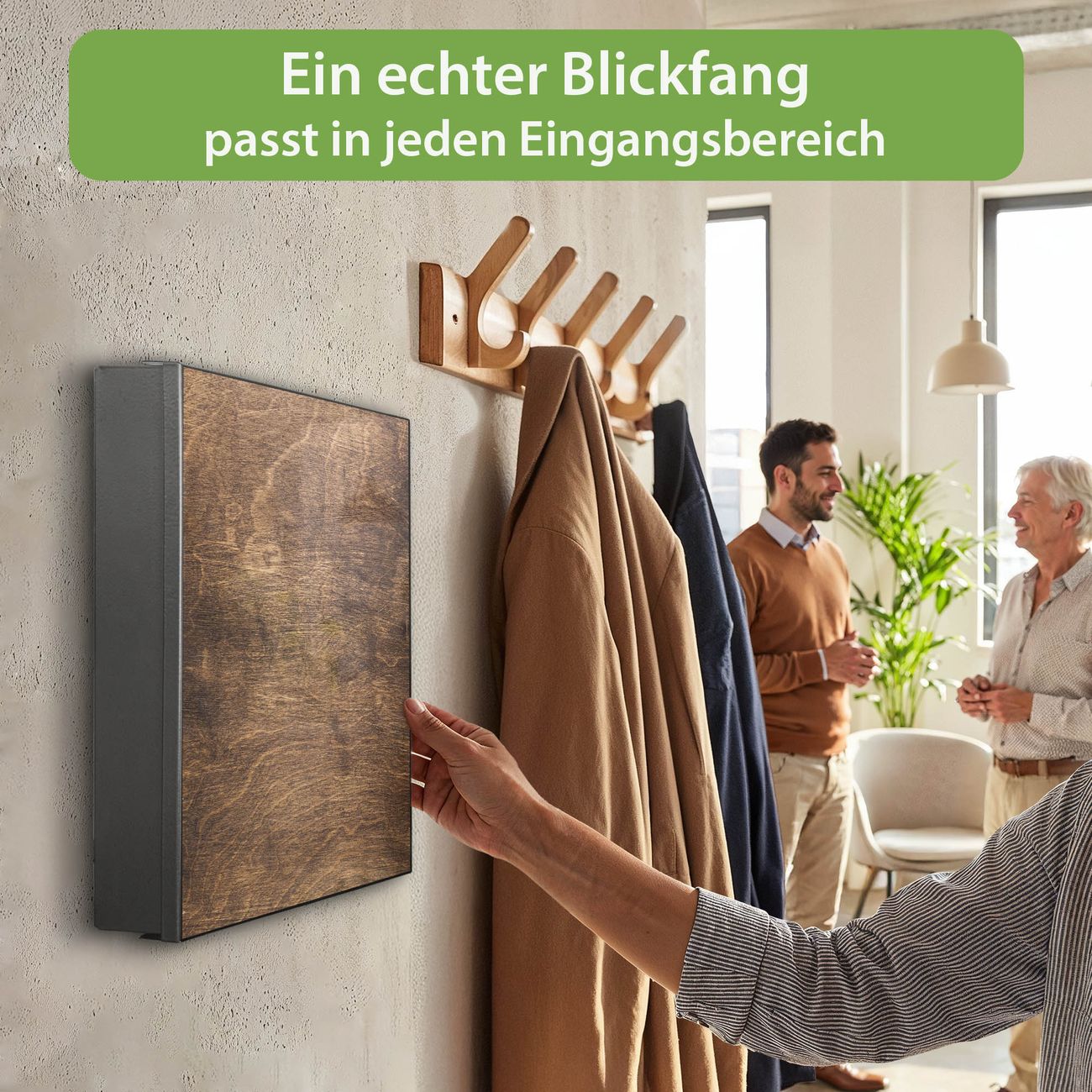 Bringe Ordnung und Eleganz in deinen Eingangsbereich mit dem banjado Schlüsselkasten Motiv Motiv Holz Struktur Warm. Die moderne Schlüsselbox kombiniert funktionales Design mit hochwertiger Verarbeitung und wird so zu einem echten Hingucker in Flur, Büro oder Ferienwohnung. ✅ Stilvolle Schlüsselaufbewahrung mit Motiv Motiv Holz Struktur Warm Der Design-Schlüsselkasten Motiv Motiv Holz Struktur Warm bietet Platz für bis zu 32 Schlüssel, die auf 4 stabilen Reihen mit je 8 Haken übersichtlich verstaut werden. Mit seinen kompakten Maßen von 30 x 30 x 5 cm passt die Schlüsselbox perfekt auch in kleinere Räume. Der schwarz lackierte Stahlkorpus mit rechts angeschlagenem Türscharnier harmoniert mit gedruckten Folie auf der Front und fügt sich nahtlos in jedes Wohnambiente ein. Ob als Schlüsselorganizer für Zuhause oder als praktische Lösung für Büros, Praxen und Gewerbe, der banjado Schlüsselkasten sorgt für Ordnung und Übersicht. Dank der magnetischen, mit Kreidestiften beschreibbaren Folie auf der Front kannst du Notizen anheften oder Termine direkt auf der Oberfläche festhalten. Die Schlüsselbox Motiv Motiv Holz Struktur Warm zur Wandmontage wird inklusive Befestigungsmaterial geliefert und ist schnell angebracht. So hast du deine Schlüssel jederzeit griffbereit und zugleich stilvoll verstaut. Mit diesem banjado Schlüsselkasten Motiv Motiv Holz Struktur Warm kombinierst du praktische Aufbewahrung mit stilvollem Wohndesign. Ob privat oder geschäftlich, die Schlüsselbox sorgt für mehr Ordnung, Übersicht und ein wohnliches Ambiente.Vorteile im Überblick