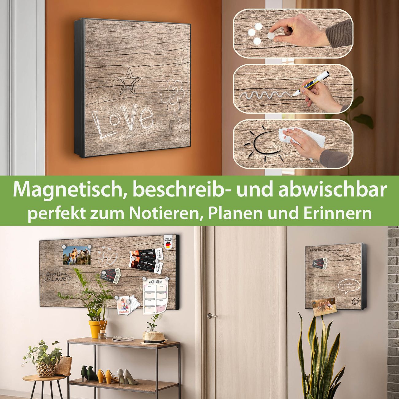 Bringe Ordnung und Eleganz in deinen Eingangsbereich mit dem banjado Schlüsselkasten Motiv Motiv Holz Struktur Warmgrau. Die moderne Schlüsselbox kombiniert funktionales Design mit hochwertiger Verarbeitung und wird so zu einem echten Hingucker in Flur, Büro oder Ferienwohnung. ✅ Stilvolle Schlüsselaufbewahrung mit Motiv Motiv Holz Struktur Warmgrau Der Design-Schlüsselkasten Motiv Motiv Holz Struktur Warmgrau bietet Platz für bis zu 32 Schlüssel, die auf 4 stabilen Reihen mit je 8 Haken übersichtlich verstaut werden. Mit seinen kompakten Maßen von 30 x 30 x 5 cm passt die Schlüsselbox perfekt auch in kleinere Räume. Der schwarz lackierte Stahlkorpus mit links angeschlagenem Türscharnier harmoniert mit gedruckten Folie auf der Front und fügt sich nahtlos in jedes Wohnambiente ein. Ob als Schlüsselorganizer für Zuhause oder als praktische Lösung für Büros, Praxen und Gewerbe, der banjado Schlüsselkasten sorgt für Ordnung und Übersicht. Dank der magnetischen, mit Kreidestiften beschreibbaren Folie auf der Front kannst du Notizen anheften oder Termine direkt auf der Oberfläche festhalten. Die Schlüsselbox Motiv Motiv Holz Struktur Warmgrau zur Wandmontage wird inklusive Befestigungsmaterial geliefert und ist schnell angebracht. So hast du deine Schlüssel jederzeit griffbereit und zugleich stilvoll verstaut. Mit diesem banjado Schlüsselkasten Motiv Motiv Holz Struktur Warmgrau kombinierst du praktische Aufbewahrung mit stilvollem Wohndesign. Ob privat oder geschäftlich, die Schlüsselbox sorgt für mehr Ordnung, Übersicht und ein wohnliches Ambiente.Vorteile im Überblick