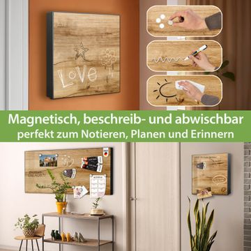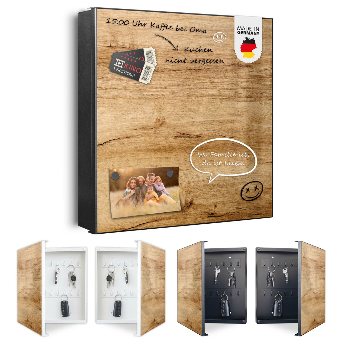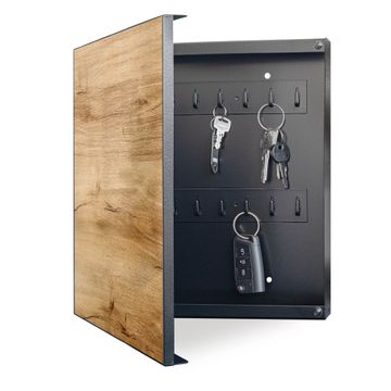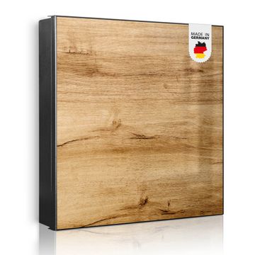 Bringe Ordnung und Eleganz in deinen Eingangsbereich mit dem banjado Schlüsselkasten Motiv Motiv Holzfurnier. Die moderne Schlüsselbox kombiniert funktionales Design mit hochwertiger Verarbeitung und wird so zu einem echten Hingucker in Flur, Büro oder Ferienwohnung. ✅ Stilvolle Schlüsselaufbewahrung mit Motiv Motiv Holzfurnier Der Design-Schlüsselkasten Motiv Motiv Holzfurnier bietet Platz für bis zu 32 Schlüssel, die auf 4 stabilen Reihen mit je 8 Haken übersichtlich verstaut werden. Mit seinen kompakten Maßen von 30 x 30 x 5 cm passt die Schlüsselbox perfekt auch in kleinere Räume. Der schwarz lackierte Stahlkorpus mit links angeschlagenem Türscharnier harmoniert mit gedruckten Folie auf der Front und fügt sich nahtlos in jedes Wohnambiente ein. Ob als Schlüsselorganizer für Zuhause oder als praktische Lösung für Büros, Praxen und Gewerbe, der banjado Schlüsselkasten sorgt für Ordnung und Übersicht. Dank der magnetischen, mit Kreidestiften beschreibbaren Folie auf der Front kannst du Notizen anheften oder Termine direkt auf der Oberfläche festhalten. Die Schlüsselbox Motiv Motiv Holzfurnier zur Wandmontage wird inklusive Befestigungsmaterial geliefert und ist schnell angebracht. So hast du deine Schlüssel jederzeit griffbereit und zugleich stilvoll verstaut. Mit diesem banjado Schlüsselkasten Motiv Motiv Holzfurnier kombinierst du praktische Aufbewahrung mit stilvollem Wohndesign. Ob privat oder geschäftlich, die Schlüsselbox sorgt für mehr Ordnung, Übersicht und ein wohnliches Ambiente.Vorteile im Überblick