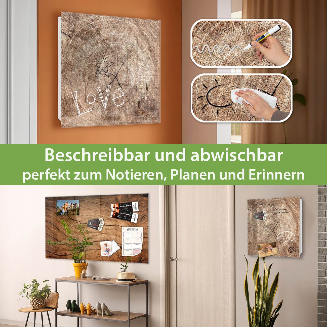 Bringe Ordnung und Eleganz in deinen Eingangsbereich mit dem banjado Schlüsselkasten Motiv Holzkreis mit Rissen. Die moderne Schlüsselbox kombiniert funktionales Design mit hochwertiger Verarbeitung und wird so zu einem echten Hingucker in Flur, Büro oder Ferienwohnung. ✅ Stilvolle Schlüsselaufbewahrung mit Glasfront im Motiv Motiv Holzkreis mit Rissen Der Design-Schlüsselkasten Motiv Holzkreis mit Rissen bietet Platz für bis zu 50 Schlüssel, die auf 5 stabilen Reihen mit je 10 Haken übersichtlich verstaut werden. Mit seinen kompakten Maßen von 30 x 30 x 5 cm passt die Schlüsselbox perfekt auch in kleinere Räume. Der weiß lackierte Stahlkorpus mit rechts angeschlagenem Türscharnier harmoniert mit der Glasfront und fügt sich nahtlos in jedes Wohnambiente ein. Ob als Schlüsselorganizer für Zuhause oder als praktische Lösung für Büros, Praxen und Gewerbe, der banjado Schlüsselkasten sorgt für Ordnung und Übersicht. Dank der magnetischen, mit Kreidestiften beschreibbaren Glasfront kannst du Notizen anheften oder Termine direkt auf der Oberfläche festhalten. Die Schlüsselbox Motiv Holzkreis mit Rissen zur Wandmontage wird inklusive Befestigungsmaterial geliefert und ist schnell angebracht. So hast du deine Schlüssel jederzeit griffbereit und zugleich stilvoll verstaut. Mit diesem banjado Schlüsselkasten Motiv Holzkreis mit Rissen kombinierst du praktische Aufbewahrung mit stilvollem Wohndesign. Ob privat oder geschäftlich, die Schlüsselbox sorgt für mehr Ordnung, Übersicht und ein wohnliches Ambiente.Vorteile im Überblick