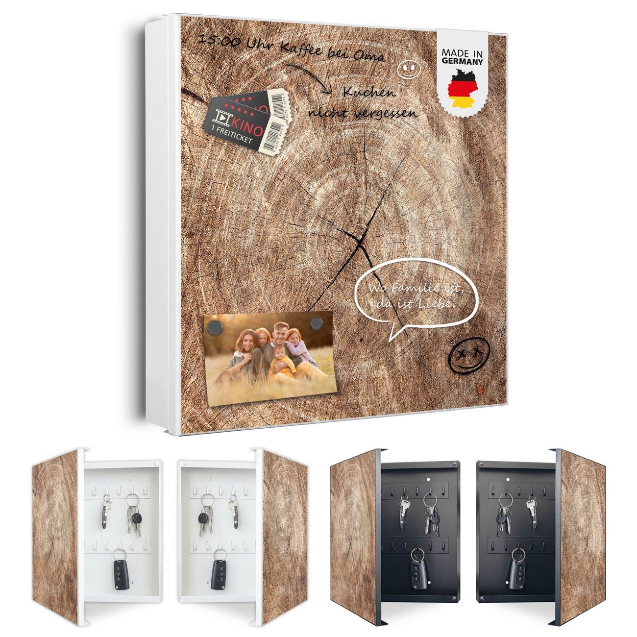 Bringe Ordnung und Eleganz in deinen Eingangsbereich mit dem banjado Schlüsselkasten Motiv Motiv Holzkreis mit Rissen. Die moderne Schlüsselbox kombiniert funktionales Design mit hochwertiger Verarbeitung und wird so zu einem echten Hingucker in Flur, Büro oder Ferienwohnung. ✅ Stilvolle Schlüsselaufbewahrung mit Motiv Motiv Holzkreis mit Rissen Der Design-Schlüsselkasten Motiv Motiv Holzkreis mit Rissen bietet Platz für bis zu 32 Schlüssel, die auf 4 stabilen Reihen mit je 8 Haken übersichtlich verstaut werden. Mit seinen kompakten Maßen von 30 x 30 x 5 cm passt die Schlüsselbox perfekt auch in kleinere Räume. Der weiß lackierte Stahlkorpus mit links angeschlagenem Türscharnier harmoniert mit gedruckten Folie auf der Front und fügt sich nahtlos in jedes Wohnambiente ein. Ob als Schlüsselorganizer für Zuhause oder als praktische Lösung für Büros, Praxen und Gewerbe, der banjado Schlüsselkasten sorgt für Ordnung und Übersicht. Dank der magnetischen, mit Kreidestiften beschreibbaren Folie auf der Front kannst du Notizen anheften oder Termine direkt auf der Oberfläche festhalten. Die Schlüsselbox Motiv Motiv Holzkreis mit Rissen zur Wandmontage wird inklusive Befestigungsmaterial geliefert und ist schnell angebracht. So hast du deine Schlüssel jederzeit griffbereit und zugleich stilvoll verstaut. Mit diesem banjado Schlüsselkasten Motiv Motiv Holzkreis mit Rissen kombinierst du praktische Aufbewahrung mit stilvollem Wohndesign. Ob privat oder geschäftlich, die Schlüsselbox sorgt für mehr Ordnung, Übersicht und ein wohnliches Ambiente.Vorteile im Überblick
