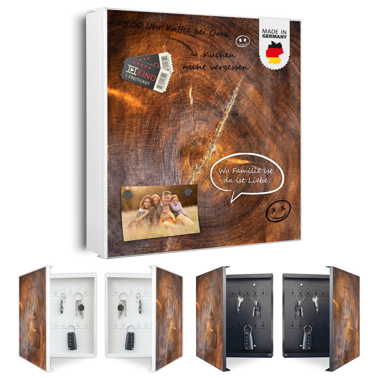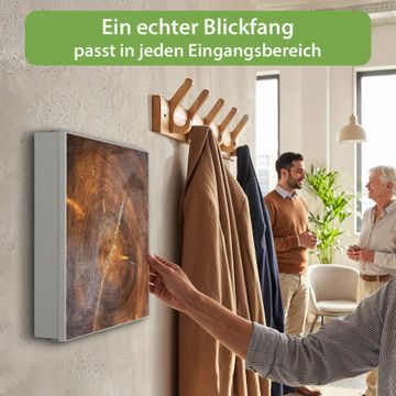 Bringe Ordnung und Eleganz in deinen Eingangsbereich mit dem banjado Schlüsselkasten Motiv Motiv Holzring mit Rissen. Die moderne Schlüsselbox kombiniert funktionales Design mit hochwertiger Verarbeitung und wird so zu einem echten Hingucker in Flur, Büro oder Ferienwohnung. ✅ Stilvolle Schlüsselaufbewahrung mit Motiv Motiv Holzring mit Rissen Der Design-Schlüsselkasten Motiv Motiv Holzring mit Rissen bietet Platz für bis zu 32 Schlüssel, die auf 4 stabilen Reihen mit je 8 Haken übersichtlich verstaut werden. Mit seinen kompakten Maßen von 30 x 30 x 5 cm passt die Schlüsselbox perfekt auch in kleinere Räume. Der weiß lackierte Stahlkorpus mit links angeschlagenem Türscharnier harmoniert mit gedruckten Folie auf der Front und fügt sich nahtlos in jedes Wohnambiente ein. Ob als Schlüsselorganizer für Zuhause oder als praktische Lösung für Büros, Praxen und Gewerbe, der banjado Schlüsselkasten sorgt für Ordnung und Übersicht. Dank der magnetischen, mit Kreidestiften beschreibbaren Folie auf der Front kannst du Notizen anheften oder Termine direkt auf der Oberfläche festhalten. Die Schlüsselbox Motiv Motiv Holzring mit Rissen zur Wandmontage wird inklusive Befestigungsmaterial geliefert und ist schnell angebracht. So hast du deine Schlüssel jederzeit griffbereit und zugleich stilvoll verstaut. Mit diesem banjado Schlüsselkasten Motiv Motiv Holzring mit Rissen kombinierst du praktische Aufbewahrung mit stilvollem Wohndesign. Ob privat oder geschäftlich, die Schlüsselbox sorgt für mehr Ordnung, Übersicht und ein wohnliches Ambiente.Vorteile im Überblick