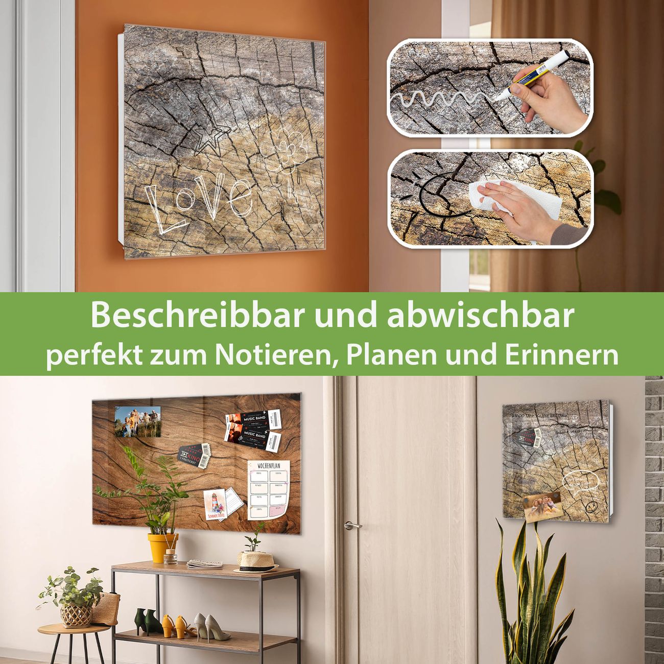 Bringe Ordnung und Eleganz in deinen Eingangsbereich mit dem banjado Schlüsselkasten Motiv Holzrisse. Die moderne Schlüsselbox kombiniert funktionales Design mit hochwertiger Verarbeitung und wird so zu einem echten Hingucker in Flur, Büro oder Ferienwohnung. ✅ Stilvolle Schlüsselaufbewahrung mit Glasfront im Motiv Motiv Holzrisse Der Design-Schlüsselkasten Motiv Holzrisse bietet Platz für bis zu 50 Schlüssel, die auf 5 stabilen Reihen mit je 10 Haken übersichtlich verstaut werden. Mit seinen kompakten Maßen von 30 x 30 x 5 cm passt die Schlüsselbox perfekt auch in kleinere Räume. Der weiß lackierte Stahlkorpus mit rechts angeschlagenem Türscharnier harmoniert mit der Glasfront und fügt sich nahtlos in jedes Wohnambiente ein. Ob als Schlüsselorganizer für Zuhause oder als praktische Lösung für Büros, Praxen und Gewerbe, der banjado Schlüsselkasten sorgt für Ordnung und Übersicht. Dank der magnetischen, mit Kreidestiften beschreibbaren Glasfront kannst du Notizen anheften oder Termine direkt auf der Oberfläche festhalten. Die Schlüsselbox Motiv Holzrisse zur Wandmontage wird inklusive Befestigungsmaterial geliefert und ist schnell angebracht. So hast du deine Schlüssel jederzeit griffbereit und zugleich stilvoll verstaut. Mit diesem banjado Schlüsselkasten Motiv Holzrisse kombinierst du praktische Aufbewahrung mit stilvollem Wohndesign. Ob privat oder geschäftlich, die Schlüsselbox sorgt für mehr Ordnung, Übersicht und ein wohnliches Ambiente.Vorteile im Überblick
