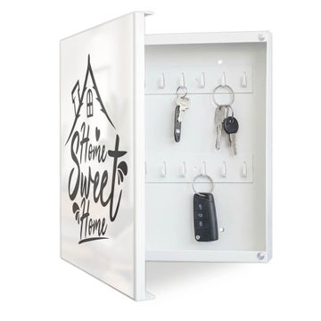 Bringe Ordnung und Eleganz in deinen Eingangsbereich mit dem banjado Schlüsselkasten Motiv Motiv Home sweet Home 4. Die moderne Schlüsselbox kombiniert funktionales Design mit hochwertiger Verarbeitung und wird so zu einem echten Hingucker in Flur, Büro oder Ferienwohnung. ✅ Stilvolle Schlüsselaufbewahrung mit Motiv Motiv Home sweet Home 4 Der Design-Schlüsselkasten Motiv Motiv Home sweet Home 4 bietet Platz für bis zu 32 Schlüssel, die auf 4 stabilen Reihen mit je 8 Haken übersichtlich verstaut werden. Mit seinen kompakten Maßen von 30 x 30 x 5 cm passt die Schlüsselbox perfekt auch in kleinere Räume. Der weiß lackierte Stahlkorpus mit links angeschlagenem Türscharnier harmoniert mit gedruckten Folie auf der Front und fügt sich nahtlos in jedes Wohnambiente ein. Ob als Schlüsselorganizer für Zuhause oder als praktische Lösung für Büros, Praxen und Gewerbe, der banjado Schlüsselkasten sorgt für Ordnung und Übersicht. Dank der magnetischen, mit Kreidestiften beschreibbaren Folie auf der Front kannst du Notizen anheften oder Termine direkt auf der Oberfläche festhalten. Die Schlüsselbox Motiv Motiv Home sweet Home 4 zur Wandmontage wird inklusive Befestigungsmaterial geliefert und ist schnell angebracht. So hast du deine Schlüssel jederzeit griffbereit und zugleich stilvoll verstaut. Mit diesem banjado Schlüsselkasten Motiv Motiv Home sweet Home 4 kombinierst du praktische Aufbewahrung mit stilvollem Wohndesign. Ob privat oder geschäftlich, die Schlüsselbox sorgt für mehr Ordnung, Übersicht und ein wohnliches Ambiente.Vorteile im Überblick