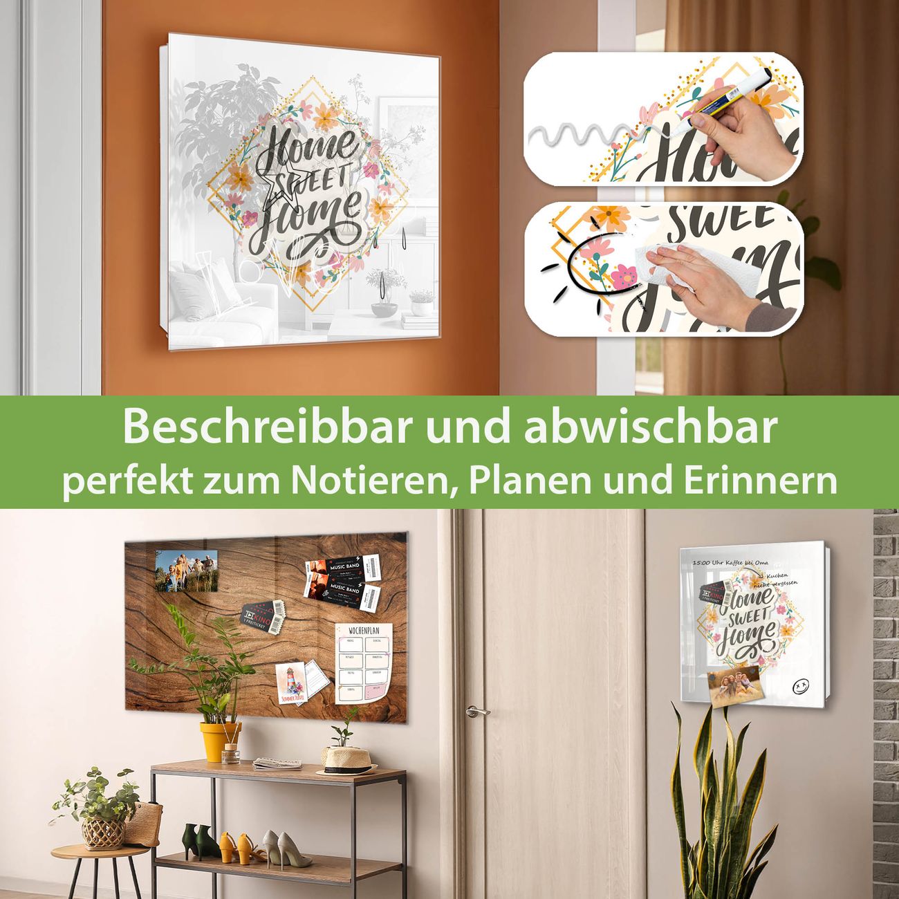 Bringe Ordnung und Eleganz in deinen Eingangsbereich mit dem banjado Schlüsselkasten Motiv Motiv Home Sweet Home Schild. Die moderne Schlüsselbox kombiniert funktionales Design mit hochwertiger Verarbeitung und wird so zu einem echten Hingucker in Flur, Büro oder Ferienwohnung. ✅ Stilvolle Schlüsselaufbewahrung mit Glasfront im Motiv Motiv Home Sweet Home Schild Der Design-Schlüsselkasten Motiv Motiv Home Sweet Home Schild bietet Platz für bis zu 50 Schlüssel, die auf 5 stabilen Reihen mit je 10 Haken übersichtlich verstaut werden. Mit seinen kompakten Maßen von 30 x 30 x 5 cm passt die Schlüsselbox perfekt auch in kleinere Räume. Der weiß lackierte Stahlkorpus mit rechts angeschlagenem Türscharnier harmoniert mit der Glasfront und fügt sich nahtlos in jedes Wohnambiente ein. Ob als Schlüsselorganizer für Zuhause oder als praktische Lösung für Büros, Praxen und Gewerbe, der banjado Schlüsselkasten sorgt für Ordnung und Übersicht. Dank der magnetischen, mit Kreidestiften beschreibbaren Glasfront kannst du Notizen anheften oder Termine direkt auf der Oberfläche festhalten. Die Schlüsselbox Motiv Motiv Home Sweet Home Schild zur Wandmontage wird inklusive Befestigungsmaterial geliefert und ist schnell angebracht. So hast du deine Schlüssel jederzeit griffbereit und zugleich stilvoll verstaut. Mit diesem banjado Schlüsselkasten Motiv Motiv Home Sweet Home Schild kombinierst du praktische Aufbewahrung mit stilvollem Wohndesign. Ob privat oder geschäftlich, die Schlüsselbox sorgt für mehr Ordnung, Übersicht und ein wohnliches Ambiente.Vorteile im Überblick