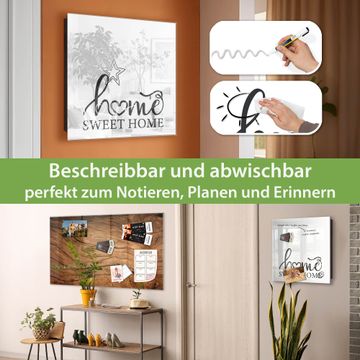 Bringe Ordnung und Eleganz in deinen Eingangsbereich mit dem banjado Schlüsselkasten Motiv Motiv Home Sweet Home Schriftzug. Die moderne Schlüsselbox kombiniert funktionales Design mit hochwertiger Verarbeitung und wird so zu einem echten Hingucker in Flur, Büro oder Ferienwohnung. ✅ Stilvolle Schlüsselaufbewahrung mit Glasfront im Motiv Motiv Home Sweet Home Schriftzug Der Design-Schlüsselkasten Motiv Motiv Home Sweet Home Schriftzug bietet Platz für bis zu 50 Schlüssel, die auf 5 stabilen Reihen mit je 10 Haken übersichtlich verstaut werden. Mit seinen kompakten Maßen von 30 x 30 x 5 cm passt die Schlüsselbox perfekt auch in kleinere Räume. Der schwarz lackierte Stahlkorpus mit rechts angeschlagenem Türscharnier harmoniert mit der Glasfront und fügt sich nahtlos in jedes Wohnambiente ein. Ob als Schlüsselorganizer für Zuhause oder als praktische Lösung für Büros, Praxen und Gewerbe, der banjado Schlüsselkasten sorgt für Ordnung und Übersicht. Dank der magnetischen, mit Kreidestiften beschreibbaren Glasfront kannst du Notizen anheften oder Termine direkt auf der Oberfläche festhalten. Die Schlüsselbox Motiv Motiv Home Sweet Home Schriftzug zur Wandmontage wird inklusive Befestigungsmaterial geliefert und ist schnell angebracht. So hast du deine Schlüssel jederzeit griffbereit und zugleich stilvoll verstaut. Mit diesem banjado Schlüsselkasten Motiv Motiv Home Sweet Home Schriftzug kombinierst du praktische Aufbewahrung mit stilvollem Wohndesign. Ob privat oder geschäftlich, die Schlüsselbox sorgt für mehr Ordnung, Übersicht und ein wohnliches Ambiente.Vorteile im Überblick