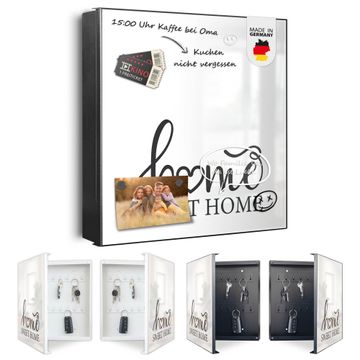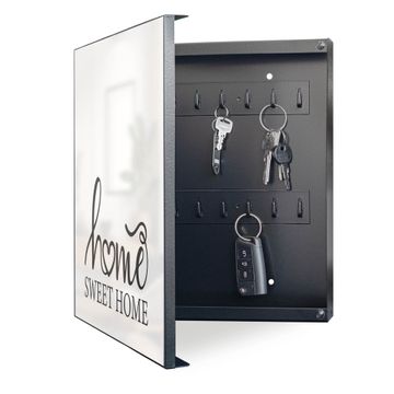 Bringe Ordnung und Eleganz in deinen Eingangsbereich mit dem banjado Schlüsselkasten Motiv Motiv Home Sweet Home Schriftzug. Die moderne Schlüsselbox kombiniert funktionales Design mit hochwertiger Verarbeitung und wird so zu einem echten Hingucker in Flur, Büro oder Ferienwohnung. ✅ Stilvolle Schlüsselaufbewahrung mit Motiv Motiv Home Sweet Home Schriftzug Der Design-Schlüsselkasten Motiv Motiv Home Sweet Home Schriftzug bietet Platz für bis zu 32 Schlüssel, die auf 4 stabilen Reihen mit je 8 Haken übersichtlich verstaut werden. Mit seinen kompakten Maßen von 30 x 30 x 5 cm passt die Schlüsselbox perfekt auch in kleinere Räume. Der schwarz lackierte Stahlkorpus mit links angeschlagenem Türscharnier harmoniert mit gedruckten Folie auf der Front und fügt sich nahtlos in jedes Wohnambiente ein. Ob als Schlüsselorganizer für Zuhause oder als praktische Lösung für Büros, Praxen und Gewerbe, der banjado Schlüsselkasten sorgt für Ordnung und Übersicht. Dank der magnetischen, mit Kreidestiften beschreibbaren Folie auf der Front kannst du Notizen anheften oder Termine direkt auf der Oberfläche festhalten. Die Schlüsselbox Motiv Motiv Home Sweet Home Schriftzug zur Wandmontage wird inklusive Befestigungsmaterial geliefert und ist schnell angebracht. So hast du deine Schlüssel jederzeit griffbereit und zugleich stilvoll verstaut. Mit diesem banjado Schlüsselkasten Motiv Motiv Home Sweet Home Schriftzug kombinierst du praktische Aufbewahrung mit stilvollem Wohndesign. Ob privat oder geschäftlich, die Schlüsselbox sorgt für mehr Ordnung, Übersicht und ein wohnliches Ambiente.Vorteile im Überblick