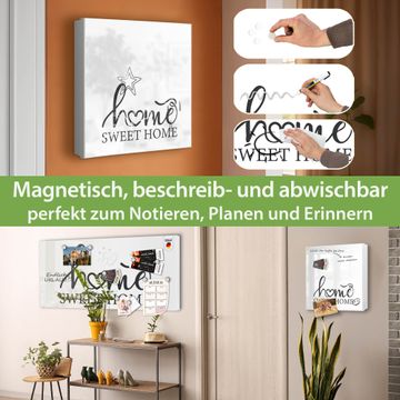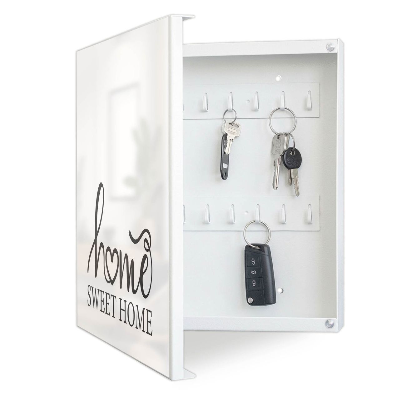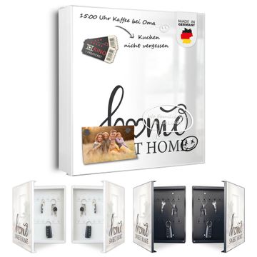 Bringe Ordnung und Eleganz in deinen Eingangsbereich mit dem banjado Schlüsselkasten Motiv Motiv Home Sweet Home Schriftzug. Die moderne Schlüsselbox kombiniert funktionales Design mit hochwertiger Verarbeitung und wird so zu einem echten Hingucker in Flur, Büro oder Ferienwohnung. ✅ Stilvolle Schlüsselaufbewahrung mit Motiv Motiv Home Sweet Home Schriftzug Der Design-Schlüsselkasten Motiv Motiv Home Sweet Home Schriftzug bietet Platz für bis zu 32 Schlüssel, die auf 4 stabilen Reihen mit je 8 Haken übersichtlich verstaut werden. Mit seinen kompakten Maßen von 30 x 30 x 5 cm passt die Schlüsselbox perfekt auch in kleinere Räume. Der weiß lackierte Stahlkorpus mit links angeschlagenem Türscharnier harmoniert mit gedruckten Folie auf der Front und fügt sich nahtlos in jedes Wohnambiente ein. Ob als Schlüsselorganizer für Zuhause oder als praktische Lösung für Büros, Praxen und Gewerbe, der banjado Schlüsselkasten sorgt für Ordnung und Übersicht. Dank der magnetischen, mit Kreidestiften beschreibbaren Folie auf der Front kannst du Notizen anheften oder Termine direkt auf der Oberfläche festhalten. Die Schlüsselbox Motiv Motiv Home Sweet Home Schriftzug zur Wandmontage wird inklusive Befestigungsmaterial geliefert und ist schnell angebracht. So hast du deine Schlüssel jederzeit griffbereit und zugleich stilvoll verstaut. Mit diesem banjado Schlüsselkasten Motiv Motiv Home Sweet Home Schriftzug kombinierst du praktische Aufbewahrung mit stilvollem Wohndesign. Ob privat oder geschäftlich, die Schlüsselbox sorgt für mehr Ordnung, Übersicht und ein wohnliches Ambiente.Vorteile im Überblick