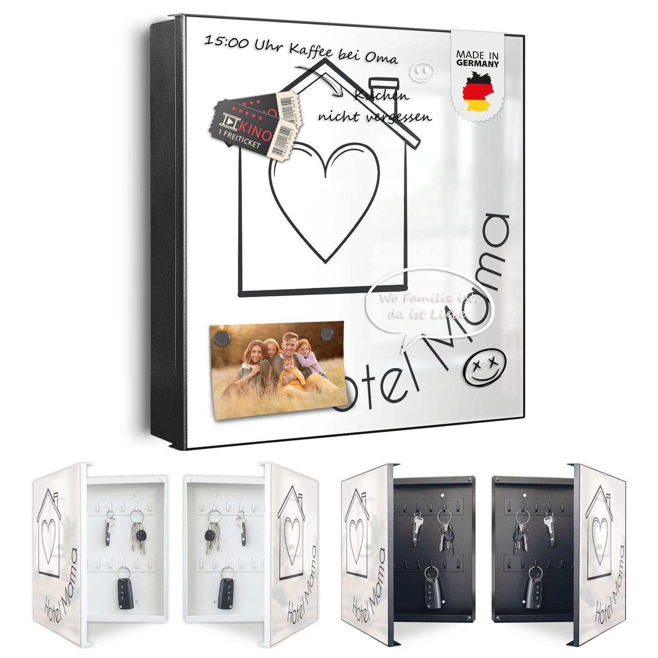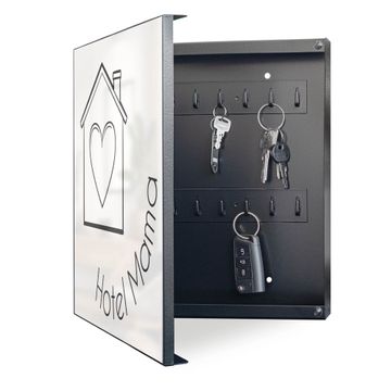 Bringe Ordnung und Eleganz in deinen Eingangsbereich mit dem banjado Schlüsselkasten Motiv Motiv Hotel Mama Haus mit Herz 2. Die moderne Schlüsselbox kombiniert funktionales Design mit hochwertiger Verarbeitung und wird so zu einem echten Hingucker in Flur, Büro oder Ferienwohnung. ✅ Stilvolle Schlüsselaufbewahrung mit Motiv Motiv Hotel Mama Haus mit Herz 2 Der Design-Schlüsselkasten Motiv Motiv Hotel Mama Haus mit Herz 2 bietet Platz für bis zu 32 Schlüssel, die auf 4 stabilen Reihen mit je 8 Haken übersichtlich verstaut werden. Mit seinen kompakten Maßen von 30 x 30 x 5 cm passt die Schlüsselbox perfekt auch in kleinere Räume. Der schwarz lackierte Stahlkorpus mit links angeschlagenem Türscharnier harmoniert mit gedruckten Folie auf der Front und fügt sich nahtlos in jedes Wohnambiente ein. Ob als Schlüsselorganizer für Zuhause oder als praktische Lösung für Büros, Praxen und Gewerbe, der banjado Schlüsselkasten sorgt für Ordnung und Übersicht. Dank der magnetischen, mit Kreidestiften beschreibbaren Folie auf der Front kannst du Notizen anheften oder Termine direkt auf der Oberfläche festhalten. Die Schlüsselbox Motiv Motiv Hotel Mama Haus mit Herz 2 zur Wandmontage wird inklusive Befestigungsmaterial geliefert und ist schnell angebracht. So hast du deine Schlüssel jederzeit griffbereit und zugleich stilvoll verstaut. Mit diesem banjado Schlüsselkasten Motiv Motiv Hotel Mama Haus mit Herz 2 kombinierst du praktische Aufbewahrung mit stilvollem Wohndesign. Ob privat oder geschäftlich, die Schlüsselbox sorgt für mehr Ordnung, Übersicht und ein wohnliches Ambiente.Vorteile im Überblick