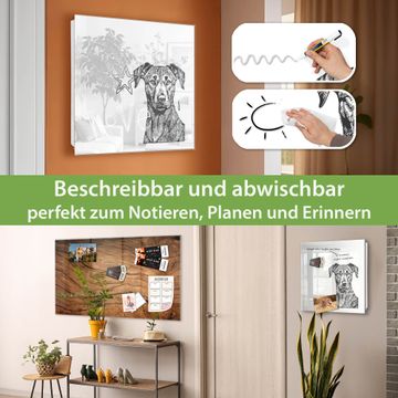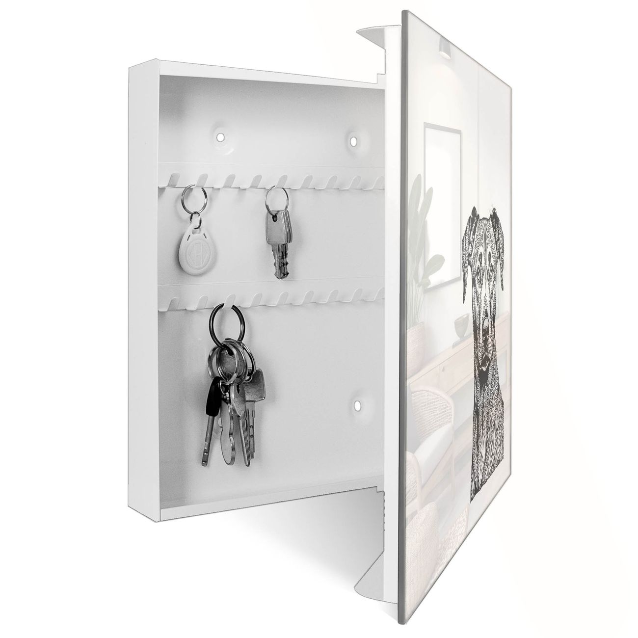 Bringe Ordnung und Eleganz in deinen Eingangsbereich mit dem banjado Schlüsselkasten Motiv Motiv Hundeskizze. Die moderne Schlüsselbox kombiniert funktionales Design mit hochwertiger Verarbeitung und wird so zu einem echten Hingucker in Flur, Büro oder Ferienwohnung. ✅ Stilvolle Schlüsselaufbewahrung mit Glasfront im Motiv Motiv Hundeskizze Der Design-Schlüsselkasten Motiv Motiv Hundeskizze bietet Platz für bis zu 50 Schlüssel, die auf 5 stabilen Reihen mit je 10 Haken übersichtlich verstaut werden. Mit seinen kompakten Maßen von 30 x 30 x 5 cm passt die Schlüsselbox perfekt auch in kleinere Räume. Der weiß lackierte Stahlkorpus mit rechts angeschlagenem Türscharnier harmoniert mit der Glasfront und fügt sich nahtlos in jedes Wohnambiente ein. Ob als Schlüsselorganizer für Zuhause oder als praktische Lösung für Büros, Praxen und Gewerbe, der banjado Schlüsselkasten sorgt für Ordnung und Übersicht. Dank der magnetischen, mit Kreidestiften beschreibbaren Glasfront kannst du Notizen anheften oder Termine direkt auf der Oberfläche festhalten. Die Schlüsselbox Motiv Motiv Hundeskizze zur Wandmontage wird inklusive Befestigungsmaterial geliefert und ist schnell angebracht. So hast du deine Schlüssel jederzeit griffbereit und zugleich stilvoll verstaut. Mit diesem banjado Schlüsselkasten Motiv Motiv Hundeskizze kombinierst du praktische Aufbewahrung mit stilvollem Wohndesign. Ob privat oder geschäftlich, die Schlüsselbox sorgt für mehr Ordnung, Übersicht und ein wohnliches Ambiente.Vorteile im Überblick