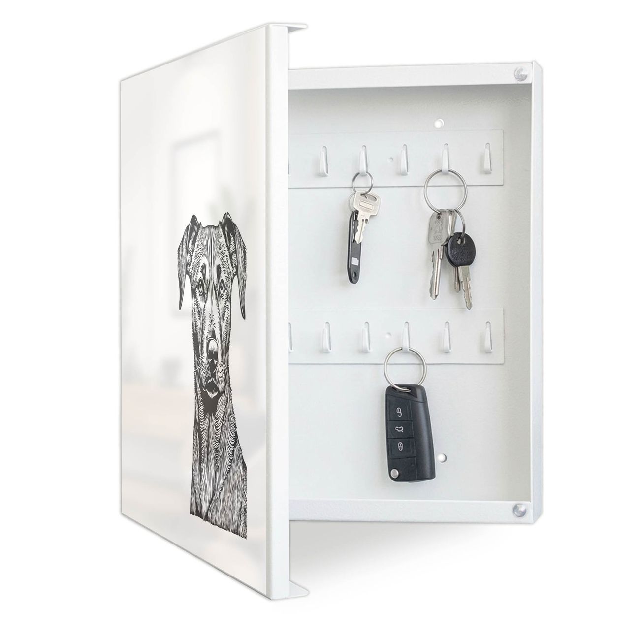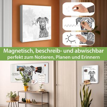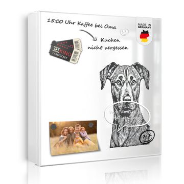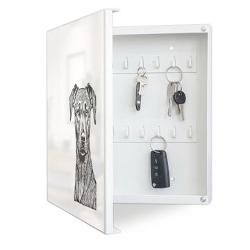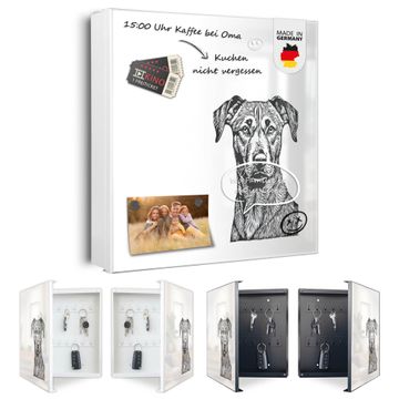 Bringe Ordnung und Eleganz in deinen Eingangsbereich mit dem banjado Schlüsselkasten Motiv Motiv Hundeskizze 1. Die moderne Schlüsselbox kombiniert funktionales Design mit hochwertiger Verarbeitung und wird so zu einem echten Hingucker in Flur, Büro oder Ferienwohnung. ✅ Stilvolle Schlüsselaufbewahrung mit Motiv Motiv Hundeskizze 1 Der Design-Schlüsselkasten Motiv Motiv Hundeskizze 1 bietet Platz für bis zu 32 Schlüssel, die auf 4 stabilen Reihen mit je 8 Haken übersichtlich verstaut werden. Mit seinen kompakten Maßen von 30 x 30 x 5 cm passt die Schlüsselbox perfekt auch in kleinere Räume. Der weiß lackierte Stahlkorpus mit links angeschlagenem Türscharnier harmoniert mit gedruckten Folie auf der Front und fügt sich nahtlos in jedes Wohnambiente ein. Ob als Schlüsselorganizer für Zuhause oder als praktische Lösung für Büros, Praxen und Gewerbe, der banjado Schlüsselkasten sorgt für Ordnung und Übersicht. Dank der magnetischen, mit Kreidestiften beschreibbaren Folie auf der Front kannst du Notizen anheften oder Termine direkt auf der Oberfläche festhalten. Die Schlüsselbox Motiv Motiv Hundeskizze 1 zur Wandmontage wird inklusive Befestigungsmaterial geliefert und ist schnell angebracht. So hast du deine Schlüssel jederzeit griffbereit und zugleich stilvoll verstaut. Mit diesem banjado Schlüsselkasten Motiv Motiv Hundeskizze 1 kombinierst du praktische Aufbewahrung mit stilvollem Wohndesign. Ob privat oder geschäftlich, die Schlüsselbox sorgt für mehr Ordnung, Übersicht und ein wohnliches Ambiente.Vorteile im Überblick