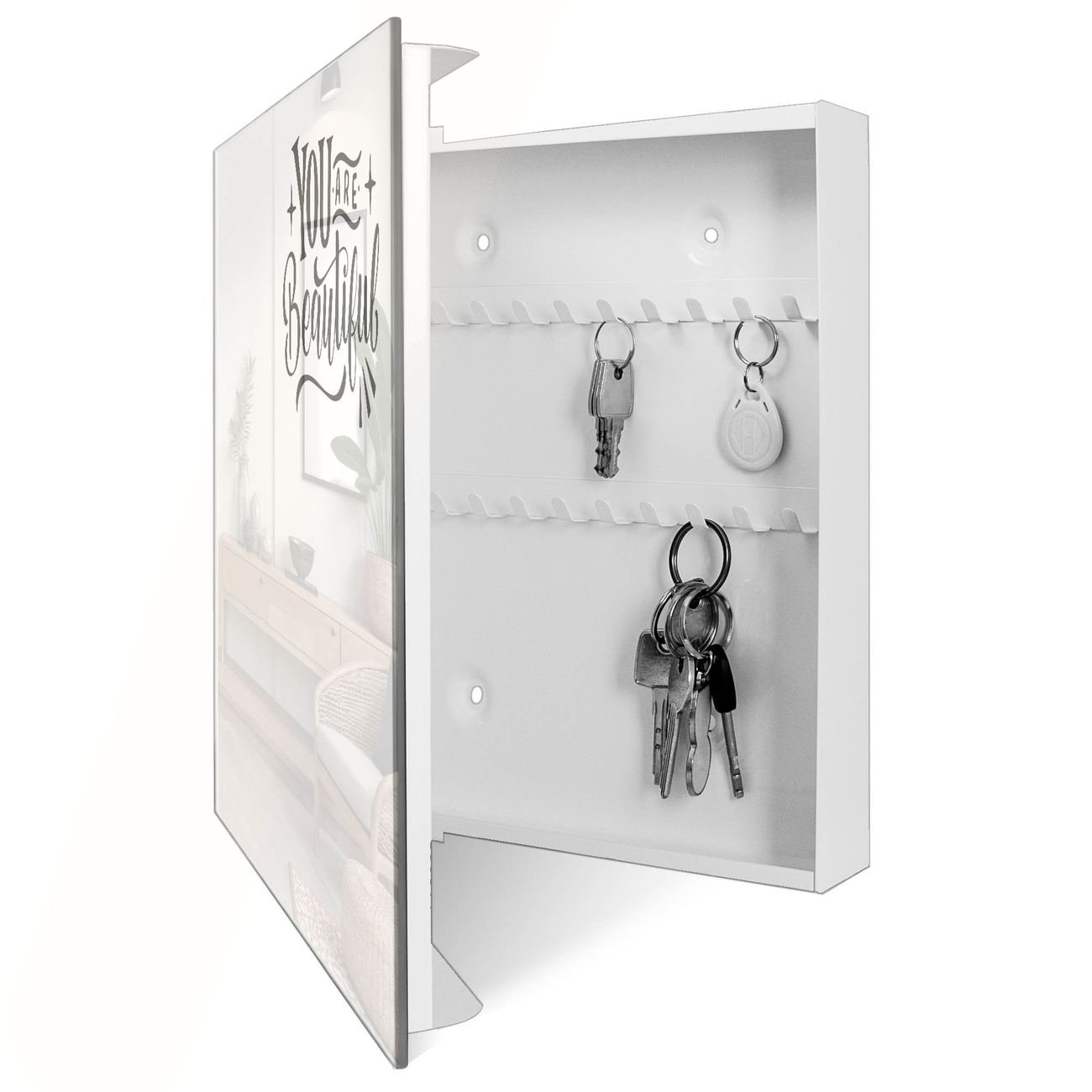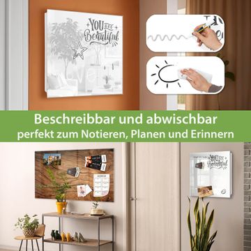 Bringe Ordnung und Eleganz in deinen Eingangsbereich mit dem banjado Schlüsselkasten Motiv Motiv Inspirierende Botschaft. Die moderne Schlüsselbox kombiniert funktionales Design mit hochwertiger Verarbeitung und wird so zu einem echten Hingucker in Flur, Büro oder Ferienwohnung. ✅ Stilvolle Schlüsselaufbewahrung mit Glasfront im Motiv Motiv Inspirierende Botschaft Der Design-Schlüsselkasten Motiv Motiv Inspirierende Botschaft bietet Platz für bis zu 50 Schlüssel, die auf 5 stabilen Reihen mit je 10 Haken übersichtlich verstaut werden. Mit seinen kompakten Maßen von 30 x 30 x 5 cm passt die Schlüsselbox perfekt auch in kleinere Räume. Der weiß lackierte Stahlkorpus mit rechts angeschlagenem Türscharnier harmoniert mit der Glasfront und fügt sich nahtlos in jedes Wohnambiente ein. Ob als Schlüsselorganizer für Zuhause oder als praktische Lösung für Büros, Praxen und Gewerbe, der banjado Schlüsselkasten sorgt für Ordnung und Übersicht. Dank der magnetischen, mit Kreidestiften beschreibbaren Glasfront kannst du Notizen anheften oder Termine direkt auf der Oberfläche festhalten. Die Schlüsselbox Motiv Motiv Inspirierende Botschaft zur Wandmontage wird inklusive Befestigungsmaterial geliefert und ist schnell angebracht. So hast du deine Schlüssel jederzeit griffbereit und zugleich stilvoll verstaut. Mit diesem banjado Schlüsselkasten Motiv Motiv Inspirierende Botschaft kombinierst du praktische Aufbewahrung mit stilvollem Wohndesign. Ob privat oder geschäftlich, die Schlüsselbox sorgt für mehr Ordnung, Übersicht und ein wohnliches Ambiente.Vorteile im Überblick