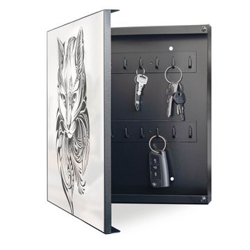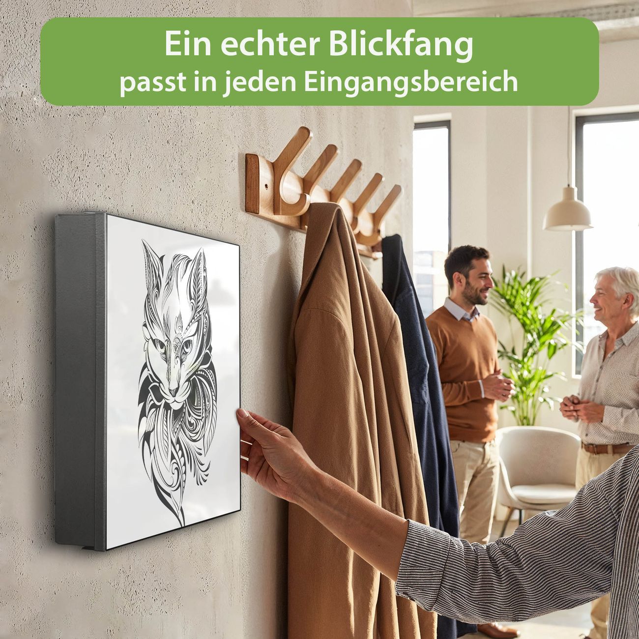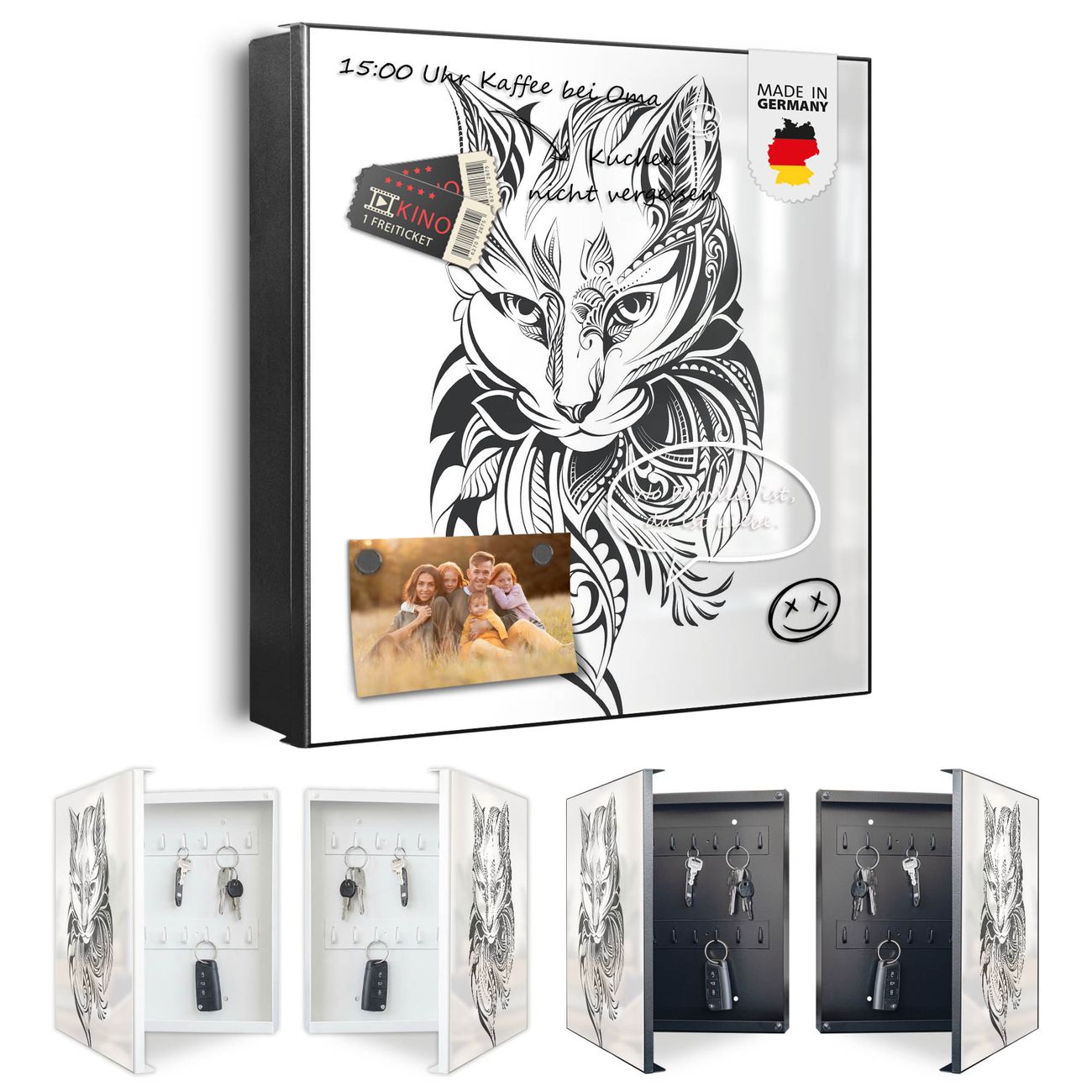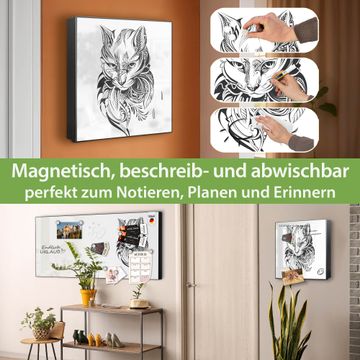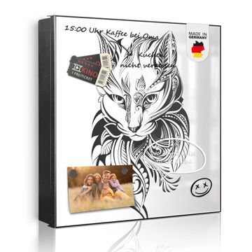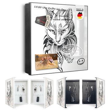 Bringe Ordnung und Eleganz in deinen Eingangsbereich mit dem banjado Schlüsselkasten Motiv Motiv Katze 2. Die moderne Schlüsselbox kombiniert funktionales Design mit hochwertiger Verarbeitung und wird so zu einem echten Hingucker in Flur, Büro oder Ferienwohnung. ✅ Stilvolle Schlüsselaufbewahrung mit Motiv Motiv Katze 2 Der Design-Schlüsselkasten Motiv Motiv Katze 2 bietet Platz für bis zu 32 Schlüssel, die auf 4 stabilen Reihen mit je 8 Haken übersichtlich verstaut werden. Mit seinen kompakten Maßen von 30 x 30 x 5 cm passt die Schlüsselbox perfekt auch in kleinere Räume. Der schwarz lackierte Stahlkorpus mit links angeschlagenem Türscharnier harmoniert mit gedruckten Folie auf der Front und fügt sich nahtlos in jedes Wohnambiente ein. Ob als Schlüsselorganizer für Zuhause oder als praktische Lösung für Büros, Praxen und Gewerbe, der banjado Schlüsselkasten sorgt für Ordnung und Übersicht. Dank der magnetischen, mit Kreidestiften beschreibbaren Folie auf der Front kannst du Notizen anheften oder Termine direkt auf der Oberfläche festhalten. Die Schlüsselbox Motiv Motiv Katze 2 zur Wandmontage wird inklusive Befestigungsmaterial geliefert und ist schnell angebracht. So hast du deine Schlüssel jederzeit griffbereit und zugleich stilvoll verstaut. Mit diesem banjado Schlüsselkasten Motiv Motiv Katze 2 kombinierst du praktische Aufbewahrung mit stilvollem Wohndesign. Ob privat oder geschäftlich, die Schlüsselbox sorgt für mehr Ordnung, Übersicht und ein wohnliches Ambiente.Vorteile im Überblick