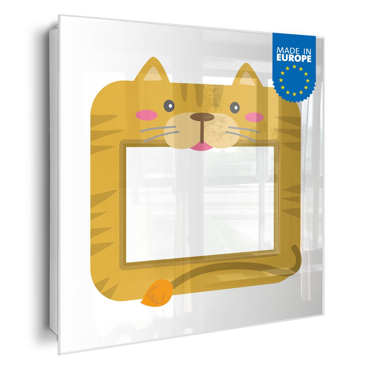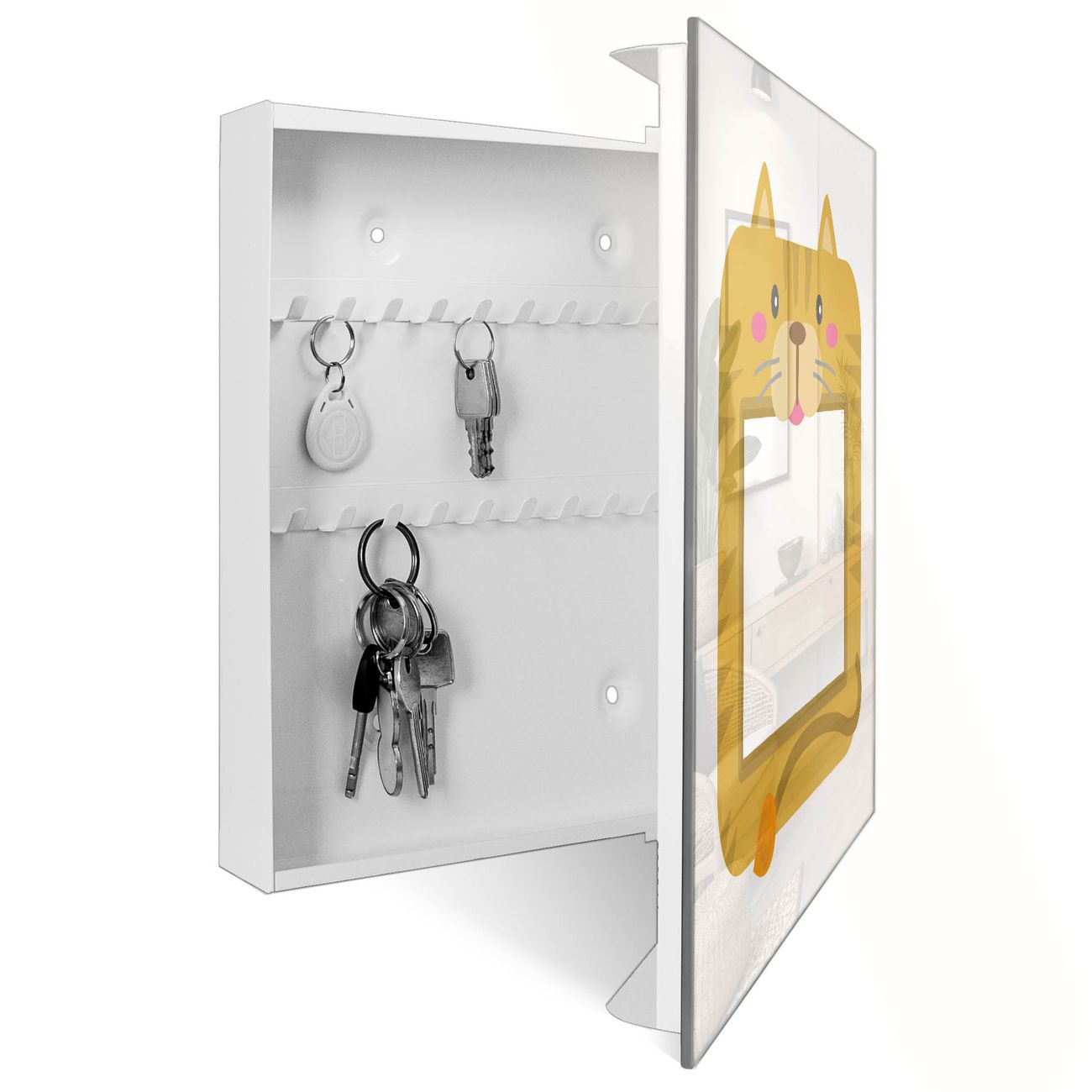 Bringe Ordnung und Eleganz in deinen Eingangsbereich mit dem banjado Schlüsselkasten Motiv Motiv Katzen-Fotorahmen. Die moderne Schlüsselbox kombiniert funktionales Design mit hochwertiger Verarbeitung und wird so zu einem echten Hingucker in Flur, Büro oder Ferienwohnung. ✅ Stilvolle Schlüsselaufbewahrung mit Glasfront im Motiv Motiv Katzen-Fotorahmen Der Design-Schlüsselkasten Motiv Motiv Katzen-Fotorahmen bietet Platz für bis zu 50 Schlüssel, die auf 5 stabilen Reihen mit je 10 Haken übersichtlich verstaut werden. Mit seinen kompakten Maßen von 30 x 30 x 5 cm passt die Schlüsselbox perfekt auch in kleinere Räume. Der weiß lackierte Stahlkorpus mit rechts angeschlagenem Türscharnier harmoniert mit der Glasfront und fügt sich nahtlos in jedes Wohnambiente ein. Ob als Schlüsselorganizer für Zuhause oder als praktische Lösung für Büros, Praxen und Gewerbe, der banjado Schlüsselkasten sorgt für Ordnung und Übersicht. Dank der magnetischen, mit Kreidestiften beschreibbaren Glasfront kannst du Notizen anheften oder Termine direkt auf der Oberfläche festhalten. Die Schlüsselbox Motiv Motiv Katzen-Fotorahmen zur Wandmontage wird inklusive Befestigungsmaterial geliefert und ist schnell angebracht. So hast du deine Schlüssel jederzeit griffbereit und zugleich stilvoll verstaut. Mit diesem banjado Schlüsselkasten Motiv Motiv Katzen-Fotorahmen kombinierst du praktische Aufbewahrung mit stilvollem Wohndesign. Ob privat oder geschäftlich, die Schlüsselbox sorgt für mehr Ordnung, Übersicht und ein wohnliches Ambiente.Vorteile im Überblick