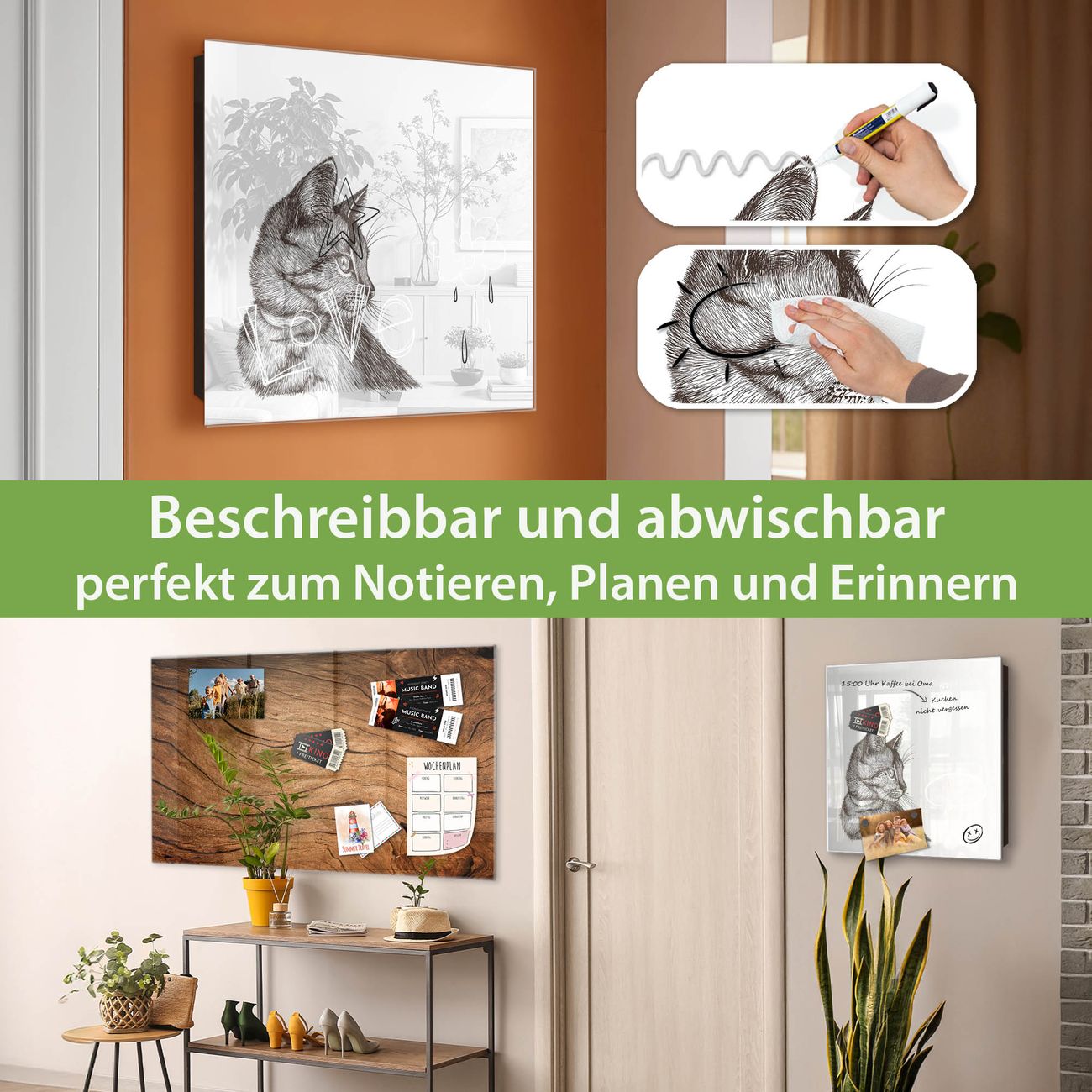 ✅ Magnetisch und mit Kreidestift beschreibbar, gehärtetes Glas, links angeschlagene TürOrdnung und Design in einem