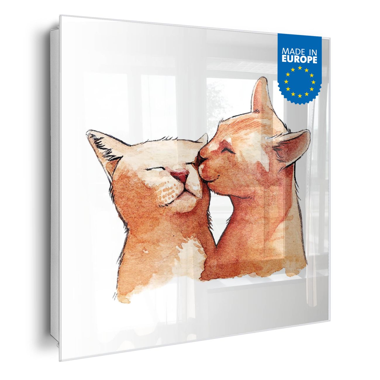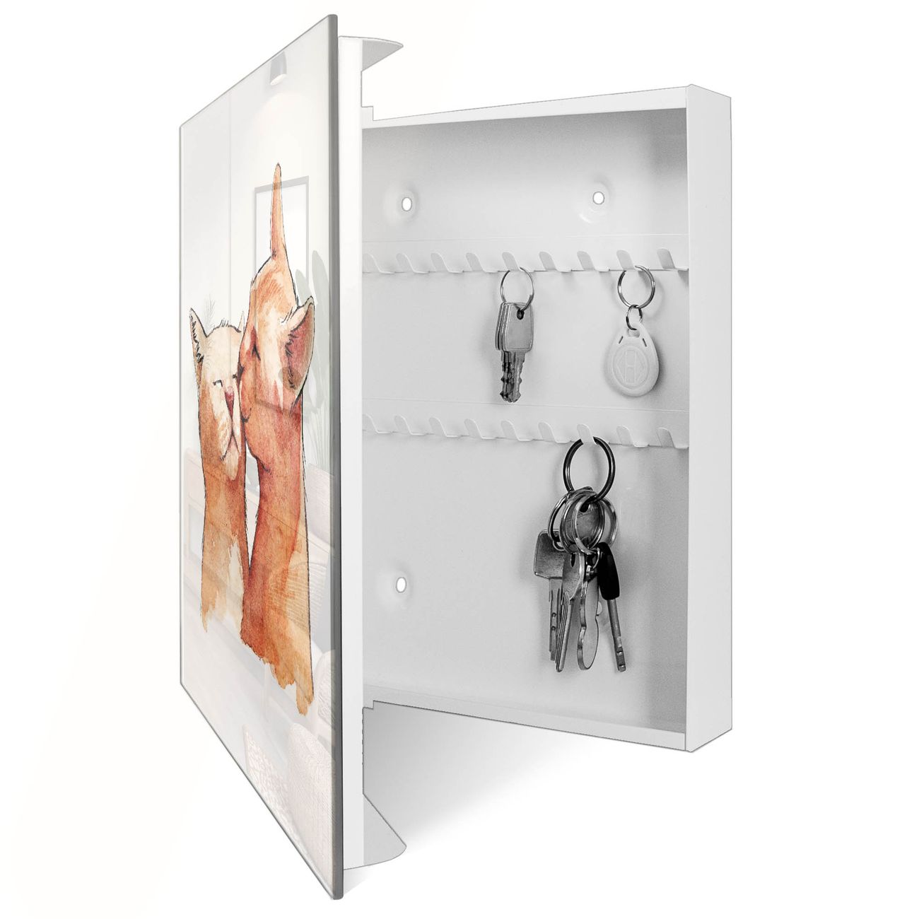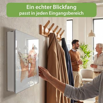 Bringe Ordnung und Eleganz in deinen Eingangsbereich mit dem banjado Schlüsselkasten Motiv Motiv Katzenkuss. Die moderne Schlüsselbox kombiniert funktionales Design mit hochwertiger Verarbeitung und wird so zu einem echten Hingucker in Flur, Büro oder Ferienwohnung. ✅ Stilvolle Schlüsselaufbewahrung mit Glasfront im Motiv Motiv Katzenkuss Der Design-Schlüsselkasten Motiv Motiv Katzenkuss bietet Platz für bis zu 50 Schlüssel, die auf 5 stabilen Reihen mit je 10 Haken übersichtlich verstaut werden. Mit seinen kompakten Maßen von 30 x 30 x 5 cm passt die Schlüsselbox perfekt auch in kleinere Räume. Der weiß lackierte Stahlkorpus mit rechts angeschlagenem Türscharnier harmoniert mit der Glasfront und fügt sich nahtlos in jedes Wohnambiente ein. Ob als Schlüsselorganizer für Zuhause oder als praktische Lösung für Büros, Praxen und Gewerbe, der banjado Schlüsselkasten sorgt für Ordnung und Übersicht. Dank der magnetischen, mit Kreidestiften beschreibbaren Glasfront kannst du Notizen anheften oder Termine direkt auf der Oberfläche festhalten. Die Schlüsselbox Motiv Motiv Katzenkuss zur Wandmontage wird inklusive Befestigungsmaterial geliefert und ist schnell angebracht. So hast du deine Schlüssel jederzeit griffbereit und zugleich stilvoll verstaut. Mit diesem banjado Schlüsselkasten Motiv Motiv Katzenkuss kombinierst du praktische Aufbewahrung mit stilvollem Wohndesign. Ob privat oder geschäftlich, die Schlüsselbox sorgt für mehr Ordnung, Übersicht und ein wohnliches Ambiente.Vorteile im Überblick